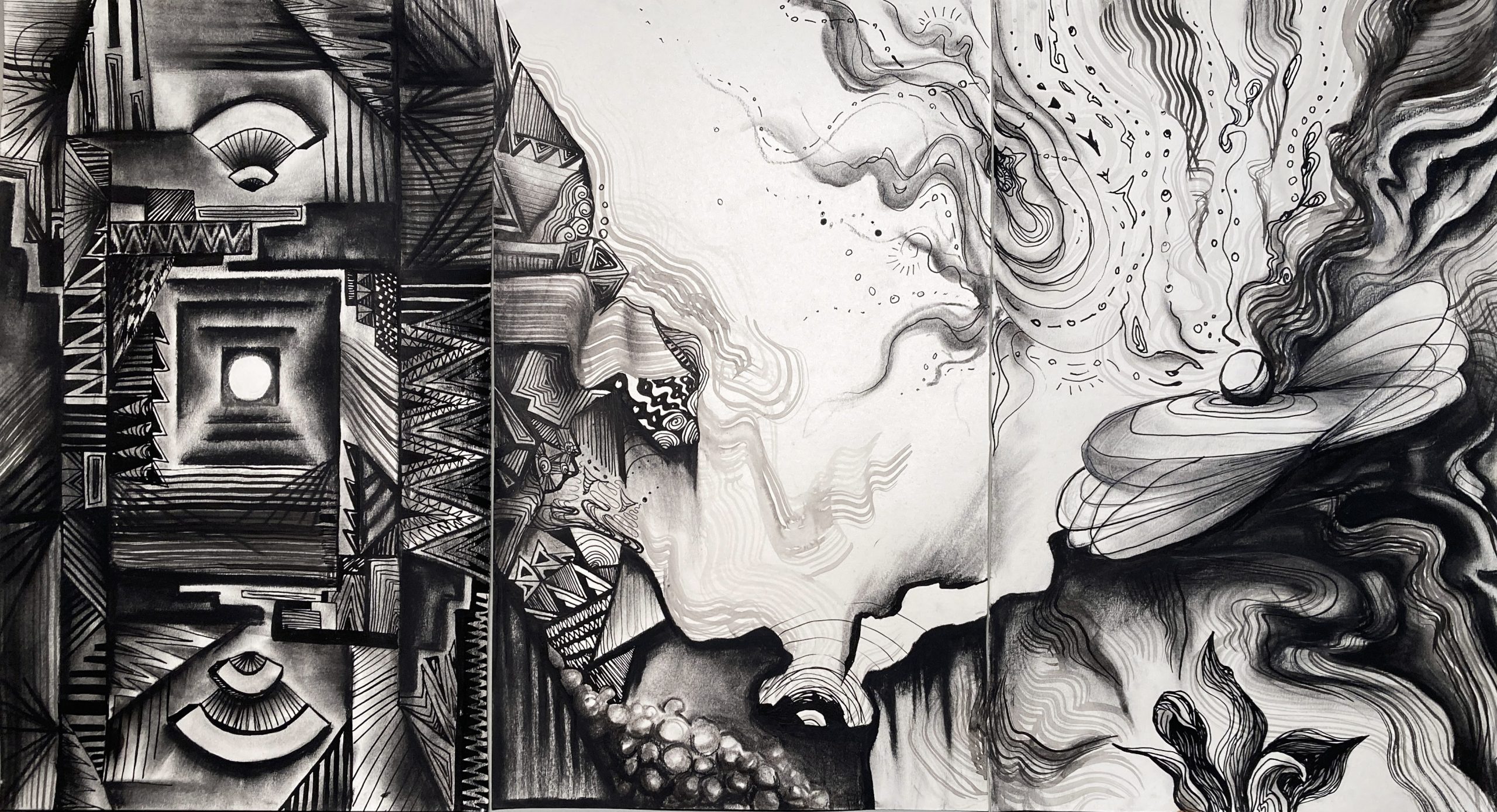 For my pieces I wanted to explore the contrast and interaction between the feelings of being conned and released. For transforming this piece into a triptych I wanted to explore how the two emotions could transition. I wanted to carry some of the geometric elements and darker values over but also experiment with negative space and lighter more uid linework to carry over the feelings from released. The center panel really transformed the pieces from two opposites to a more uid representation of the changes happening throughout life. I feel it adds so much to the piece because it further develops the concept by showing how the change can be subtle but also a substantial shift. I think having a place that not only represents moving from conned to released but also having elements of each in the same panel helps further explore the concepts. I’ve had times where I felt conned but had outlets within that where I could feel released so I feel having a place where the two emotions are interacting is important. I chose the emotions because I felt they resonated with me most at this time in my life. The city has opened me up so much and I feel I have boundless room to grow. I have never felt so humbled, grounded, and inspired to be somewhere and I look forward to continuing to explore my time without connes.