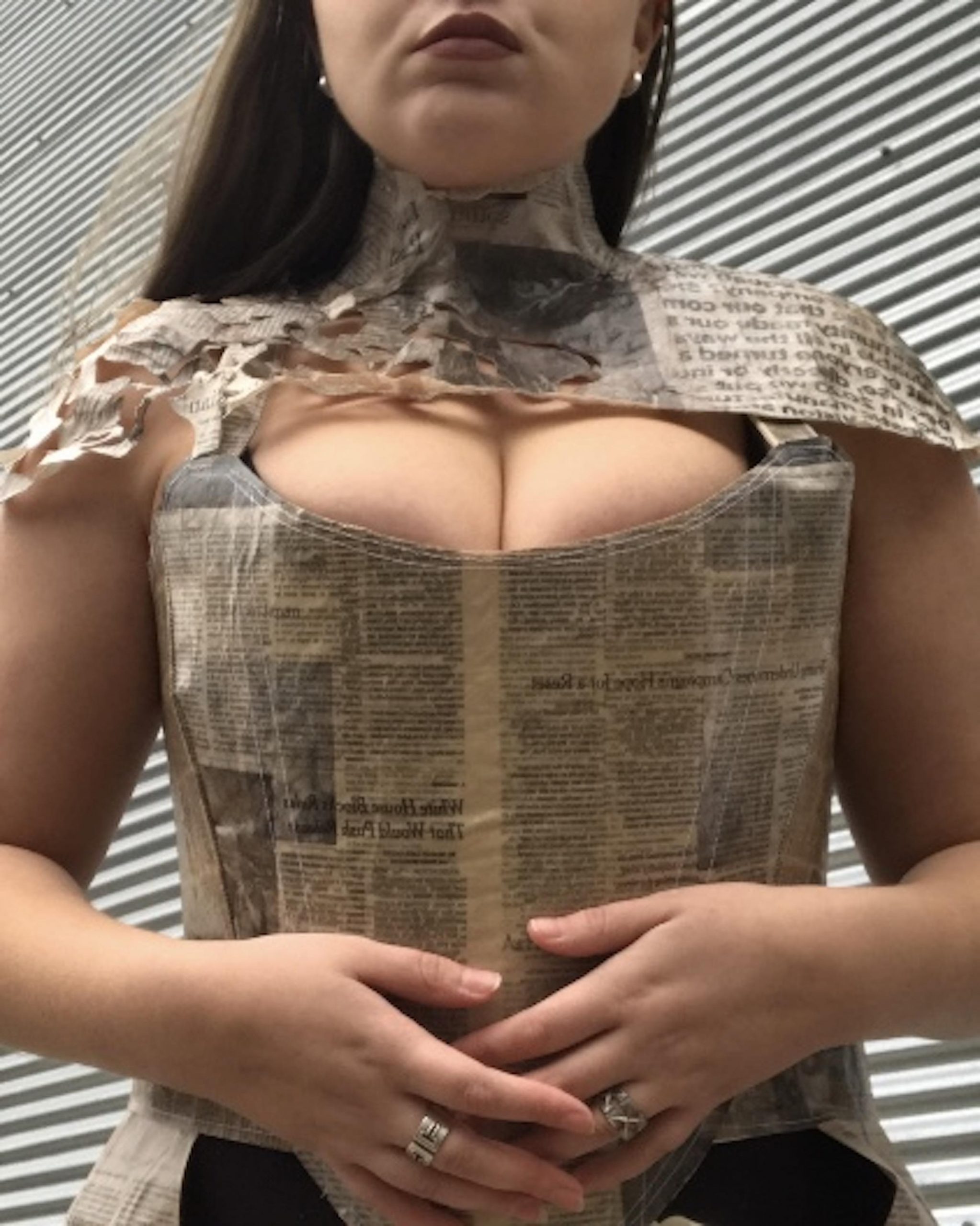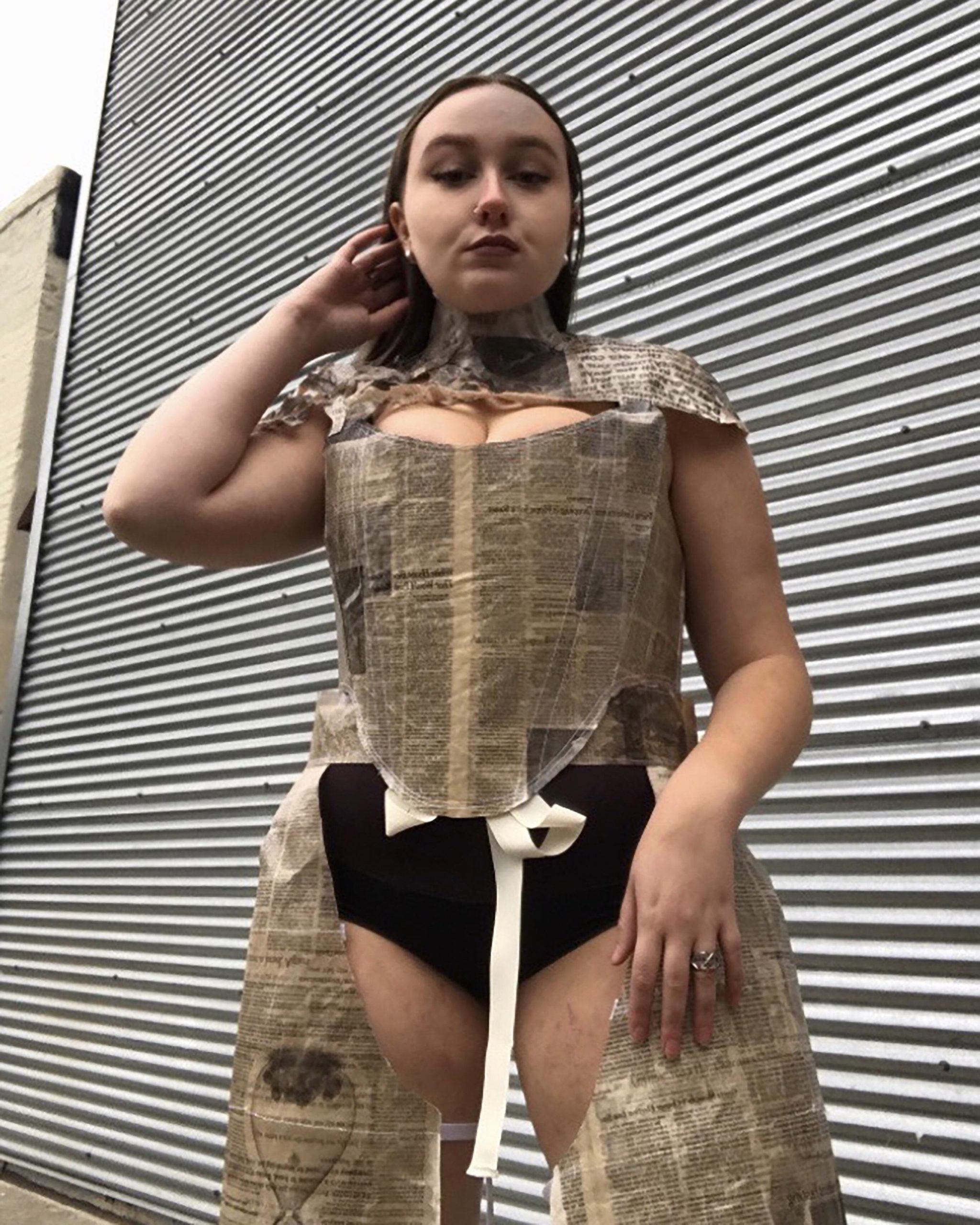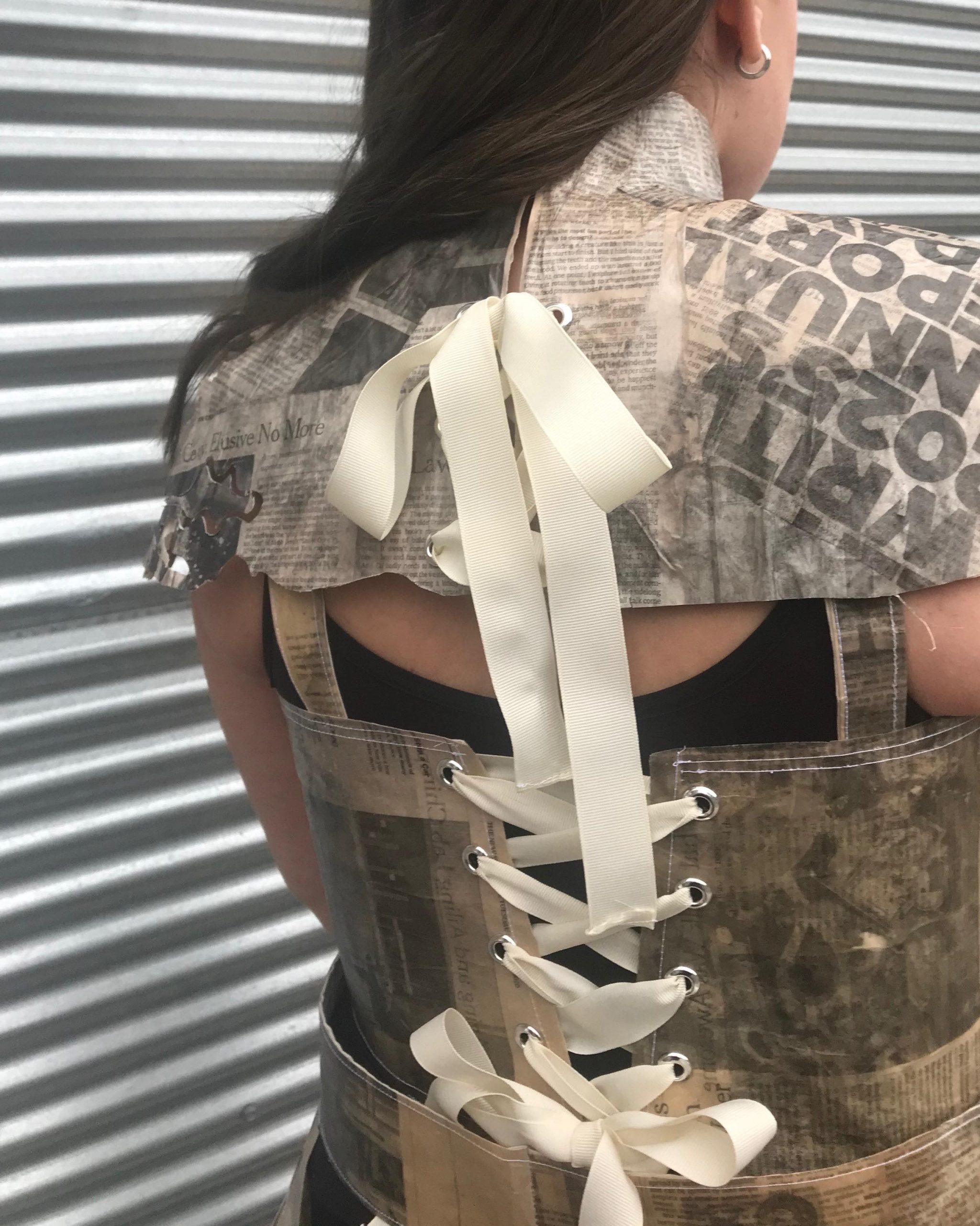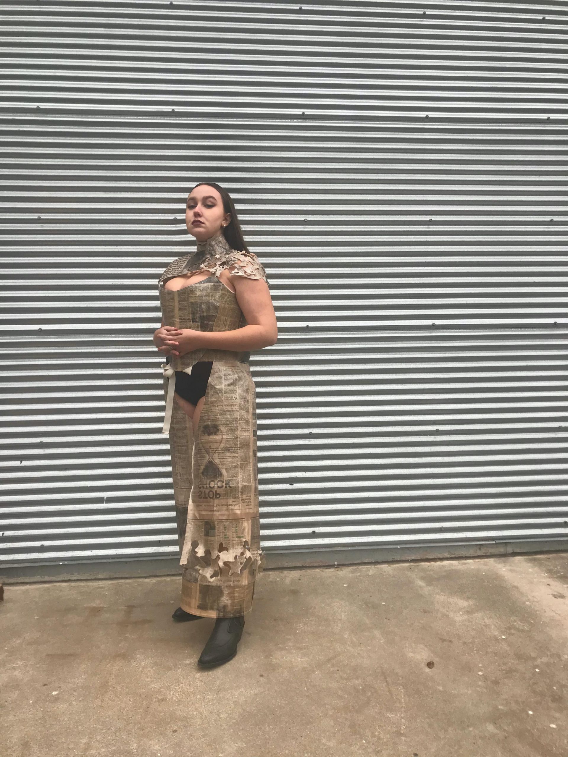 The assignment was to design a costume from found materials for a superhero either originally conceptualized for this assignment, or redesign a costume for a character already in existence. For my design, Inspired by mutant characters from the X-men universe, I conceptualized a character who has the power to manipulate media with her mind, who also has mutating paper skin. For my base found material, I used newspaper to allude to her power and skin changing ability. Creatively, I knew it would be challenging and interesting to work with, while also conveying my characters powers. I coated the newspaper in polyurethane to create a more skin-like sheen and to make the material more structurally durable. I used boning to create extra structure in the bustier and the chaps. The neckpiece, bustier, and chaps are all fastened by a lace-up attachment set in place by grommets. In the Chaps and the neckpiece, I included abstract cutouts to allude to her changing skin to paper. Overall, with the three pieces together I wanted to convey her ability, her strength, and her mutation.