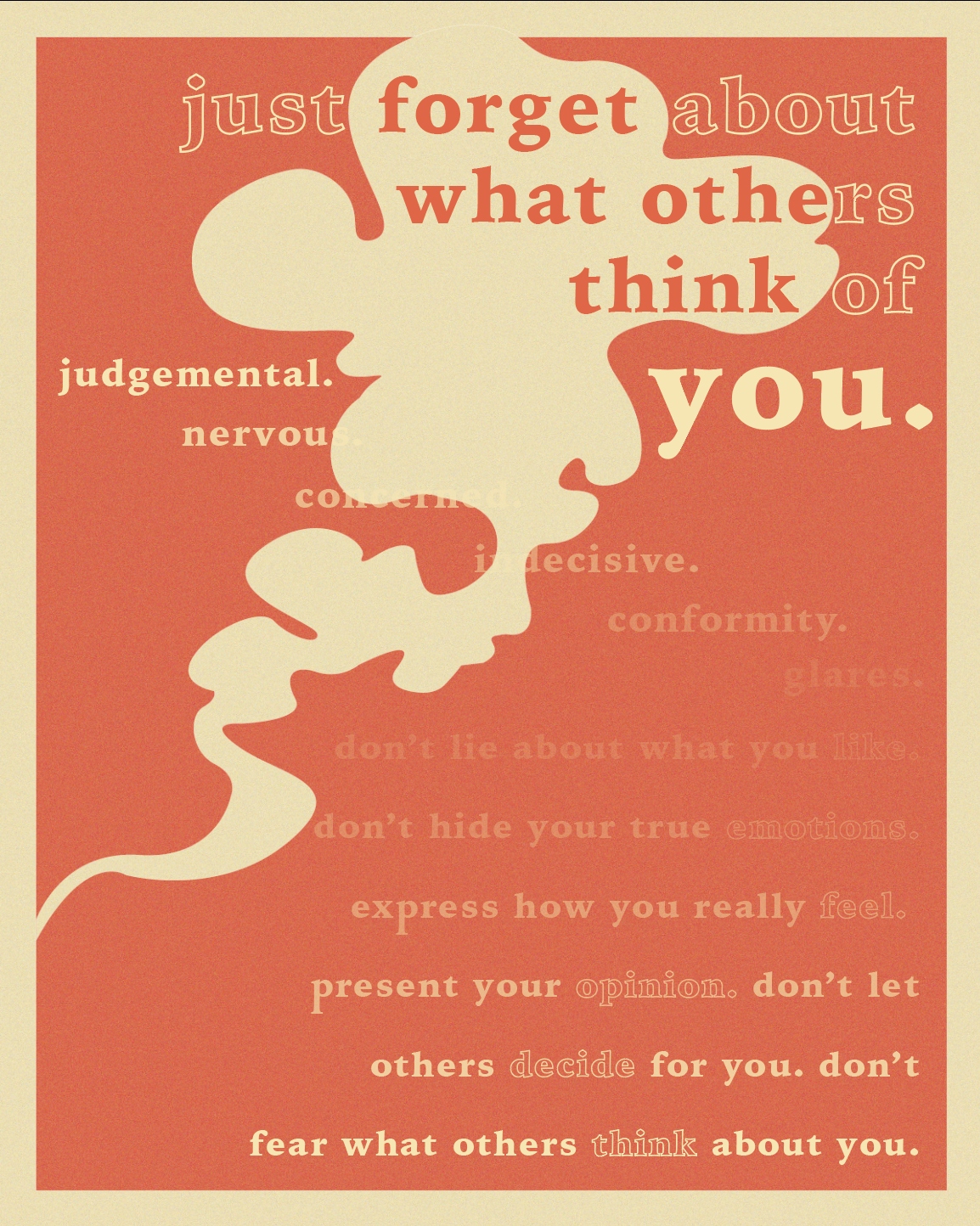 This final project allowed us to present our very own idea or declaration, and so I wanted to work upon the idea of not caring about what others think about ourselves. The main phrase “just forget about what others think about you” is the central message of my personal manifesto, and the smoke-like shape refers to the instant imagery of what I thought the act of forgetting would look like.