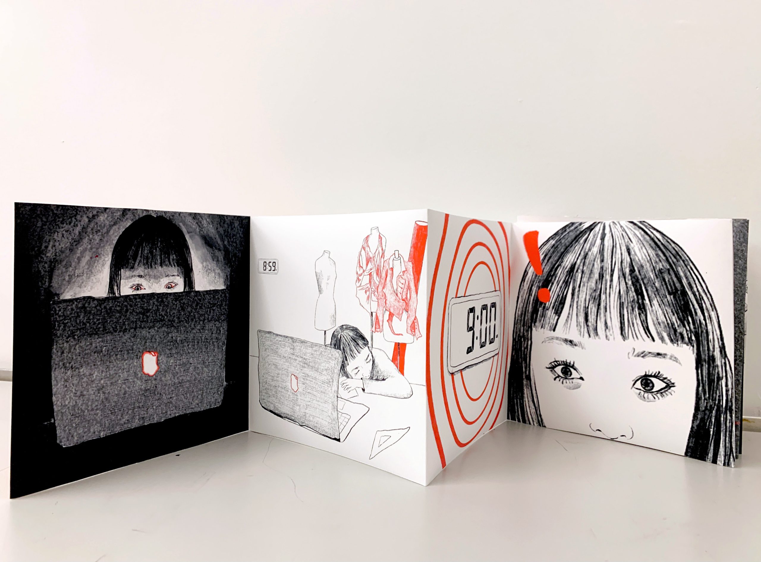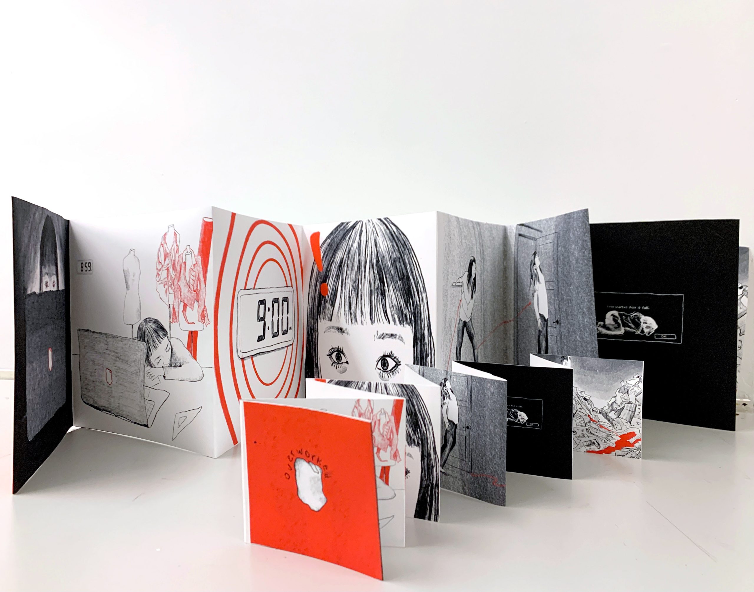 I made an accordion book about creatives being overworked in an industry. This idea stems from a concern that remains in the back of my mind. The middle scene (pages 6-8) depicts the subject running to get to where she needs to be. She gets caught by her charger and becomes unplugged. She crashes and then wakes up in a land ll surrounded by her own creations, becoming expendable just like them. Thus, she is “Overworked” creating objects that are “Overworking” the environment.