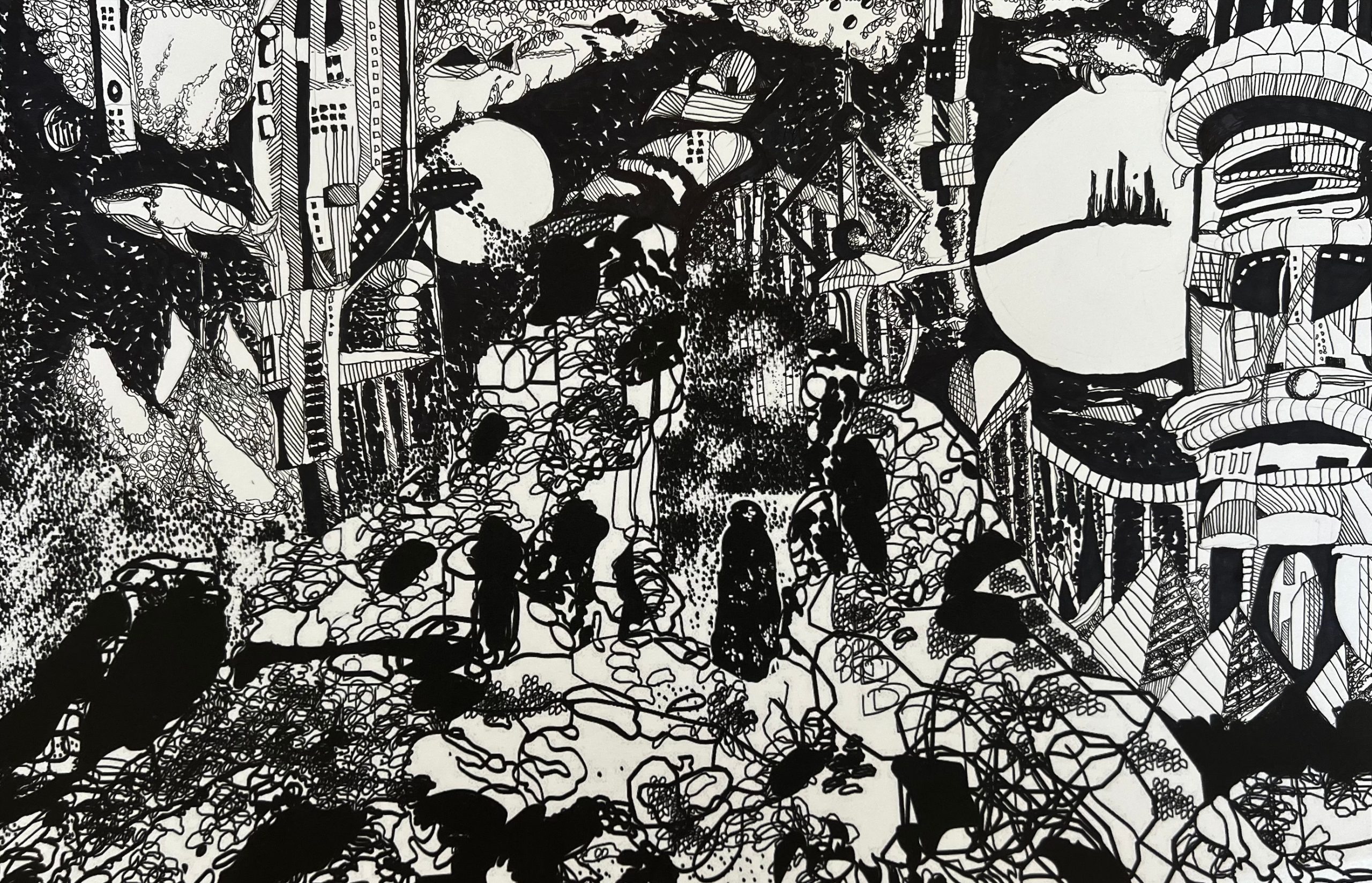 I chose the rockscape of Al Ula, I depicted it as it is in the digital part and the drew it as if it had progressed into an advanced civilisation for the traditional section of the piece. I did this to show the effects of human civilization and how we impact the environment around us.
