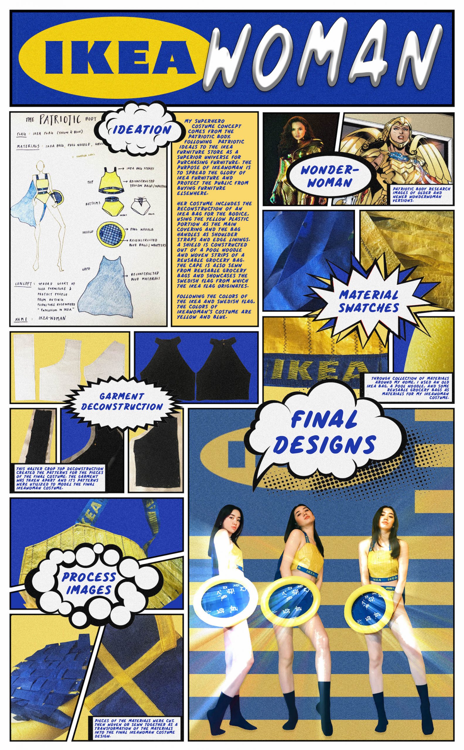 My superhero costume concept comes from the patriotic body, following patriotic ideals to the Ikea furniture store as a superior universe for purchasing furniture. The purpose of IkeaWoman is to spread the glory of Ikea furniture and protect the public from buying furniture elsewhere.