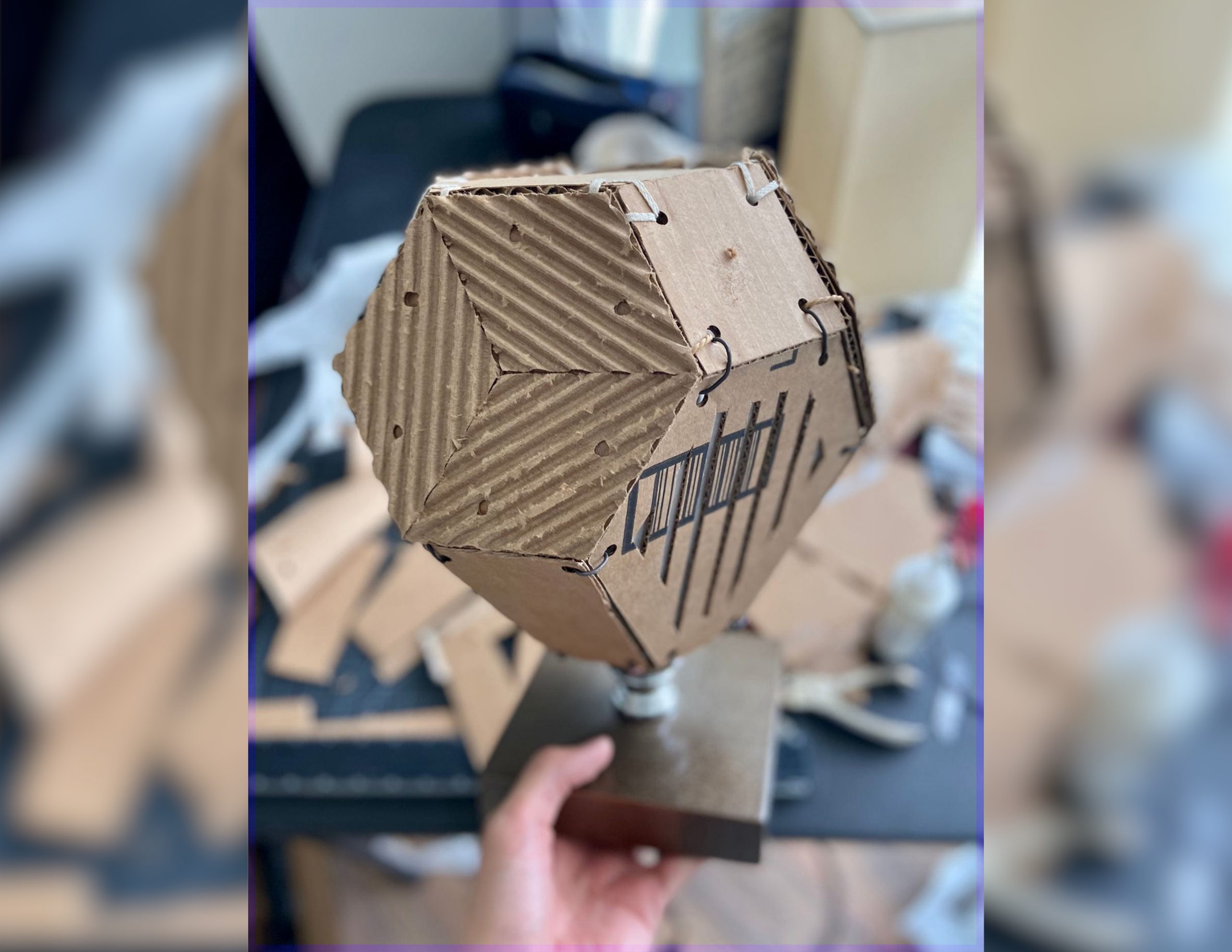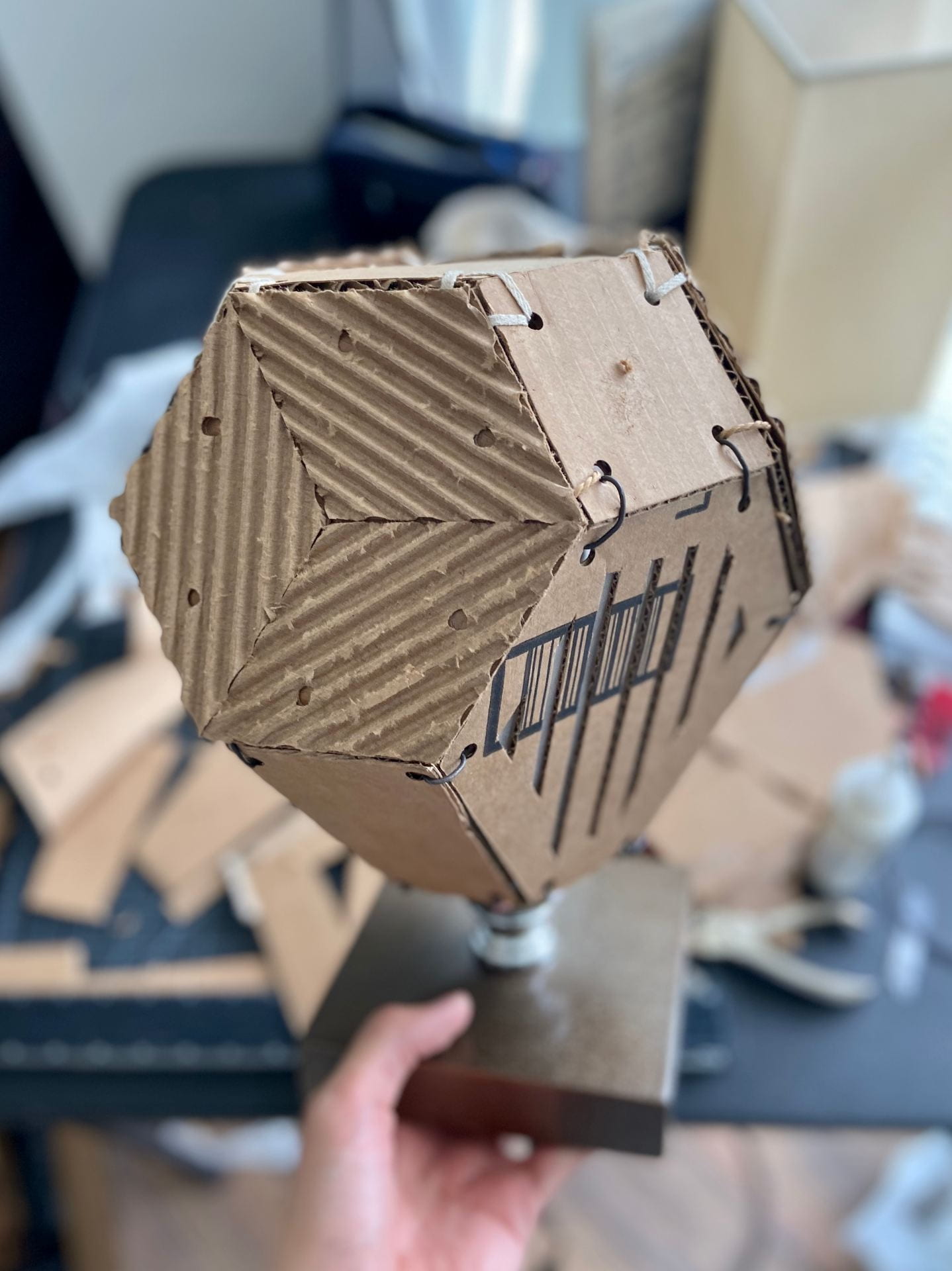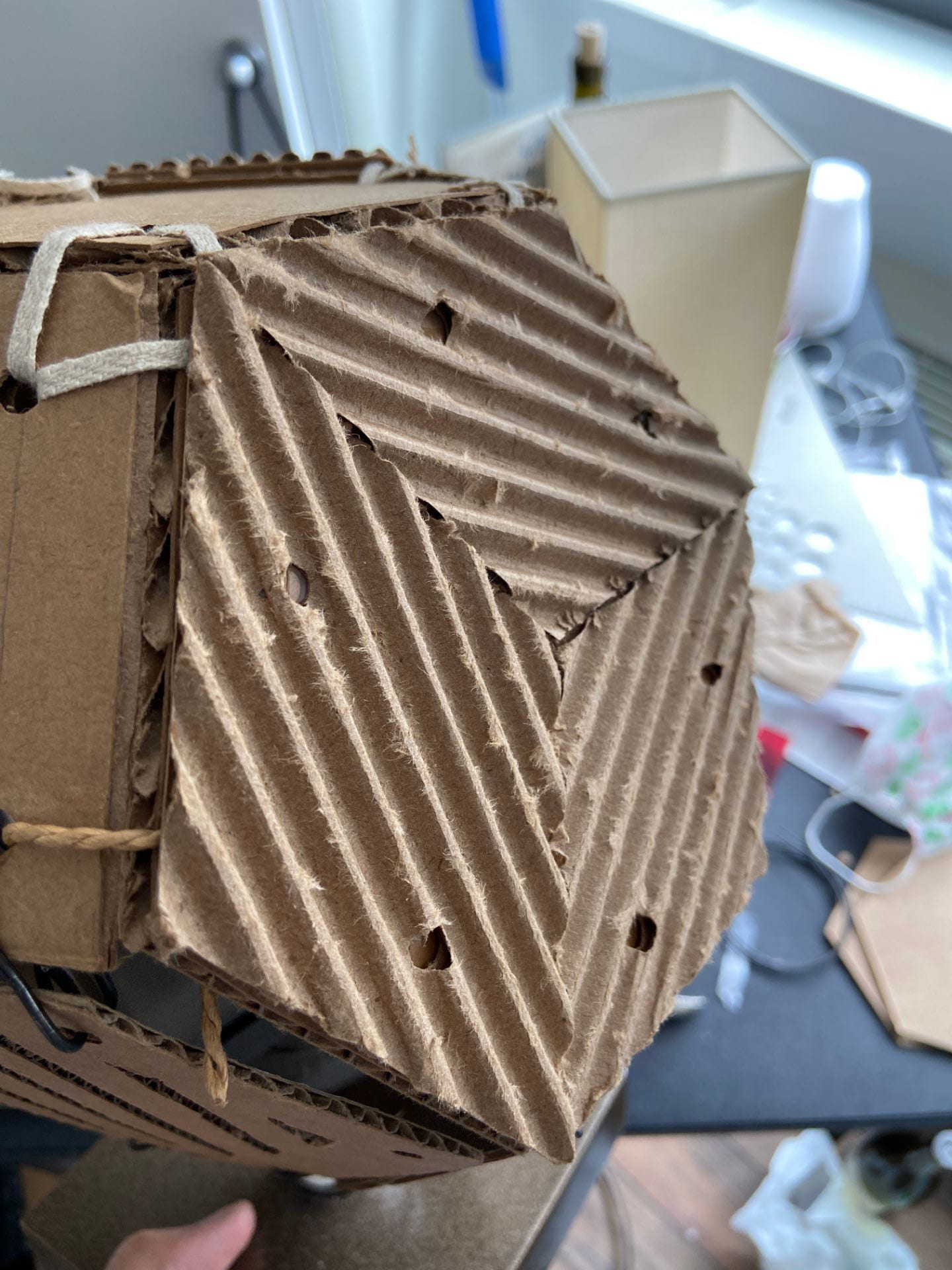 My intension of this project was to expand on an idea: “Curiosity killed the cat.” The global pandemic of the COVID-19 seems to suggest that people always try to open up Pandora’s Box which brings not only hope but also trouble. But it is also the burning curiosity to the unknown of human beings that lead us to the future. This project was designed for woodwork. Since we have been quarantined at home, I decided to use cardboard from mailing or shipping to finish it for its accessible yet malleable. Then I came up with the idea of using my lamp as a base. The light is 60V so it may light up the material. So I used a LED light that I own for photography instead. There is a lighting mode called “thunder”, that would work great to use as a metaphor for the virus or any kind of trouble. Also, I peeled off one side of the cardboard and cut them into three parts to make the interesting shading of each polyhedron surface. Instead of making a box, I elongated the shape of the original Truncated Octahedron into a “bulb” shape. Before closing the whole shape, I made a secret door that can be opened to change lightings. For connecting the whole structure of the polyhedron, I punched holes and used shoelaces to create new shapes out of each surface. After finishing up, the effect comes with the LED light works well. It seems to have an actual storm inside the lamp.