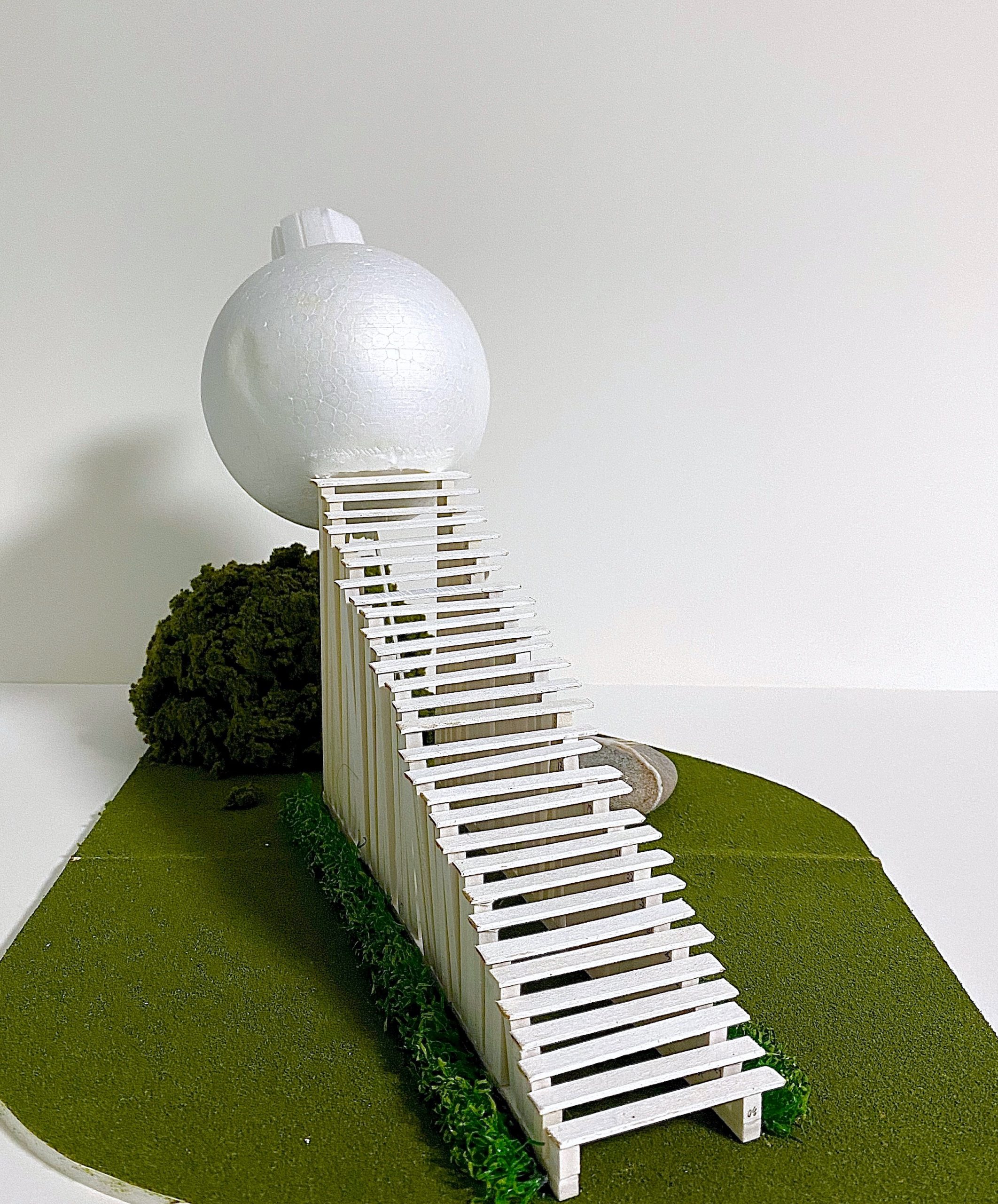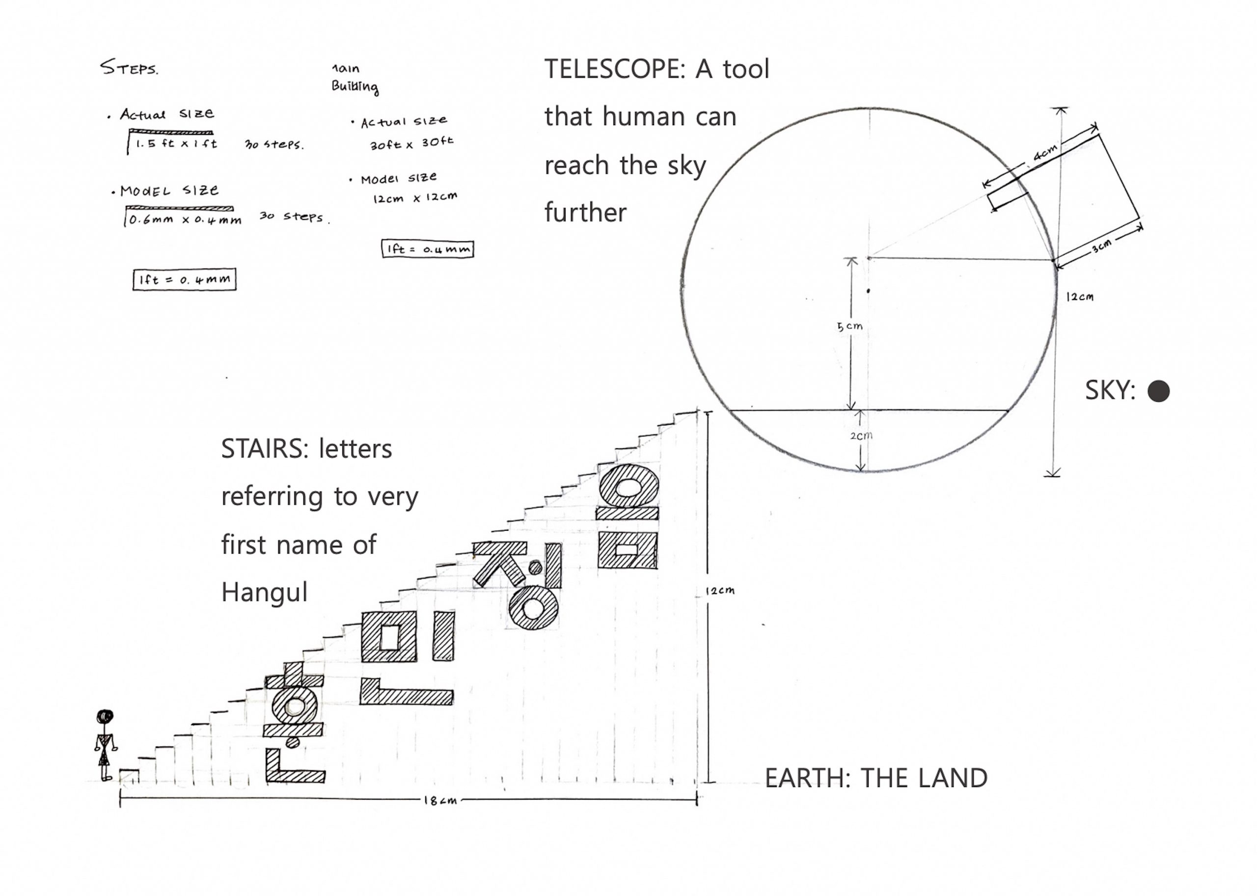 This is a project building a memorial park where people can commemorate the invention of Hangul(Korean alphabetical system). When I first got this assignment, I immediately came up with this topic because I used to think that Korean people sometimes don’t appreciate much about having an independent writing system. So, I thought it would be good if I build a place where everyone can visit and celebrate the invention of Hangul. The design is based on the principles of Hangul (sky, human, and earth). Mainly, the building is a shape of a sphere representing the sky. There are the staircases with the letters “훈민정음” (ancient name of Hangul) connecting humans and the building which is the sky in context. Lastly, the building, human, and Hangul all lie down on the earth. I focused on those three elements to make the artwork meaningful, not only to make it function.