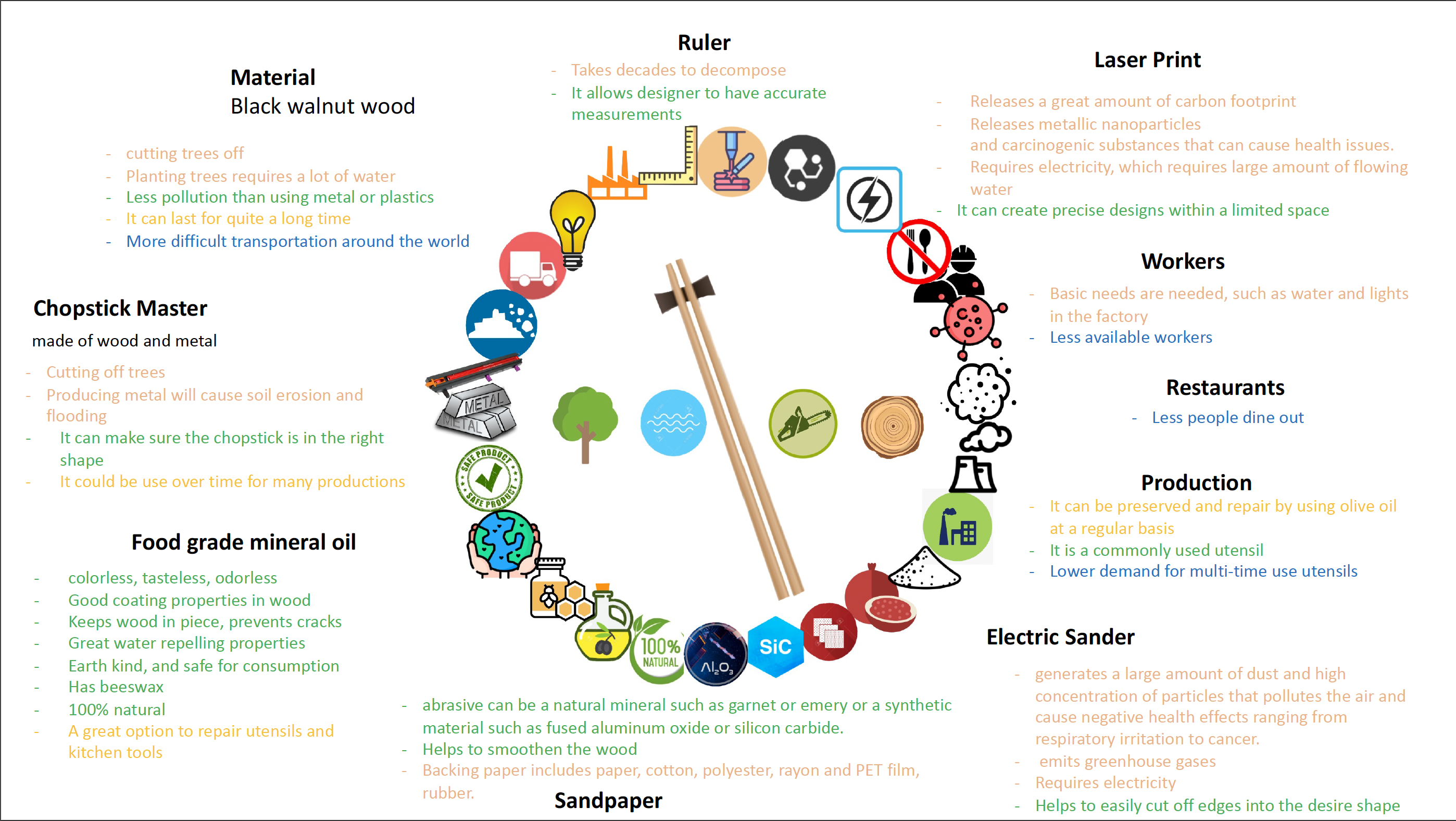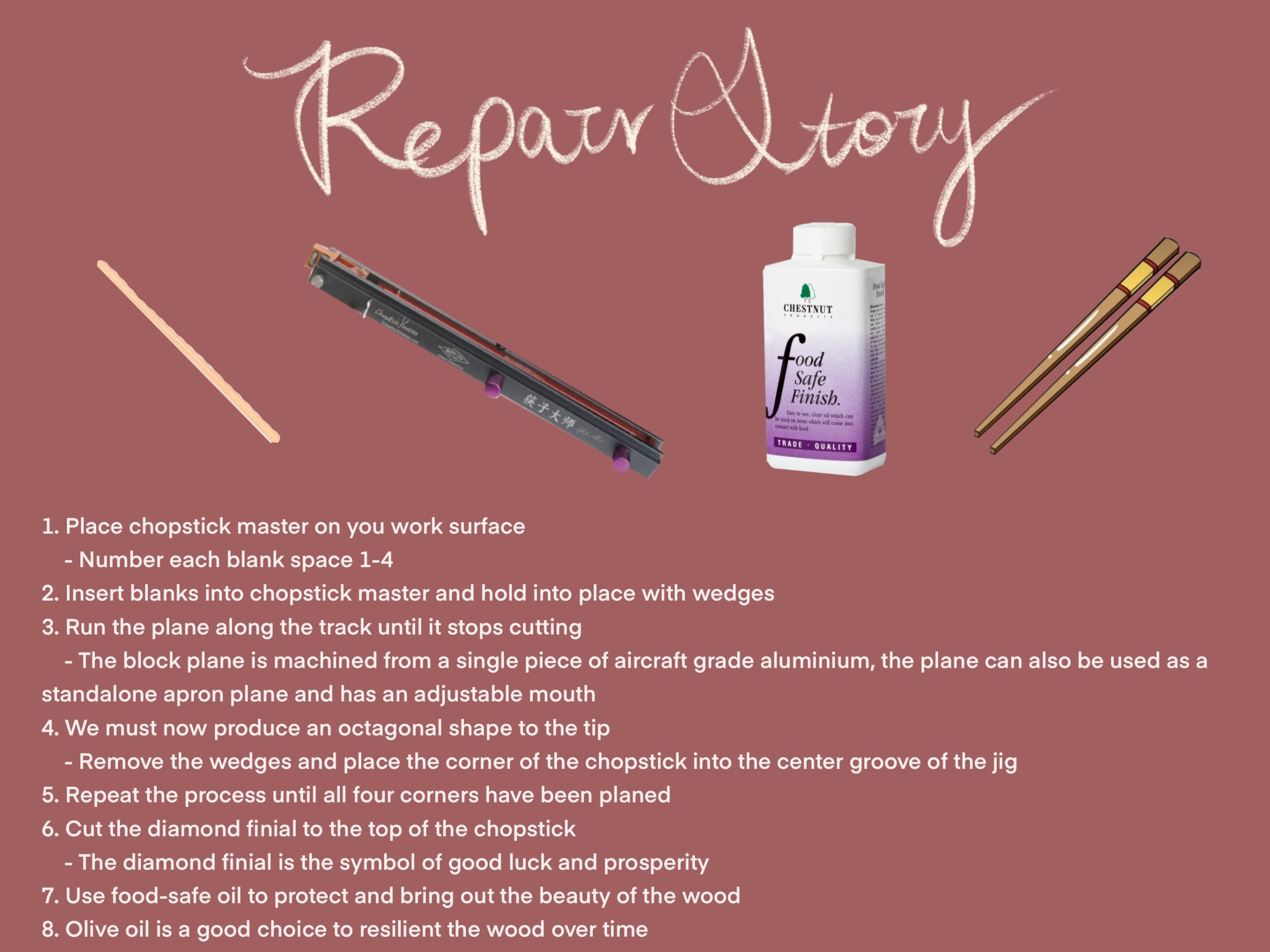 My initial thought for this assignment is to make something based on my culture. Chopsticks is a tool my family and I will use everyday, and it is a good representation of my culture, therefore I was quickly inspired by the pair of chopsticks I was holding in my hand. I chose to make my pair of chopsticks out of wood because I think wood is more sustainable than other common materials, such as metal and plastic. Wood is more repairable in the future and more natural. I also created a chopstick finial at the end of the chopstick printing my Chinese name on it implicating “luck”. Though, It is my first time doing woodwork so I don’t have any woodwork tools I can access to. Thus, I found a woodshed where I can make a pair of chopsticks. It was an unique experience, learning how to function the machines and learned to distinguish the types of woods. I chose black walnut wood as my material because I liked the colour better and it has a benefit of improving heart health. Since the prompt of the assignment is to make applying olive oil to the chopsticks on a regular basis. Soaking up the oil will work as water repellant and prevent it from cracking easily. Finally, I hope this resiliency object I made can be inherited to my next generation so that it can be proved to be a Long Life Design.