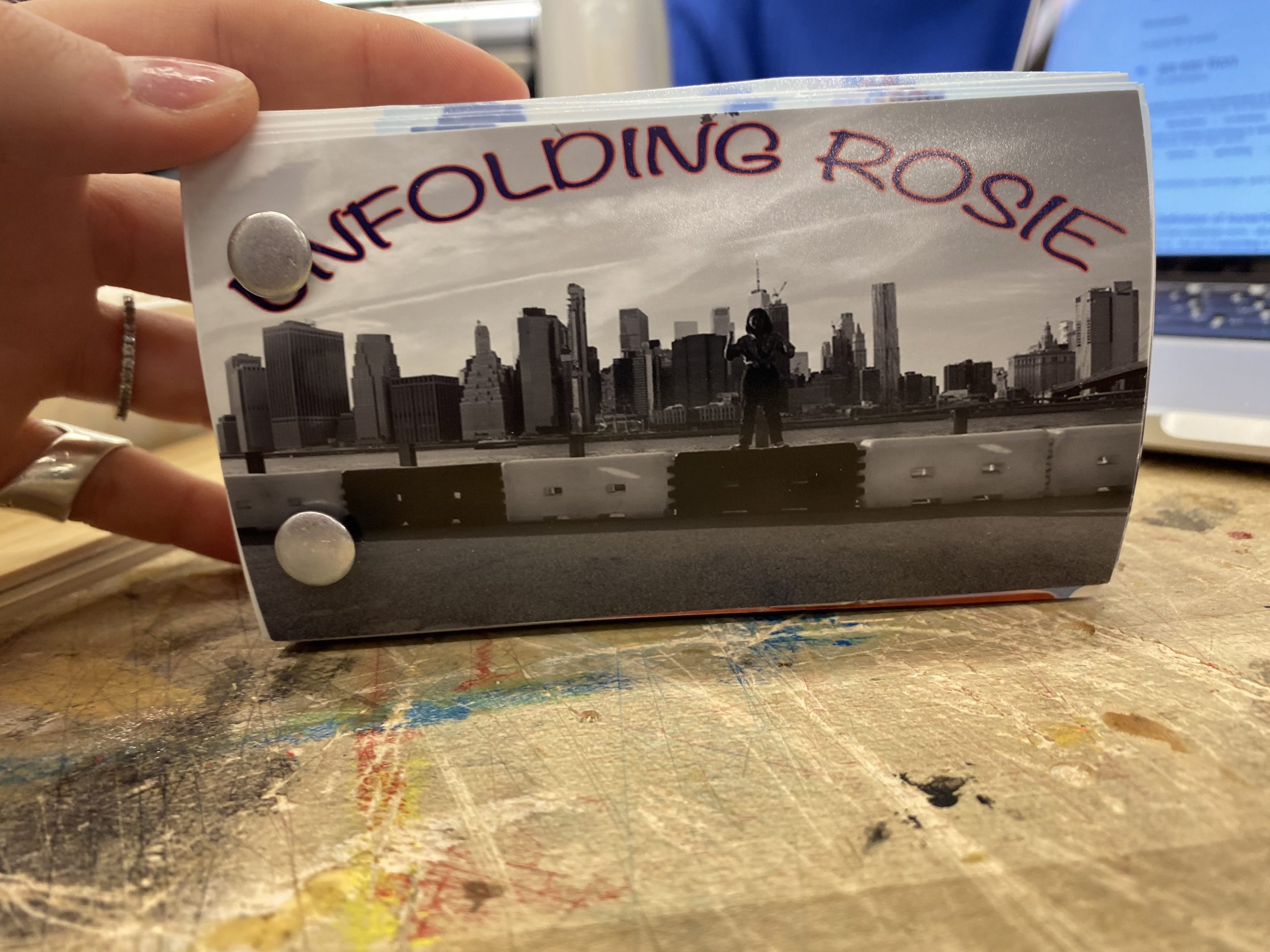 Unfolding Rosie is a flipbook with Rosie, my peer, as the protagonist. Rosie, before moving to New York, had moved with her family to Turkey where she faced many conflicts. However, New York City is the place where she feels more liberated. So, having part of New York’s skyline as the background, and Rosie joyfully unfolding in an animated fashion is how I believe her current state of mind is best described. Finally, all the pictures were processed in Photoshop in the same comical way as this is how her fascinating and very unique appearance is best illustrated.