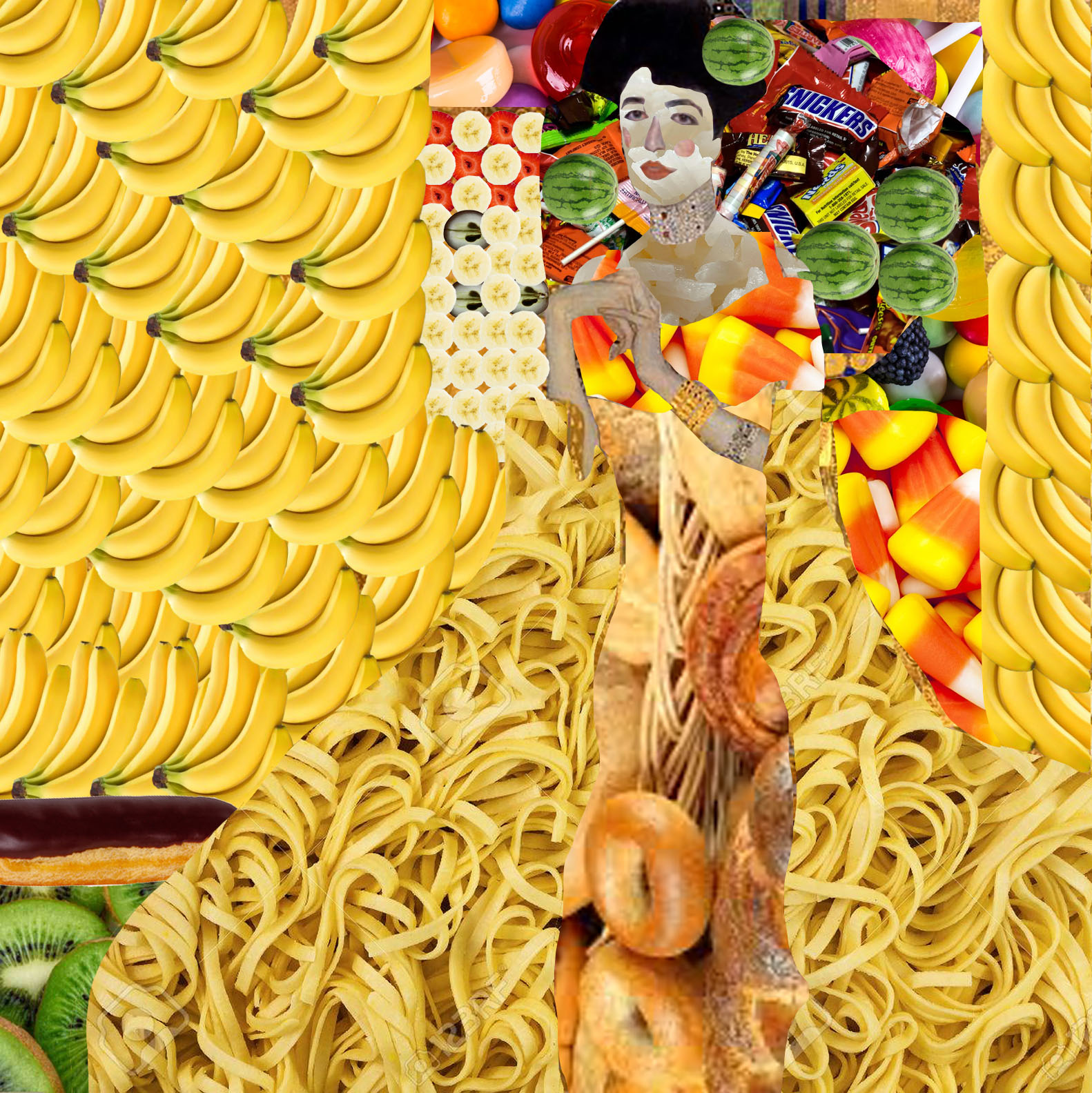 This is a recreation of Gustav Klimt’s “Portrait of Adele Bloch Bauer” made by collaging images of food in Photoshop.