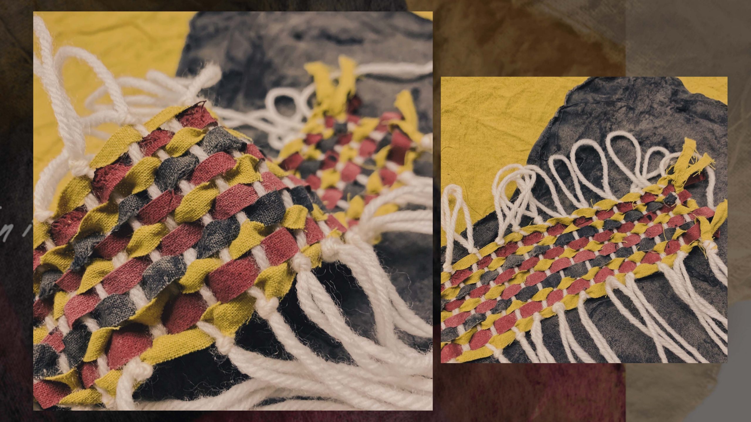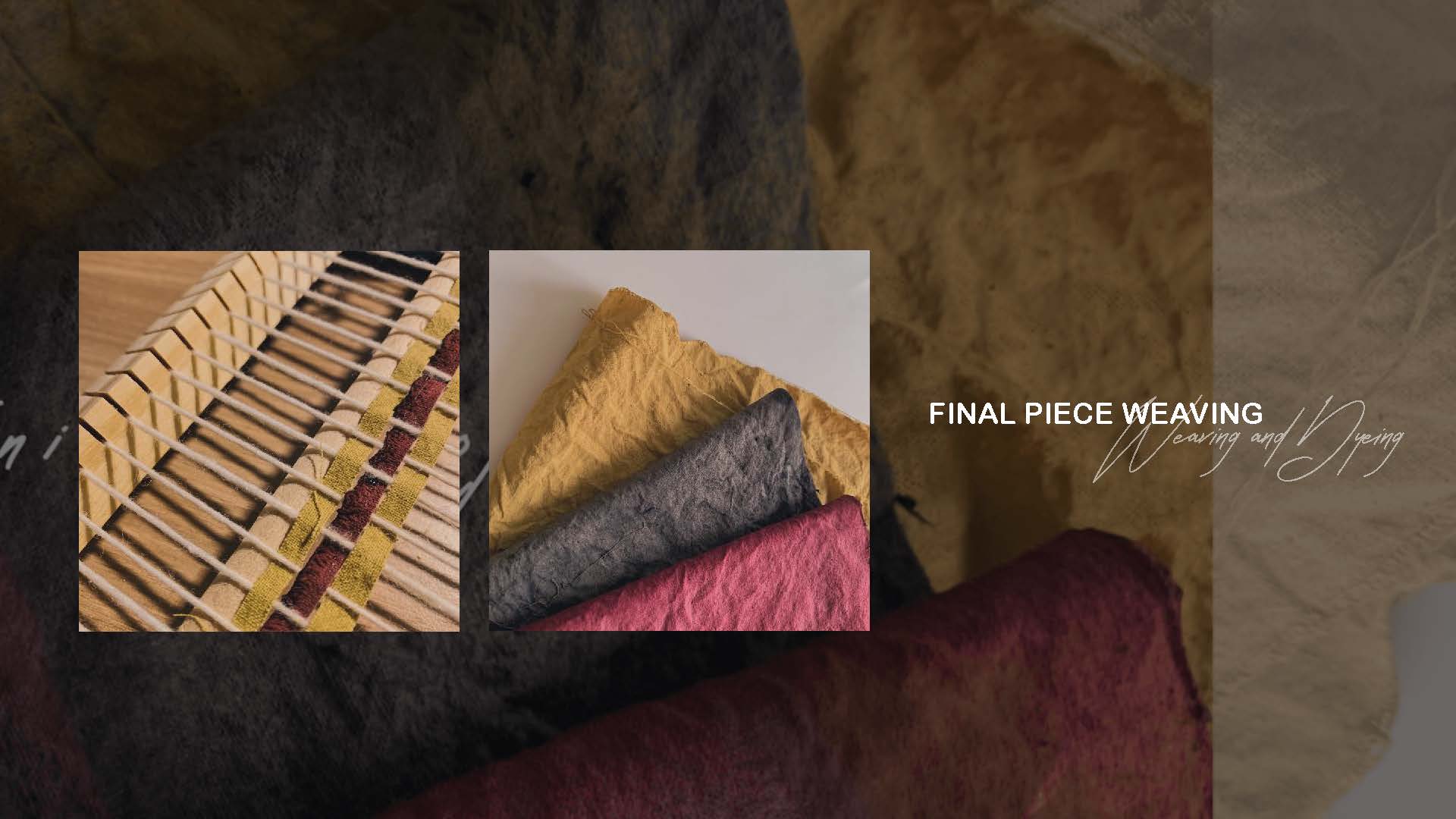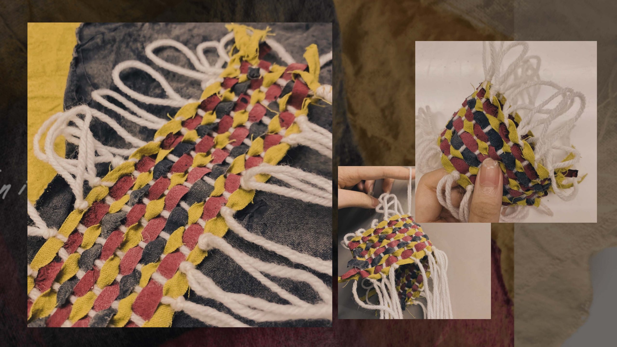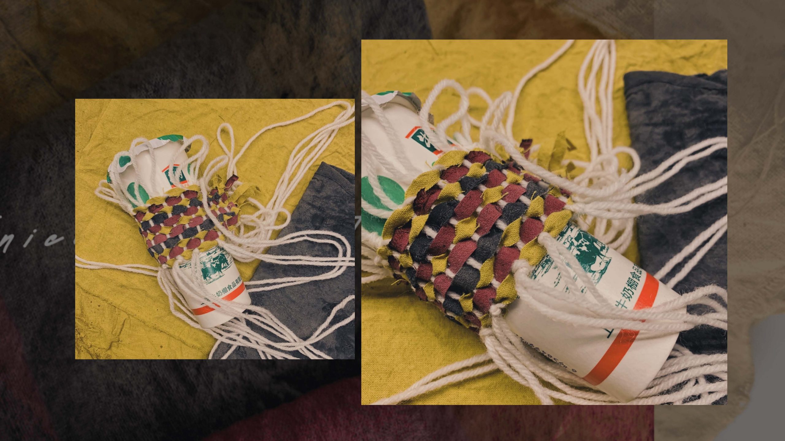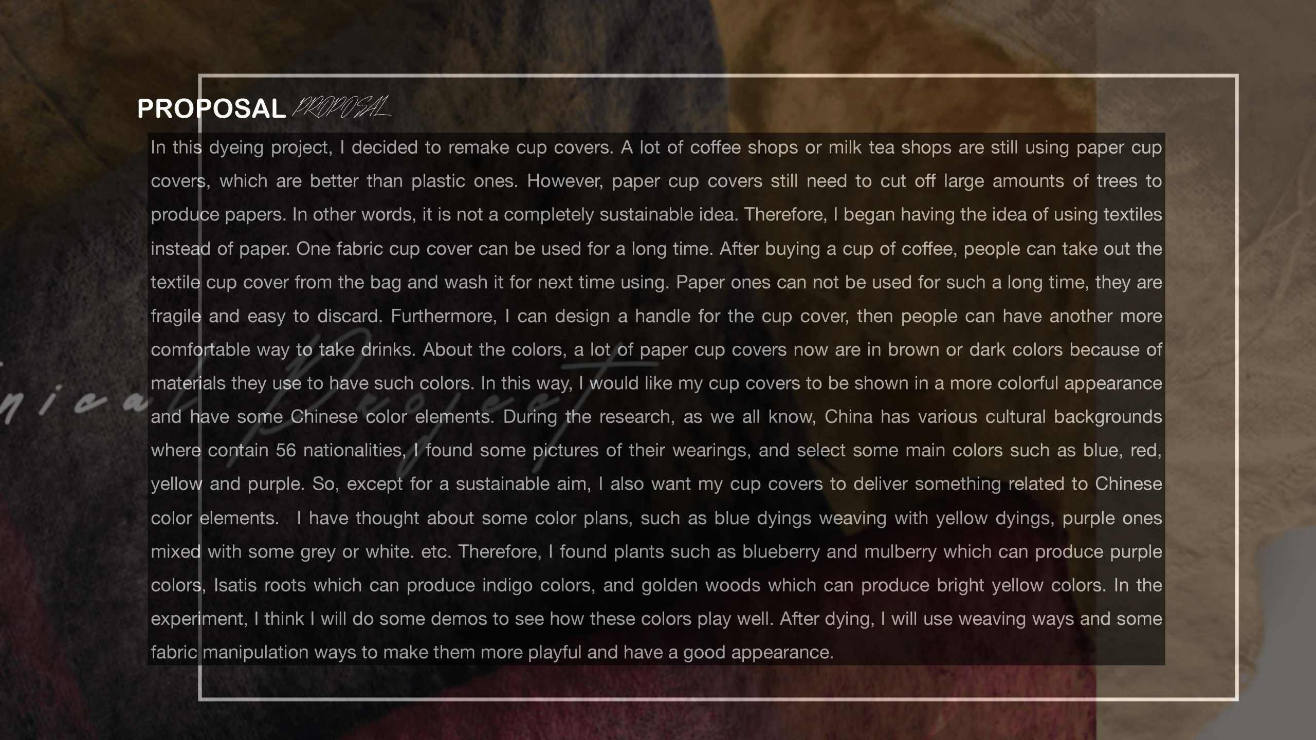 When I think about sustainability, I think everyone can start by doing a small environmental thing to reduce pollution in the world. In this project, we avoid using chemical materials that produce too many pollutions but trying the botanical dying to make some practicable products. In my work, I would like to change paper cup covers into textile cup covers. People can utilize them many times and do not need to throw paper cup covers after they buy each cup of coffee in the shop. For the appearance, I hope it can not only have bright colors that can deliver the mood of happiness to customers but also it can spread Chinese elements from colors visually. Red, yellow, blue, and purple are colors we can always see complex Chinese traditional garments. So I used golden wood, mulberries, blueberries, lotus seeds, and purple cabbage to experiment with colors. Colors have variations by adding different mordants and assists. In my final piece, I chose three colors that t with Chinese feeling the most to be my main color tone. In order to combine these bright colors in one piece well, I tried weaving which is also a traditional technique to make the final cup cover demo out. It is a good chance to learn and explore the connection between nature and arts, to experience the fun of dying.