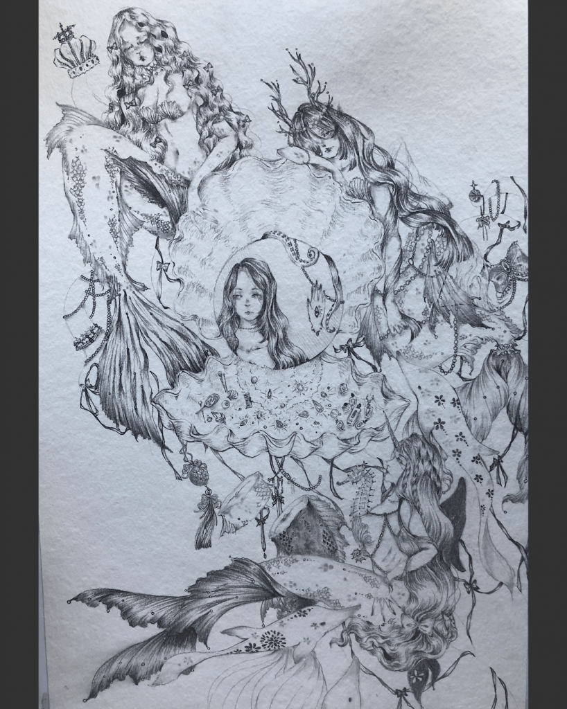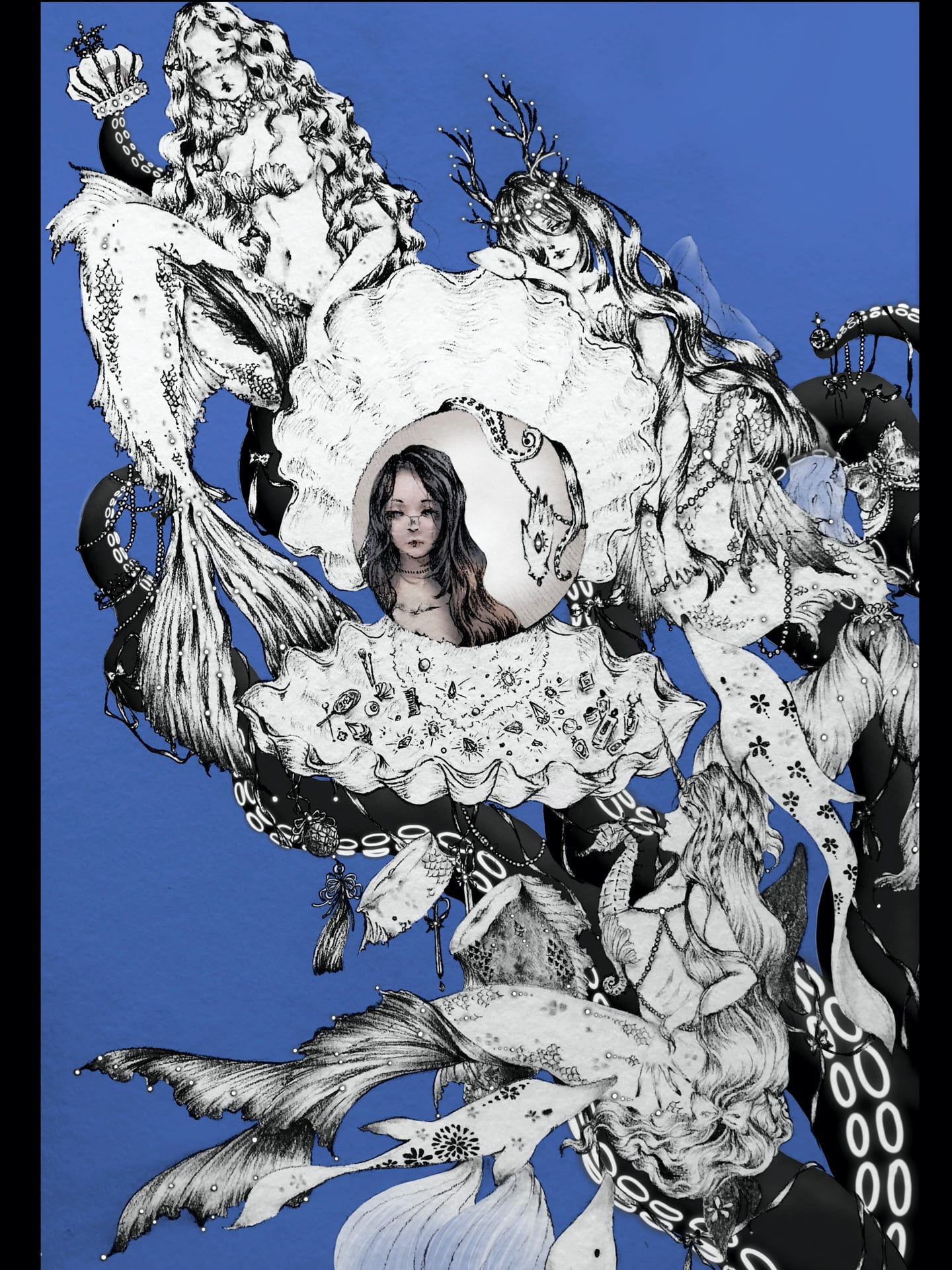 This creation is centered around a self-portrait and some information that is relevant to me. I chose the ocean as the main theme and added some of my favorite details. Like fantasy creatures mermaids, dolphins, seahorses. All kinds of jewelry, small bottles of perfume, some Chinese decorations. Large seashells, pearls, seashells. The tentacles of an octopus, antlers, horns of a unicorn. While some hard conditions don’t support my study of jewelry and accessories, I have a passion for these unique minerals. Several of the perfume bottles on the right side of the shell are very recognizable by their brand, and often it’s not the smell of the perfume that draws me in, but the name and packaging.