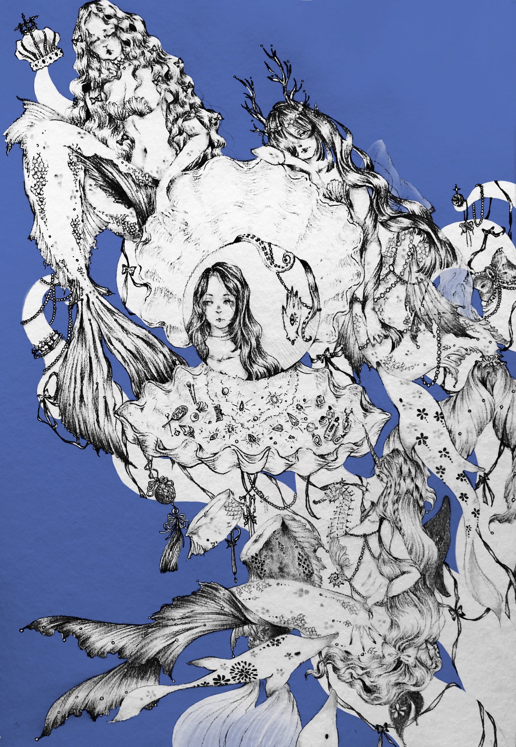 Except for the middle self-portrait, which I combined with my hand-drawn and my self-portrait image, I hand-drew the rest of the picture in pencil on paper for watercolor. This piece is very representative of my style of drawing and painting. I like to use color ink or pencil to draw special details, and the treatment of the hair is very much in line with my usual drawing style. Due to some experiences in Chinese schools, my aesthetic of the human body is very different from most people. I have a strong preference for slender limbs and non-human organs or torsos.