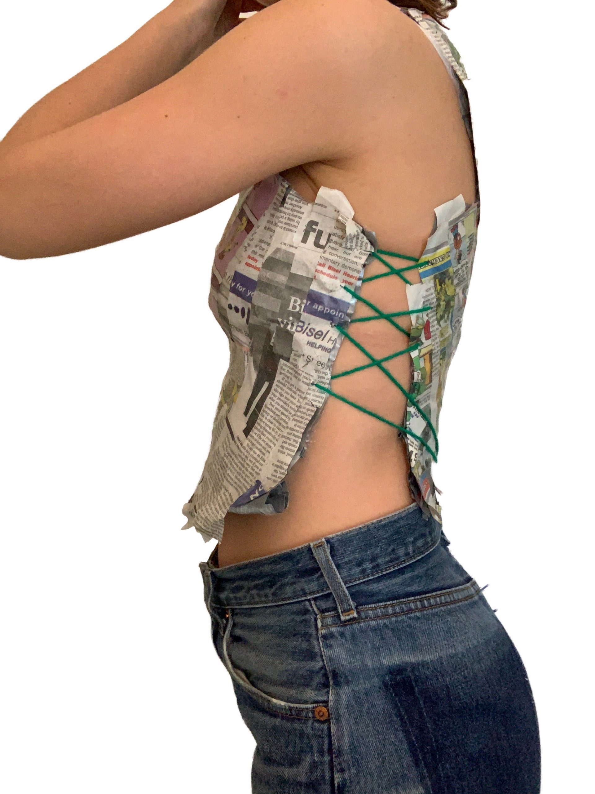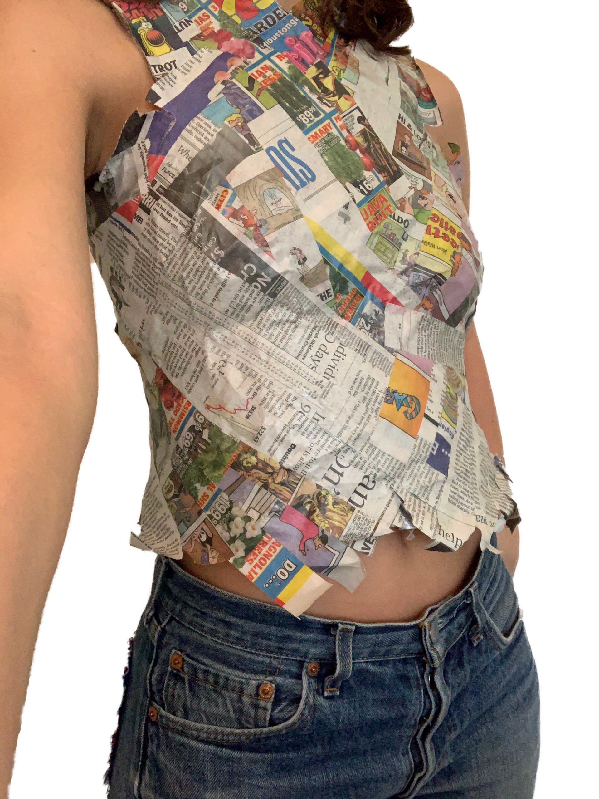 For my meaningful object, I chose to remake a knit sweater out of newspaper. Given the circumstances and materials available, I wanted to create a complete opposite of the materiality and feel of yarn. The piece was to challenge the way I used my object, what would happen if it became stiff. I created a mold using myself and duct tape, which I then covered in newspaper. I used newspaper that I bought at a gas station in Houston. The piece shows the different articles written about the coronavirus,and its interesting to read various snippets of information about things that were happening in the world.