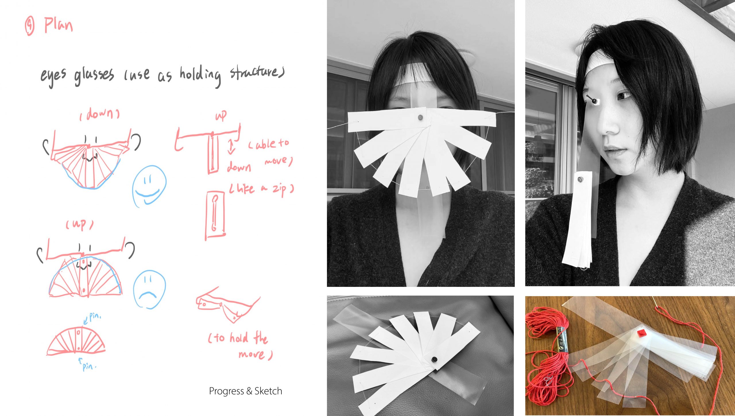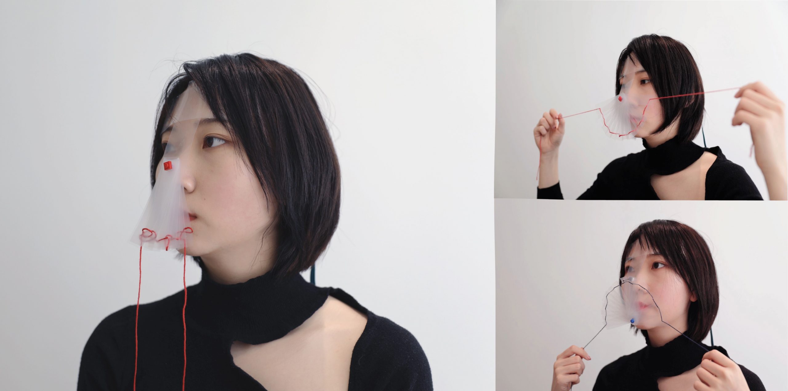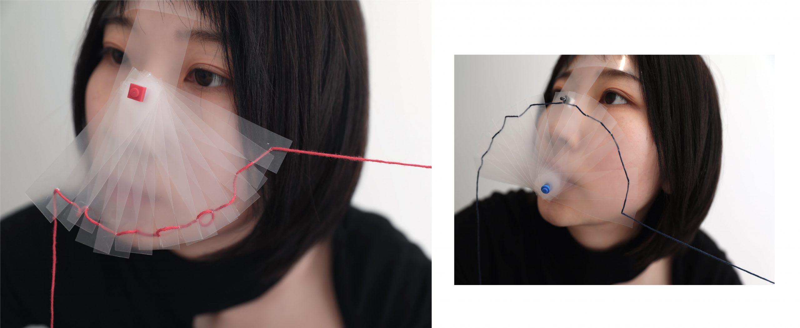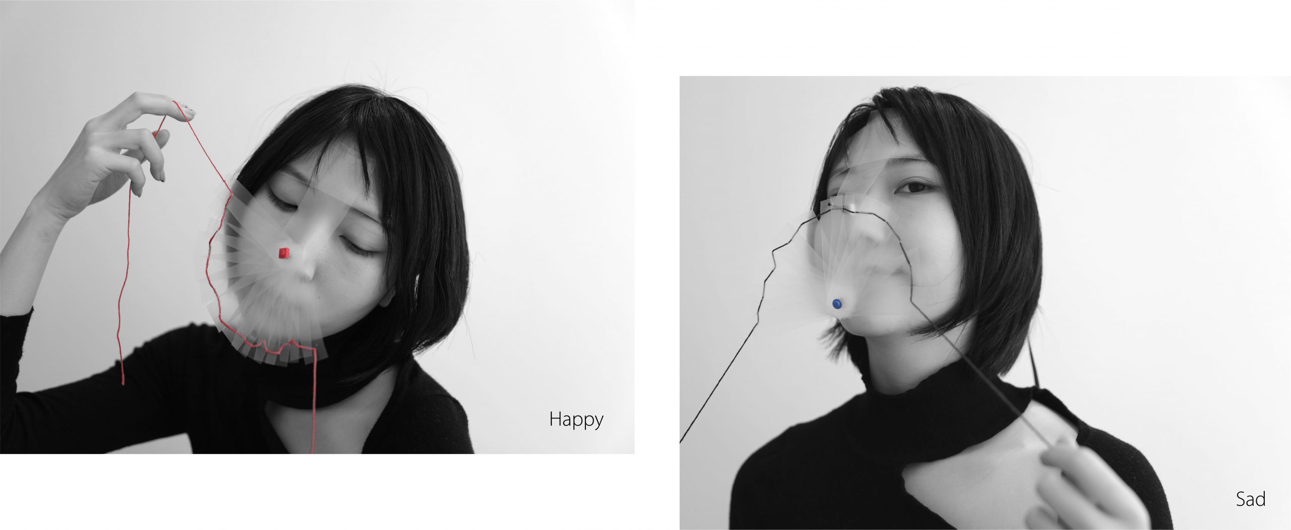 Concept: I was always told that being mature means people have to hide their real emotions and “act like an adult to show your politeness”. Growing in such a society that a lot of people can never freely express their happiness and sadness makes us hard to really understand each other. I always feel disconnected because of it for isolating ourselves from others. To illustrate this phenomenon in this piece, I design a mask-like wearable installation. People that never show their real emotion are like wearing masks. I extract the action of mouth up and down to symbolize happiness and sadness respectively and use the radian of strings to represent them.