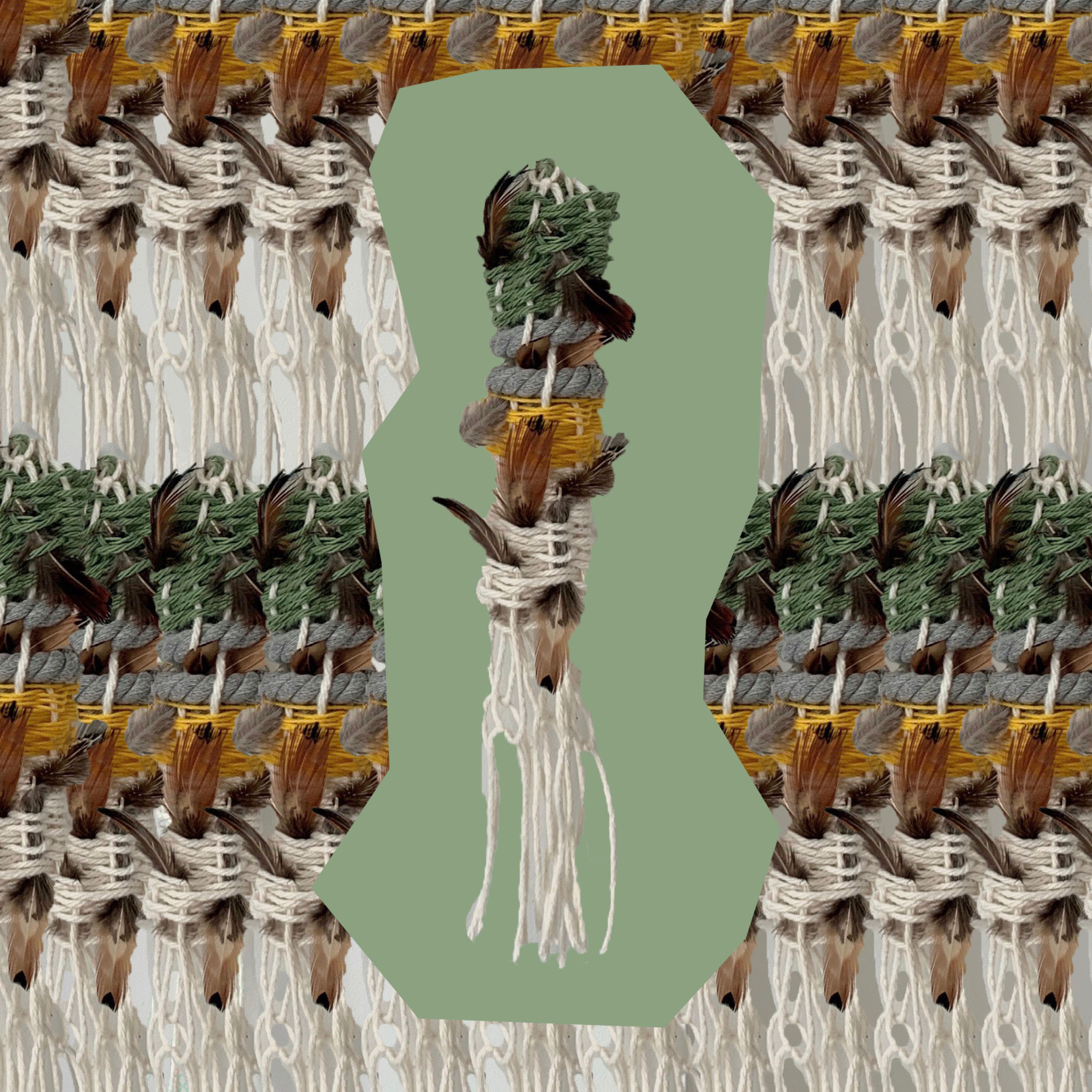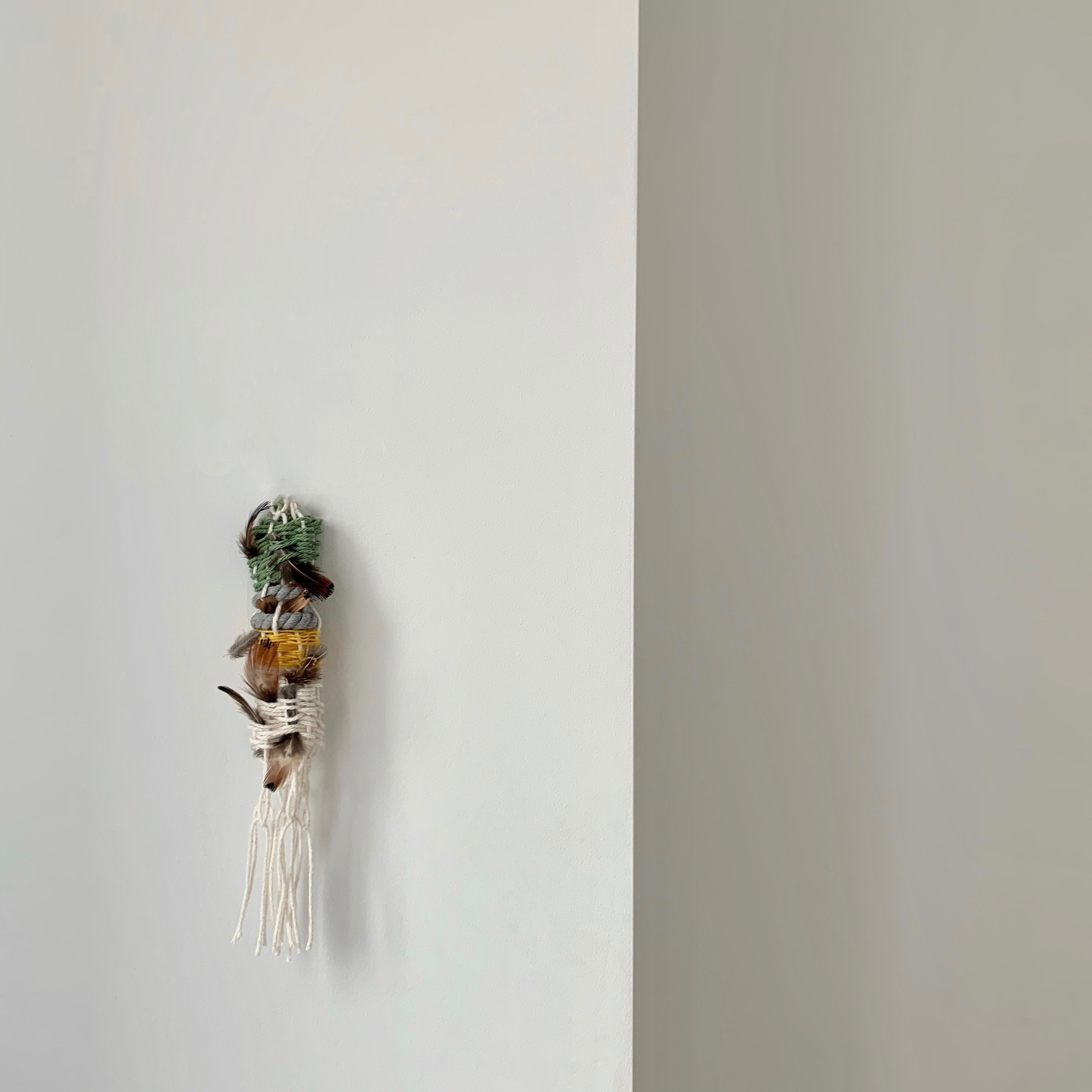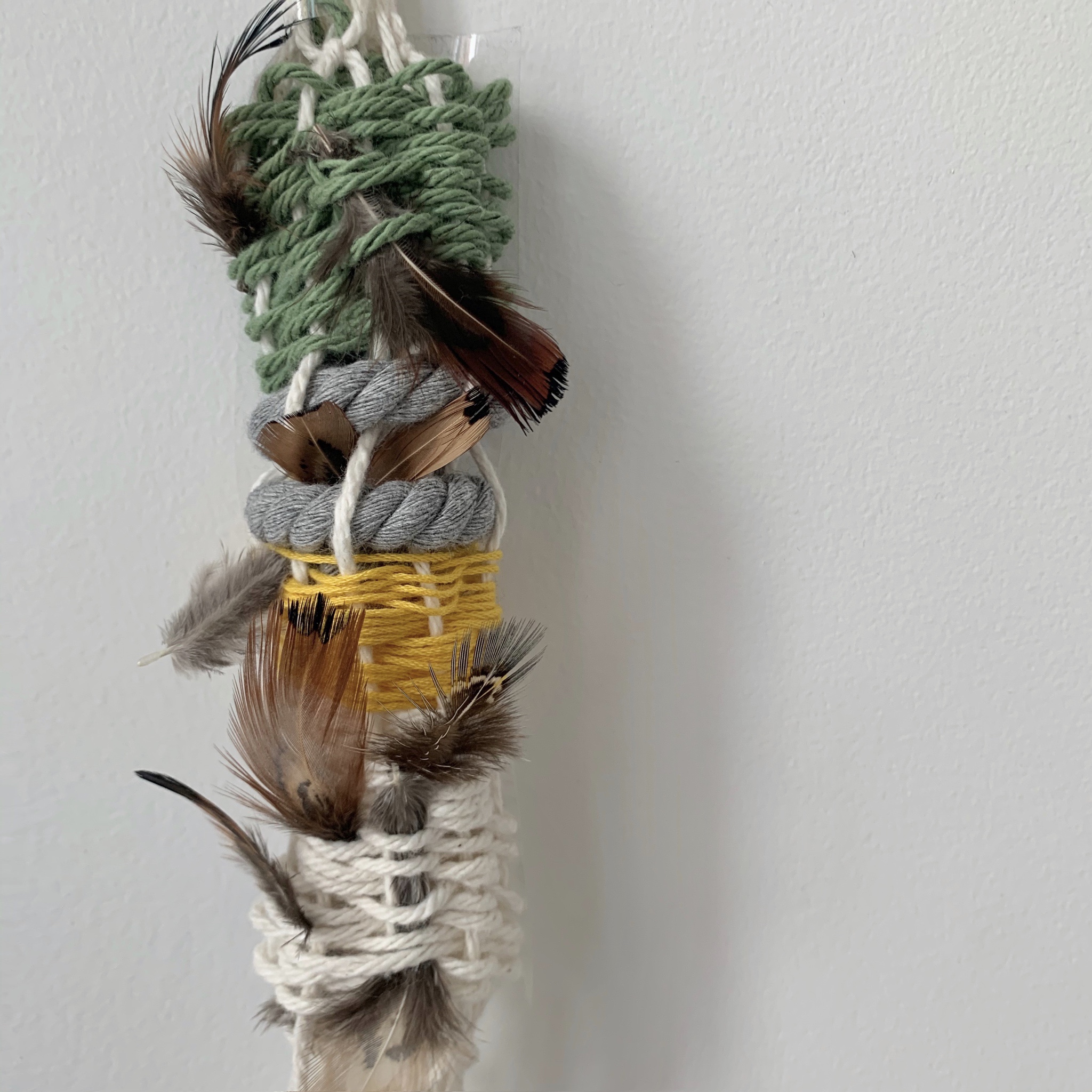 For inspiration, I went to the Natural History Museum and found that the human history part really intrigues me, The history of different races and different regions is divided into different pavilions for display. There are some things like small pendants in many different cultural venues. Different cultures may use different materials to embodied various meanings. But if we view them as works of art, they all hang down from above like small wind chimes to form a decorative object. So I decide to make a totem( or a pendant) incorporate my own aesthetic and my understanding of nature. The way I made my finished small ornaments is to weave a loom, then use fishing rope and yarn as an auxiliary to roll the loom that I weave out into a solid cylinder. In my weaving process, because I wanted to echo the theme of the project, I added (fake) bird feathers that represent nature. When I was trying to finish my object, I found that the feathers were not stable, so I replaced them with rope, and then put the feathers on it as an icing on the cake.