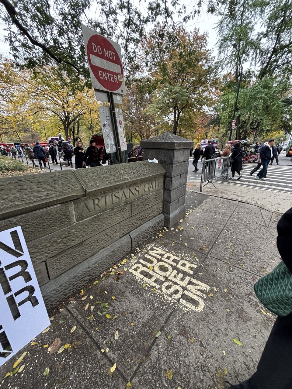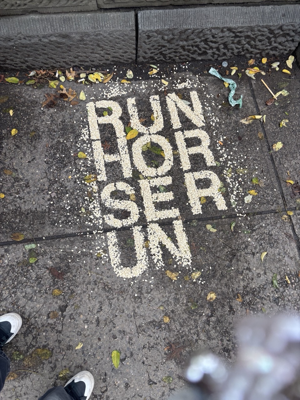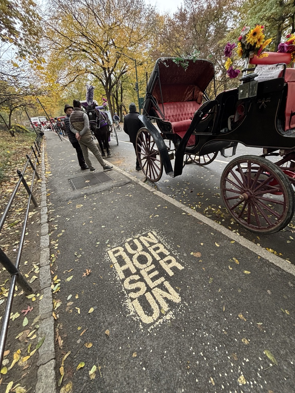 For our project, we wanted to focus on the horses of Central Park. These horses have been around for 200 years, being used in NYC as a tourist attraction, but times have changed. Recent incidents have brought to people’s attention how poorly these horses have been treated. The cars, pollution, overworking, and just the noise are terrible for these horses. In the past year, two horses have passed, and laws have been starting to get more traction. For our artist inspiration, we had Christopher Wool. His art plays with text and how you read it. His piece “Run Dog Run” was our main inspiration for this project, and we went pretty much straight from that. The piece we made is from a stencil we made and cut out, and then we put oats in the stencil and pulled it up. What is fun is that it’s fully legal, and the horses can eat the oats; however, the birds are the ones who really get to them.