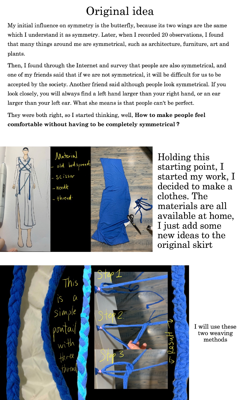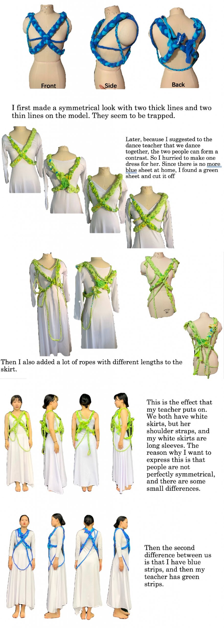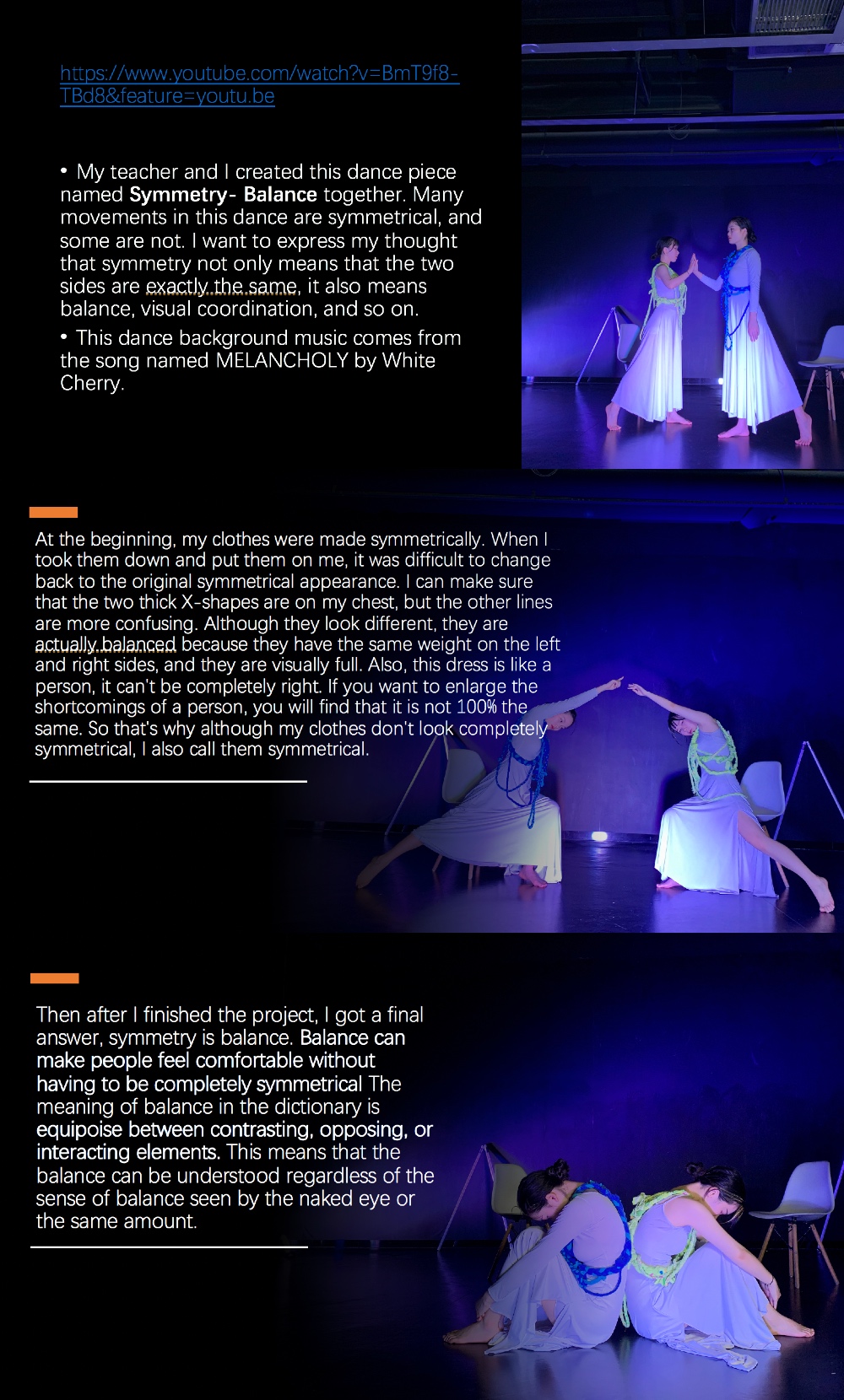 Prompt: When I recorded 20 observations in my studio class, I found that many things are symmetrical, such as architecture, furniture, art, and plants. Then, I created a survey, and one of my friends said that if we are not symmetrical, it will be difficult for us to be accepted by society. Another friend told me, although people look symmetrical. If you look closely, you will always find a left hand larger than your right hand, or an ear larger than your left ear. What she means is that people can't be perfect. They were both right, so I started thinking, well, How to make people feel comfortable without being completely symmetrical?Holding this starting point, I began my work, and I decided to make clothes. After I finished the cloth, my teacher and I created this dance piece named Symmetry- Balance together