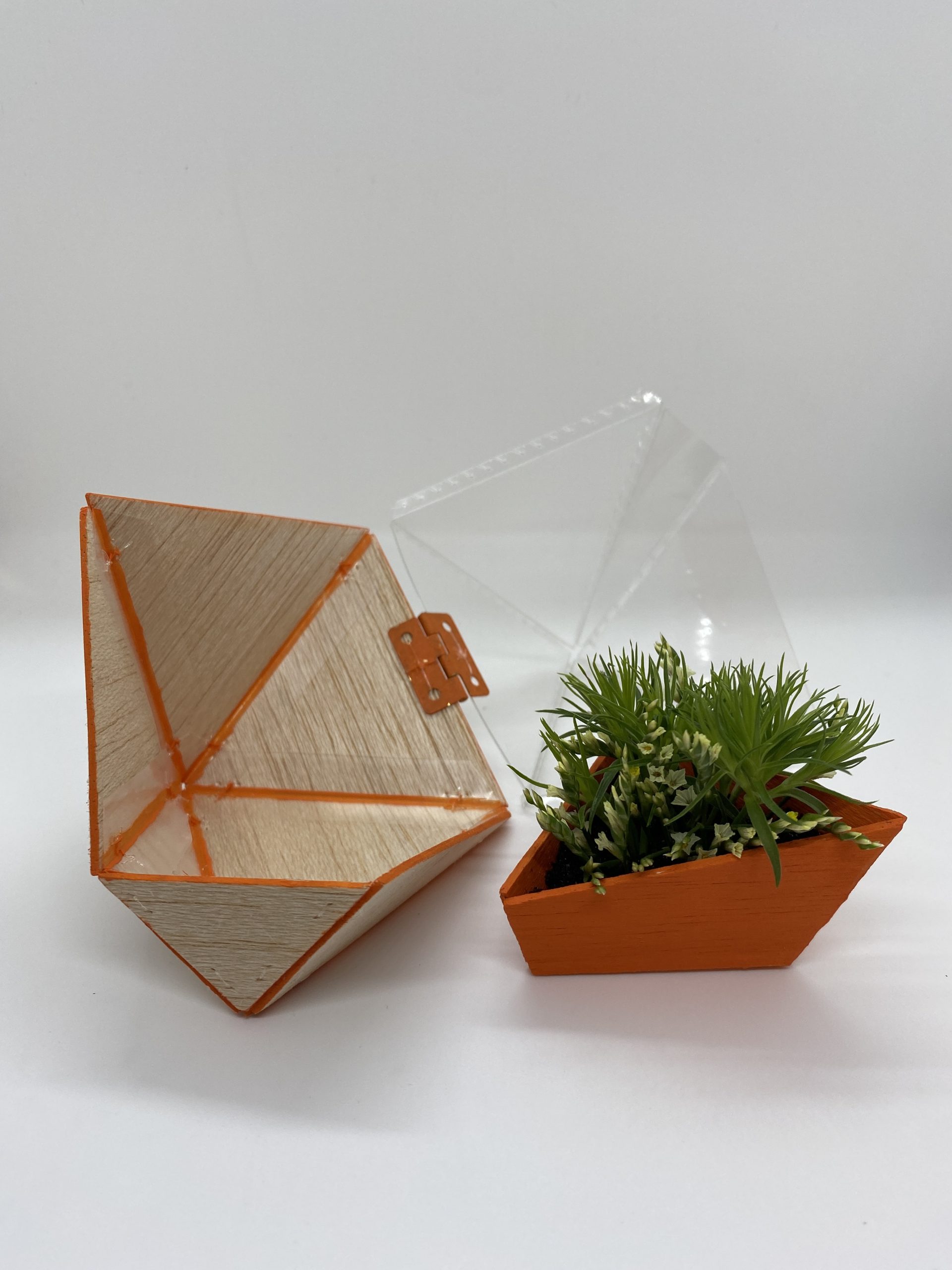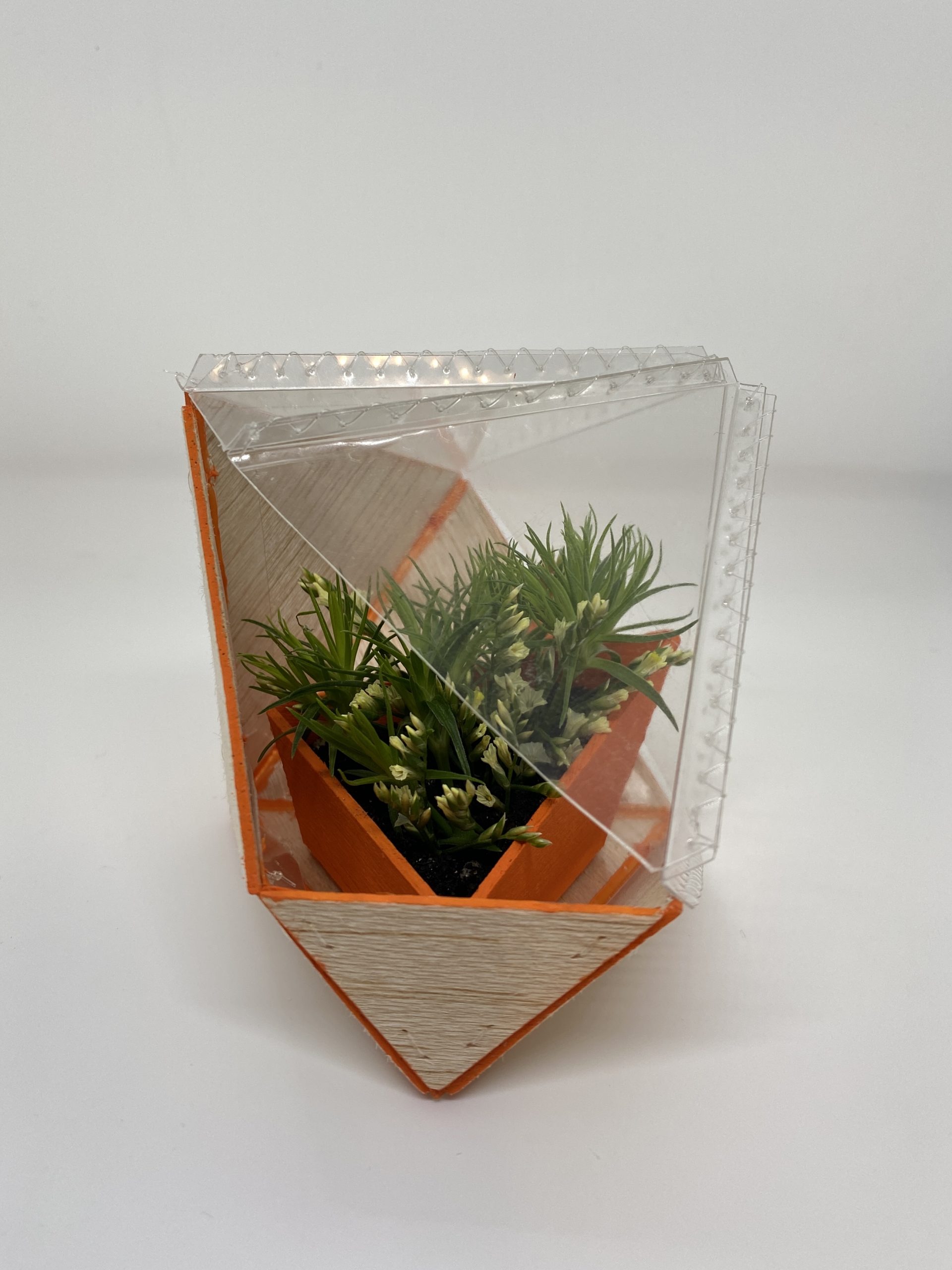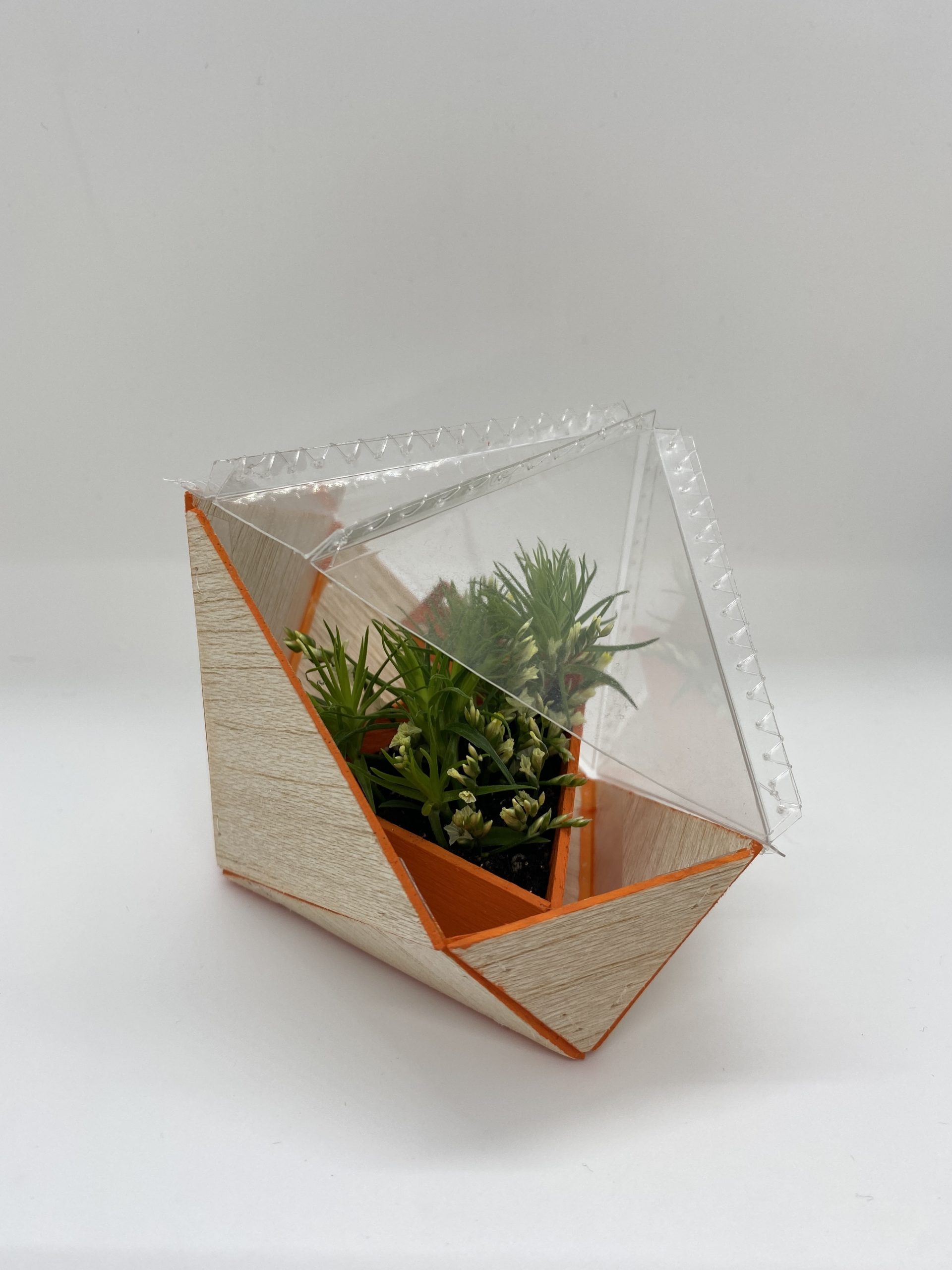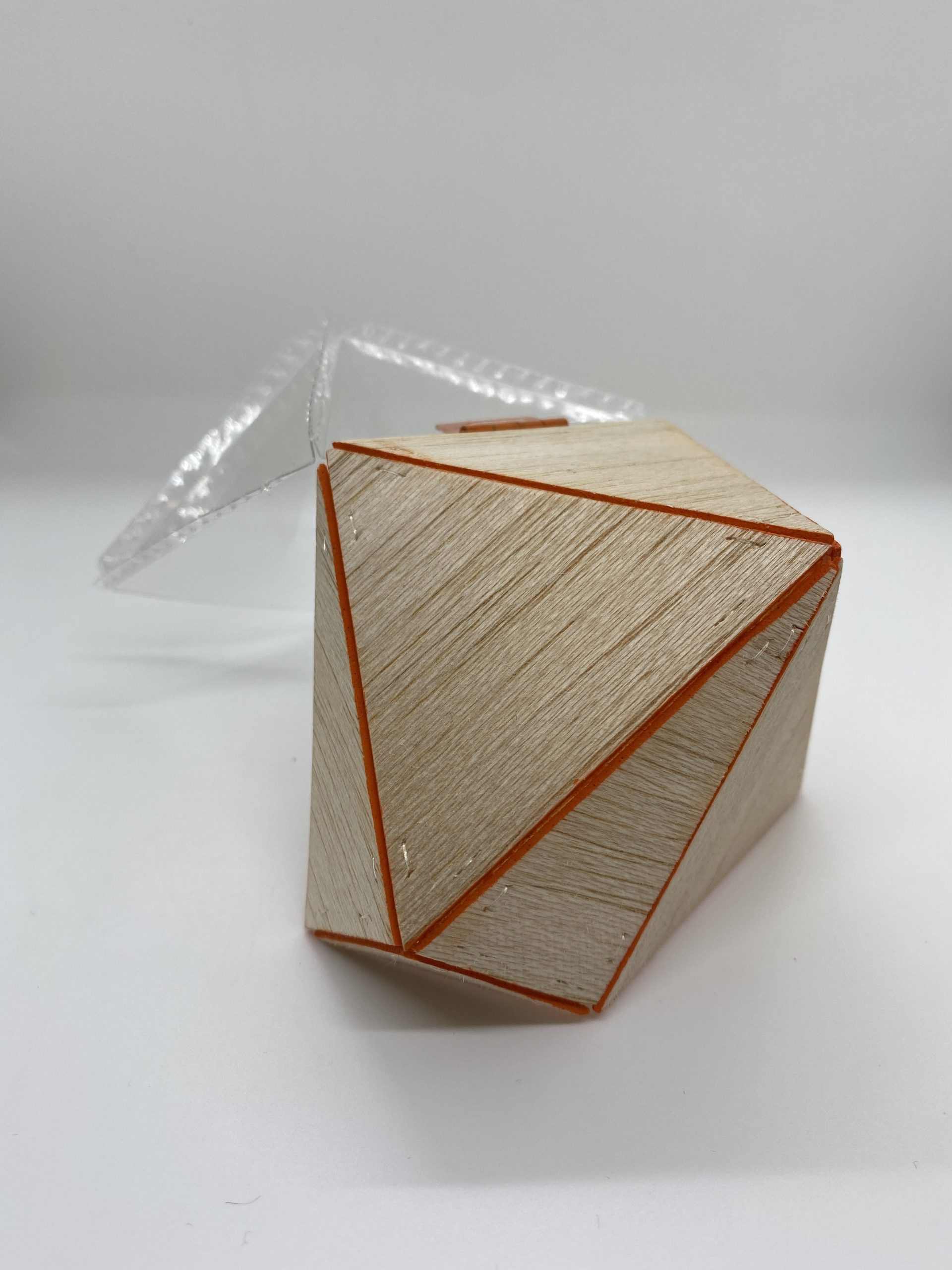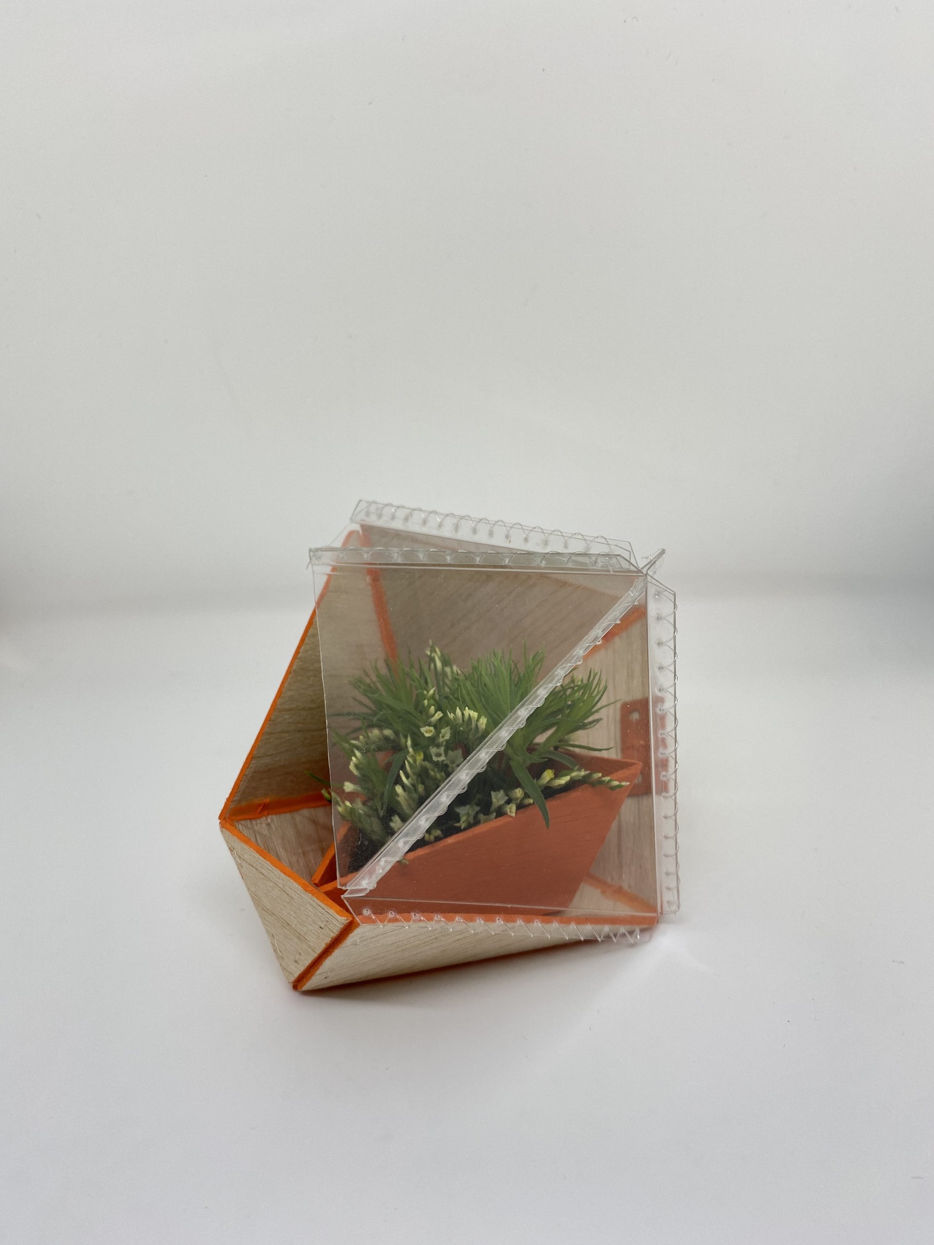 Prompt: Design and construct a polyhedral form using two durable planar materials. Whether the structure is closed or open, the inside should contain a surprise element of some sort.