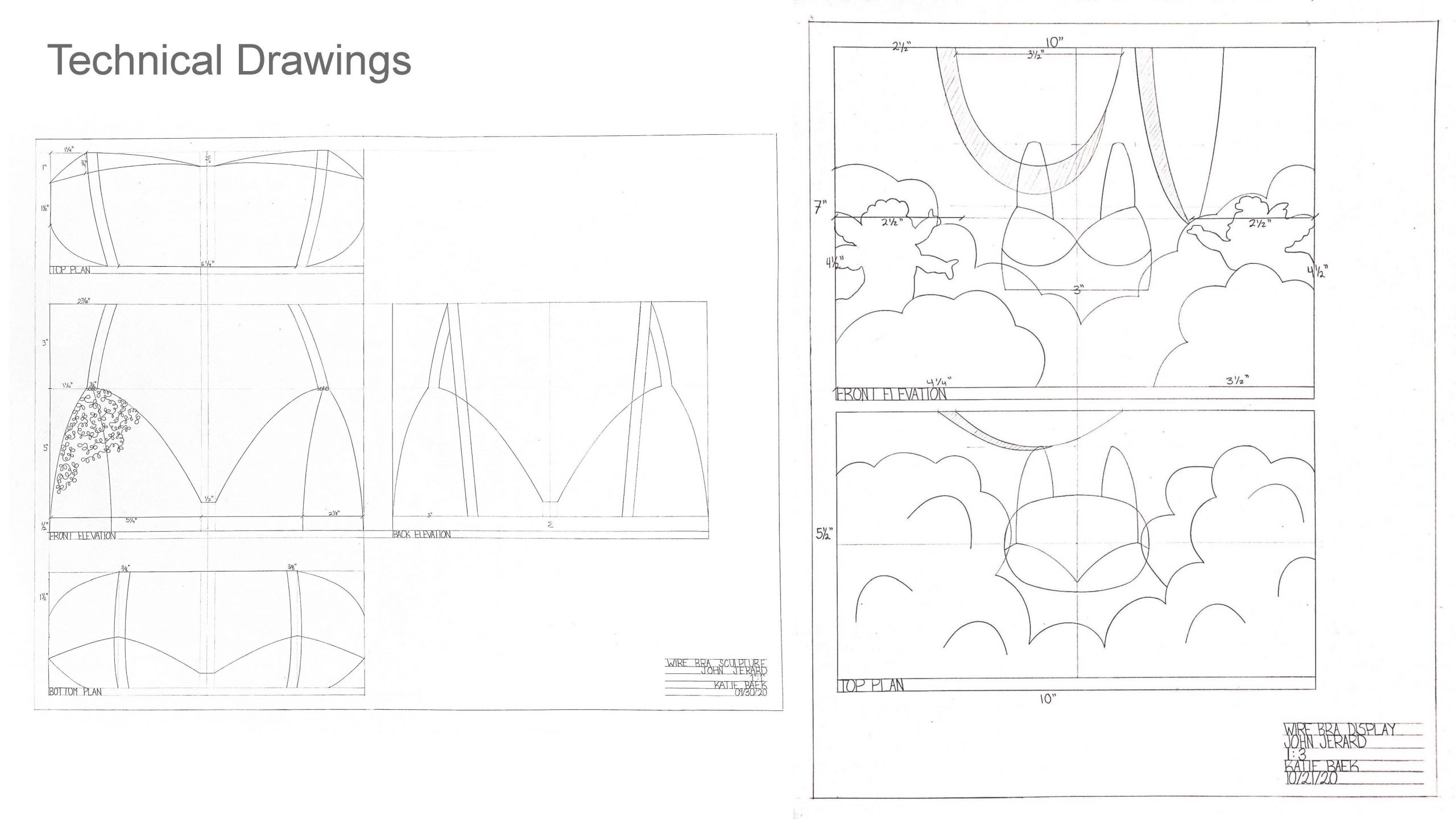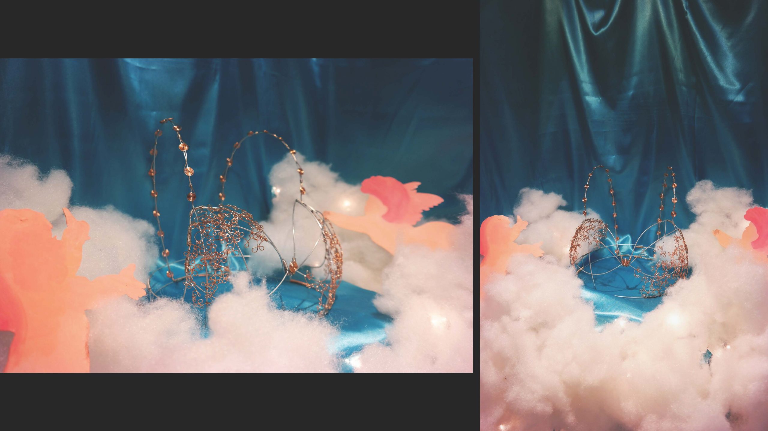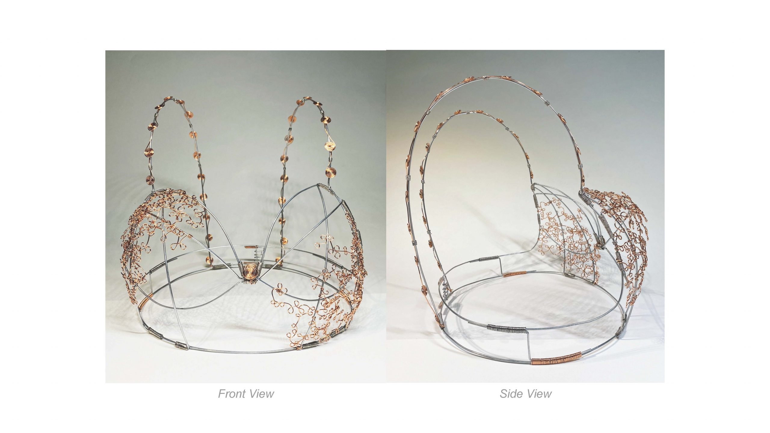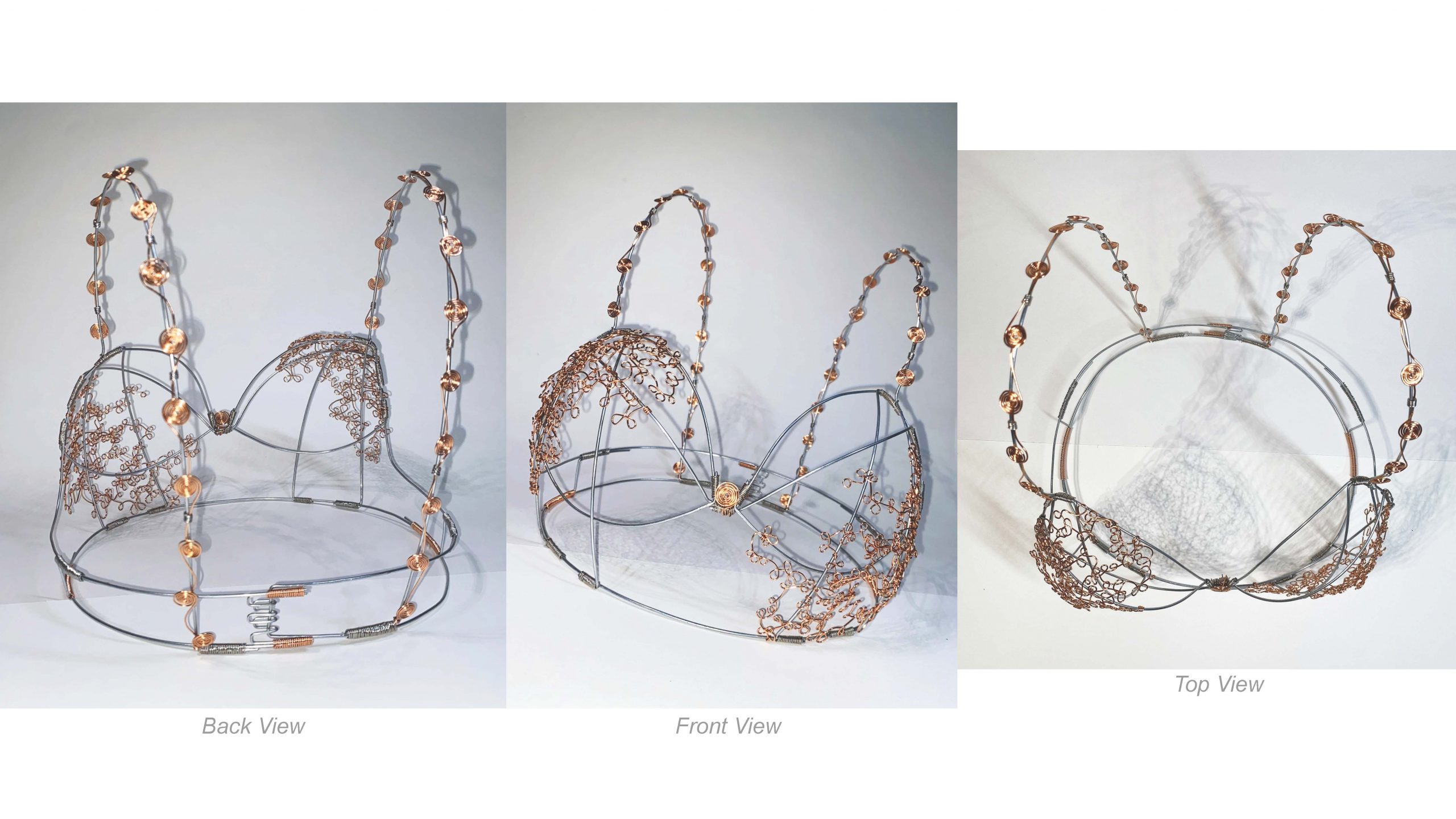 When we were first told about this assignment I immediately knew that I wanted to make some sort of bra garment. The juxtaposition of the hard, utilitarian wire against a symbol of feminism and delicacy intrigued me. I wanted to see how I could push the boundaries of bending, twisting, and drawing with the wire to recreate dainty yet intricate lace trim. I used a thicker, 16 gauge steel wire to create the base of the bra and give it a stable structure. The construction of this was much like building the bones of a house, then working outwards and adding the exterior details. We were encouraged to think of every functional binding and connection as a design opportunity, which inspired me to wrap some of the connections with copper wire as well.