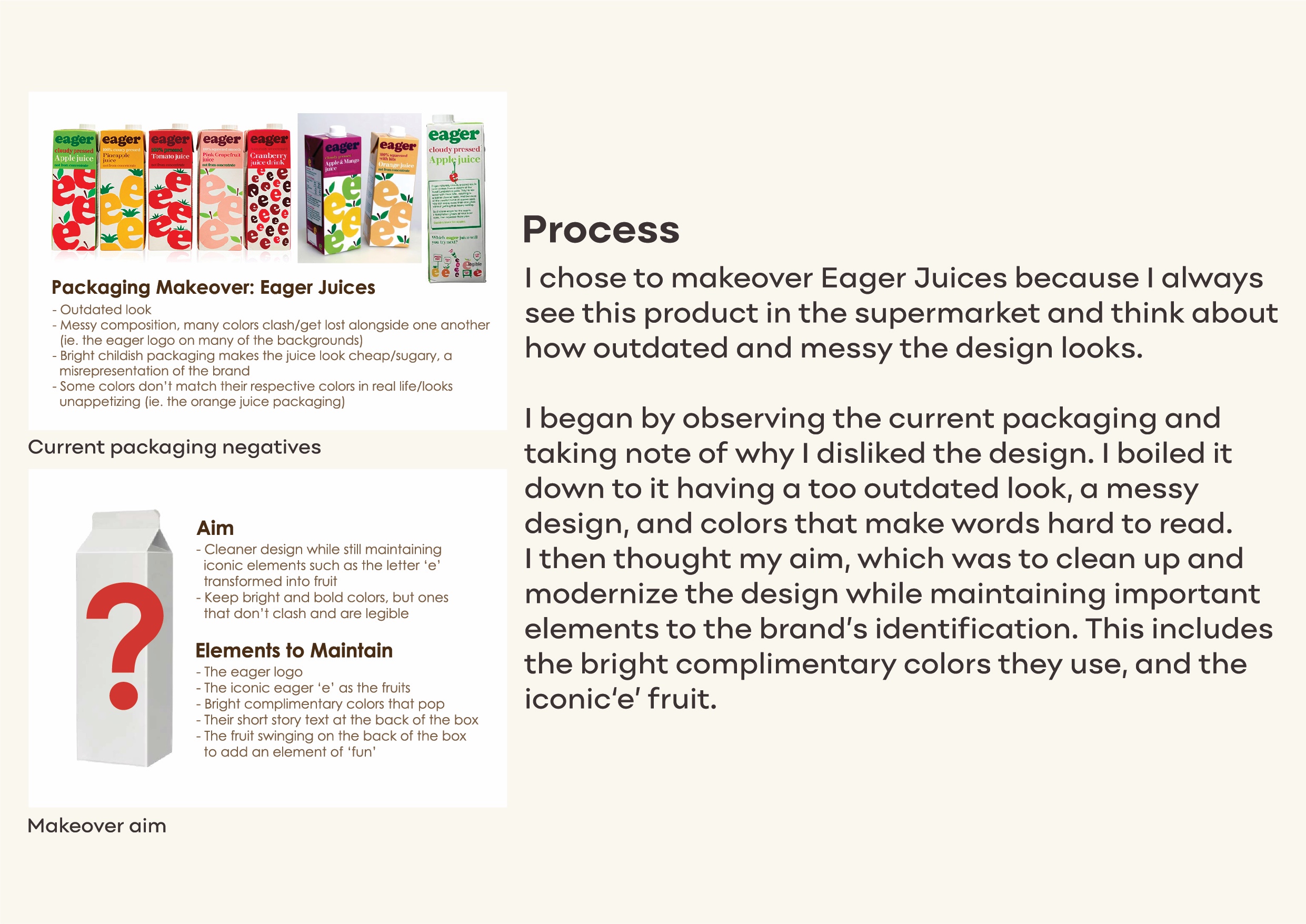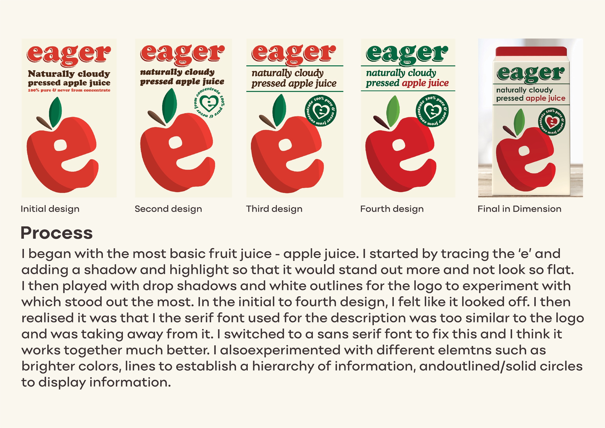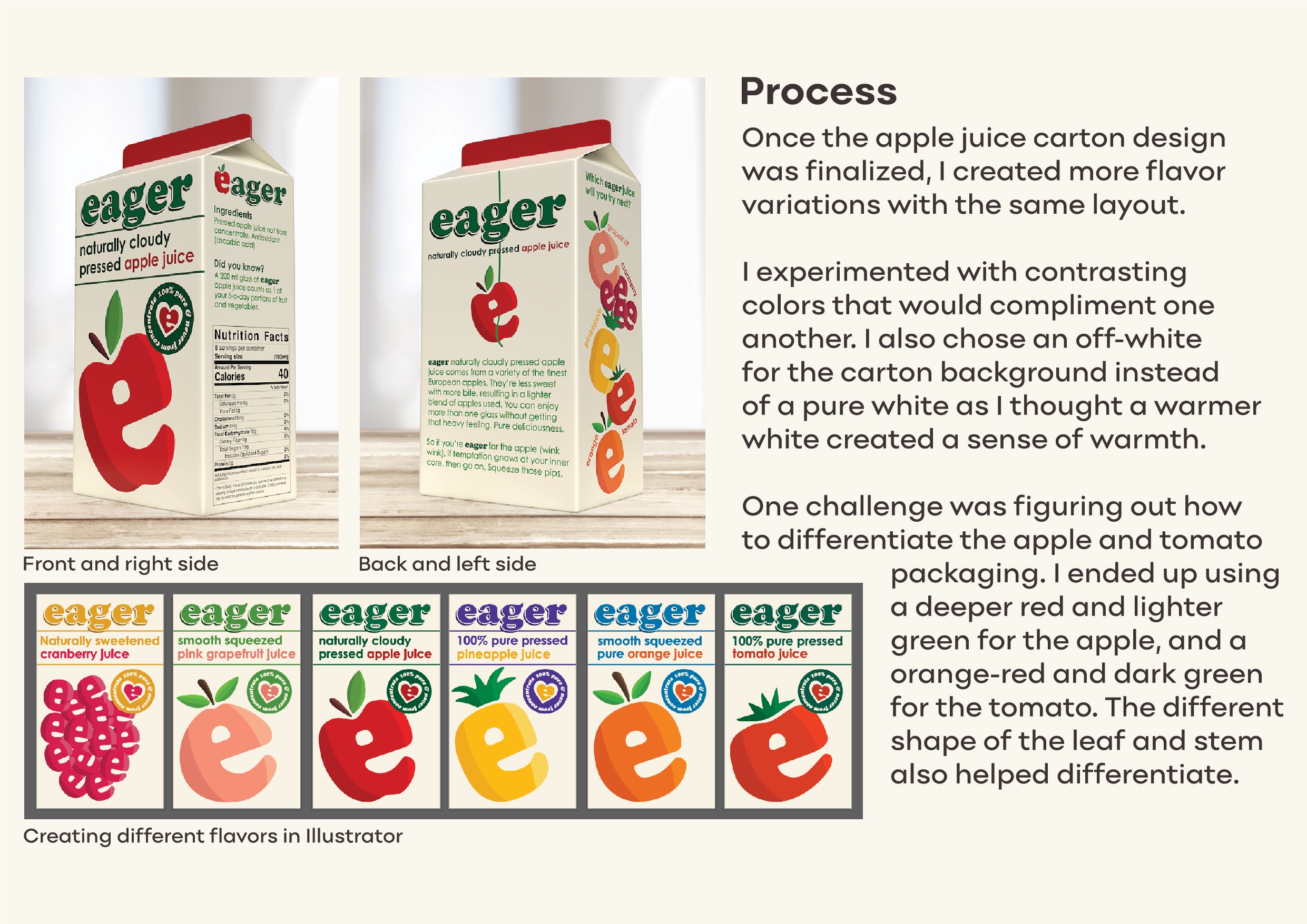 I decided to makeover Eager’s juice packaging as they had an outdated look, messy design, and clashing colours that make words hard to read. My aim was to clean up and modernize the design while maintaining important elements to the brand’s identification. This includes the bright complementary colours they use, and the iconic ‘e’ fruit. After establishing the four sides of the carton design for the apple juice flavour, I proceeded to create more packaging for different flavours whilst maintaining the same design layout.