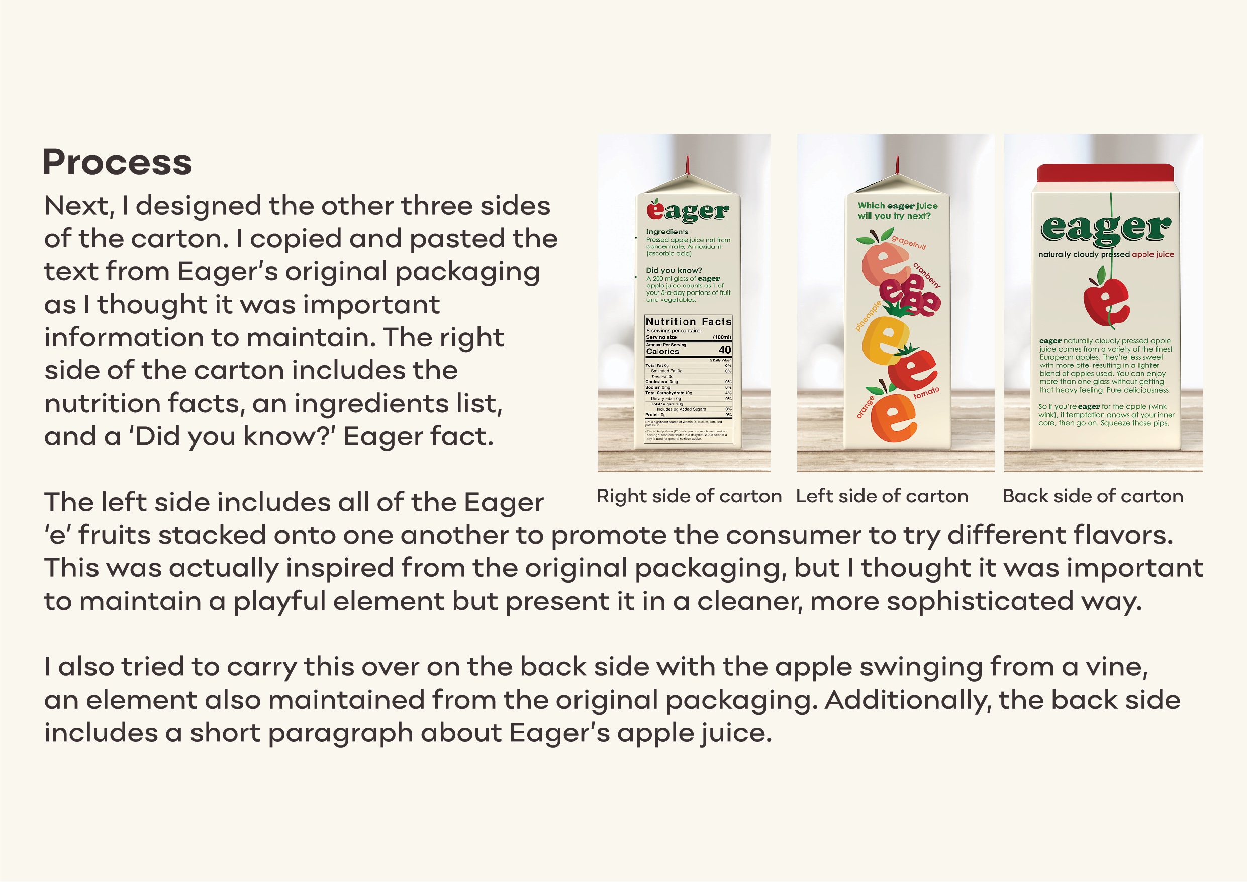 It was a challenge to keep the essence of iconic elements from Eager’s original packaging while revamping the design to be presented in a more modern and simple way. However, I overcame this by listing elements I wanted to keep and making small adjustments through a modern lens.