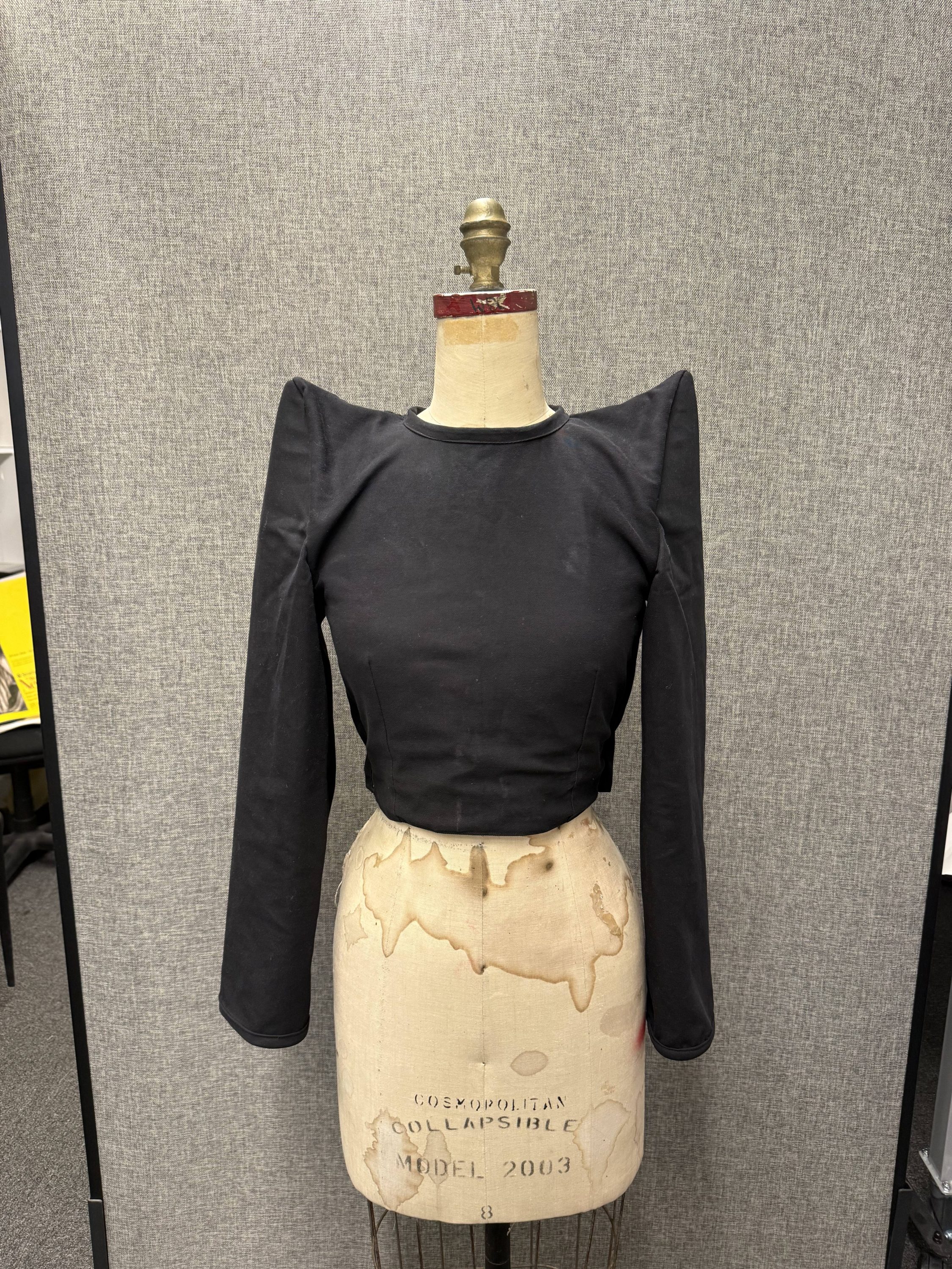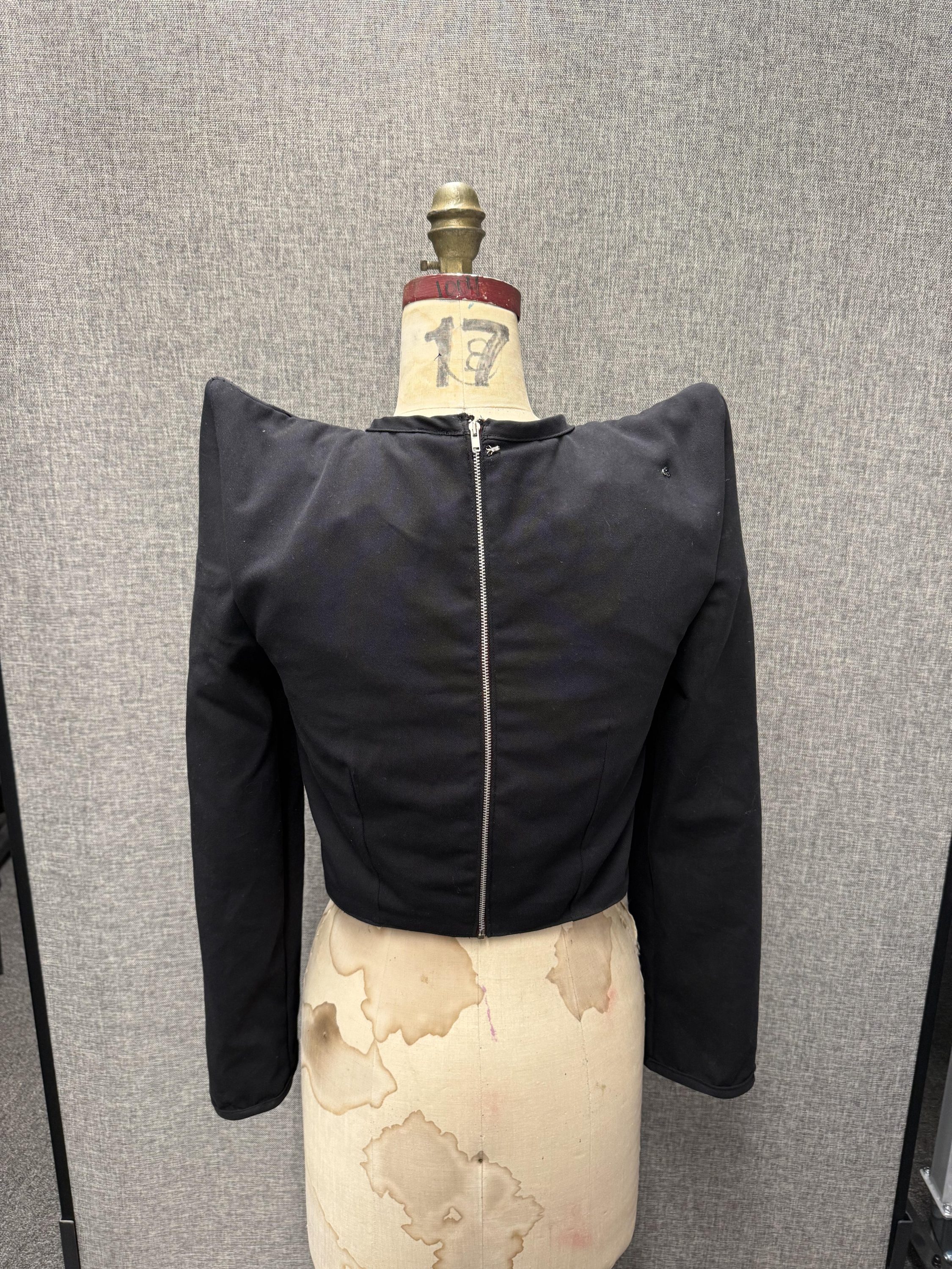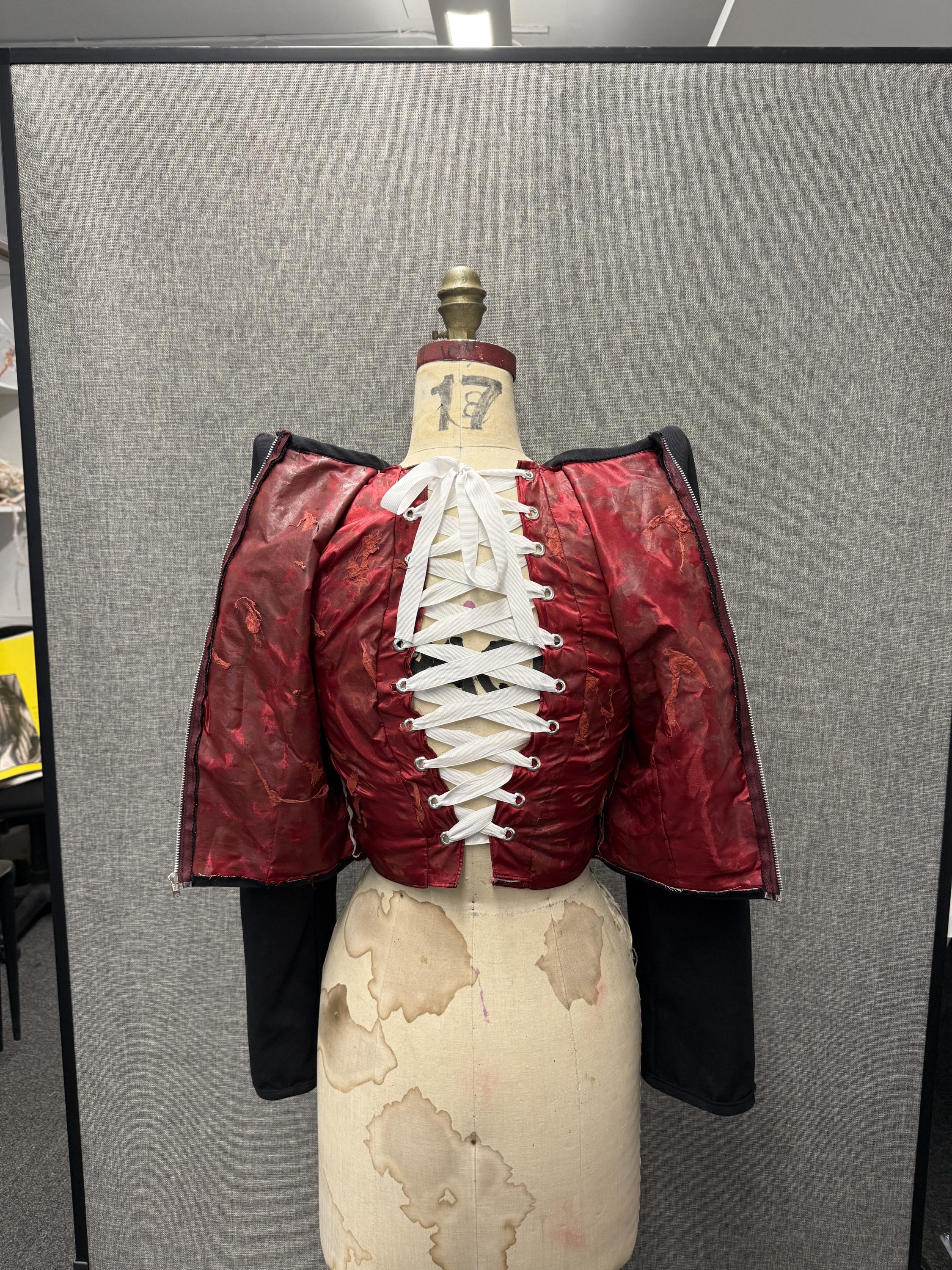 My work resembles an ancient Viking torture method, the Blood Eagle. I chose Rick Owens as my historical figure because of his extravagant, goth-inspired designs. I took inspiration from his use of sharp lines on simple fabric. I wanted my garment to be very sleek from the outside, like elevated workwear. The shirt can be zipped to hide the simulated gore on the inside. When unzipped, it shows the blood eagle (the victim is cut from the spine, their ribs are pulled apart, and their lungs are spread like wings). I learned how to create the pointed shoulder silhouette from Rick Owens’ own work. I created a mixed playlist to go along with the viewer’s experience, as I believe sound is extremely important to enhancing viewing. Owens also believes the best way to promote a brand is through fashion shows, as it combines visual and auditory works. Along with this, I created a video to show the transformation of the “blood eagle”. The fabric I chose was light on its own, a simple cotton, to which I attached heavyweight interfacing and light polyester lining. On the lining, to create the gore, I mixed red paint and spread it around the pieces. I also used painted cotton balls to add dimension.