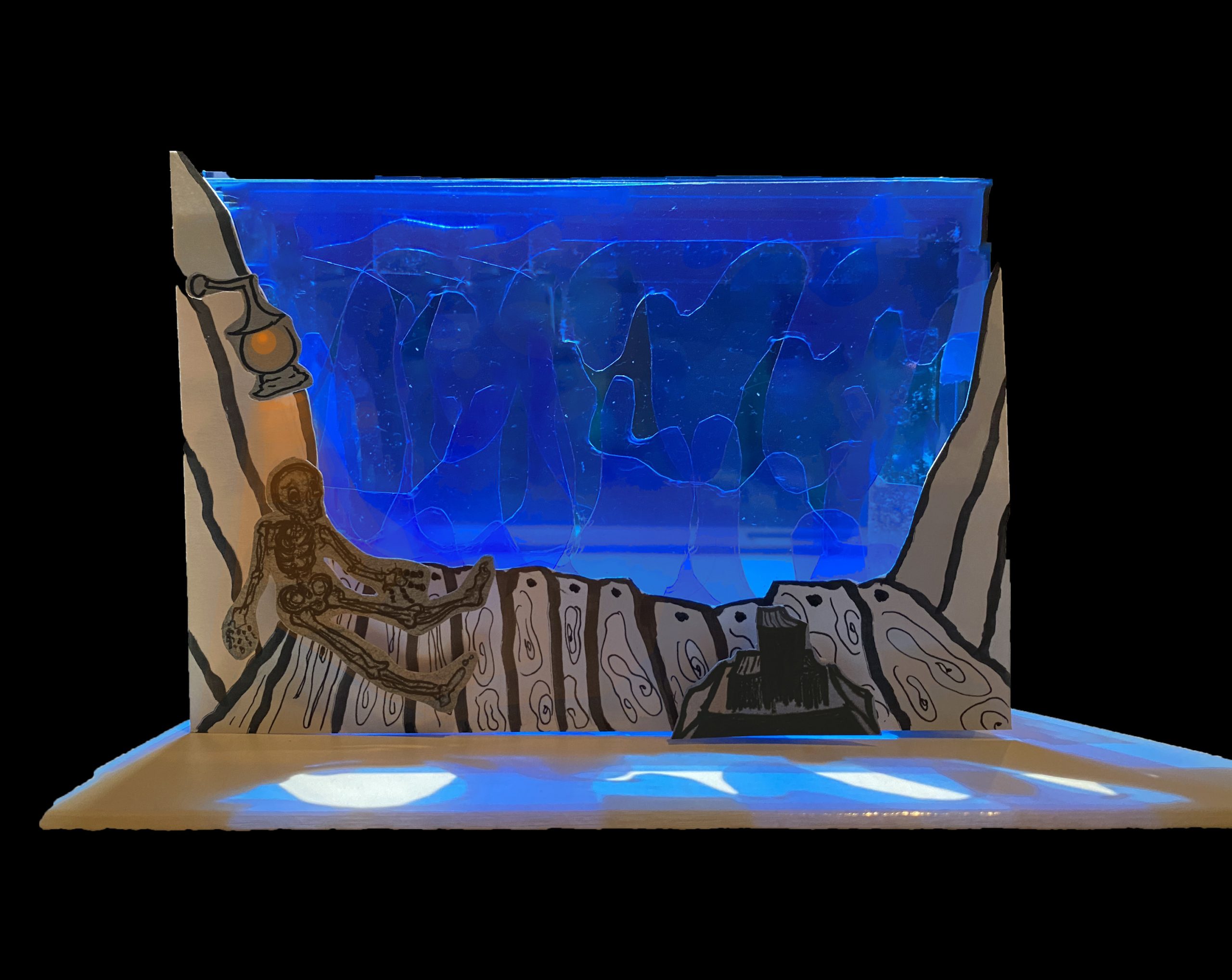 The culture I chose to work with is Land of The Dead – the final destination for the deceased – in the Pixar movie Coco. The diorama I created depicts the scene where a spirit will soon experience the final death, meaning he would disappear from this world for the dead. Using blue as a background color, I intend to create a sorrowful atmosphere; the color orange (complementary to blue) helps light up the interior space in the foreground.