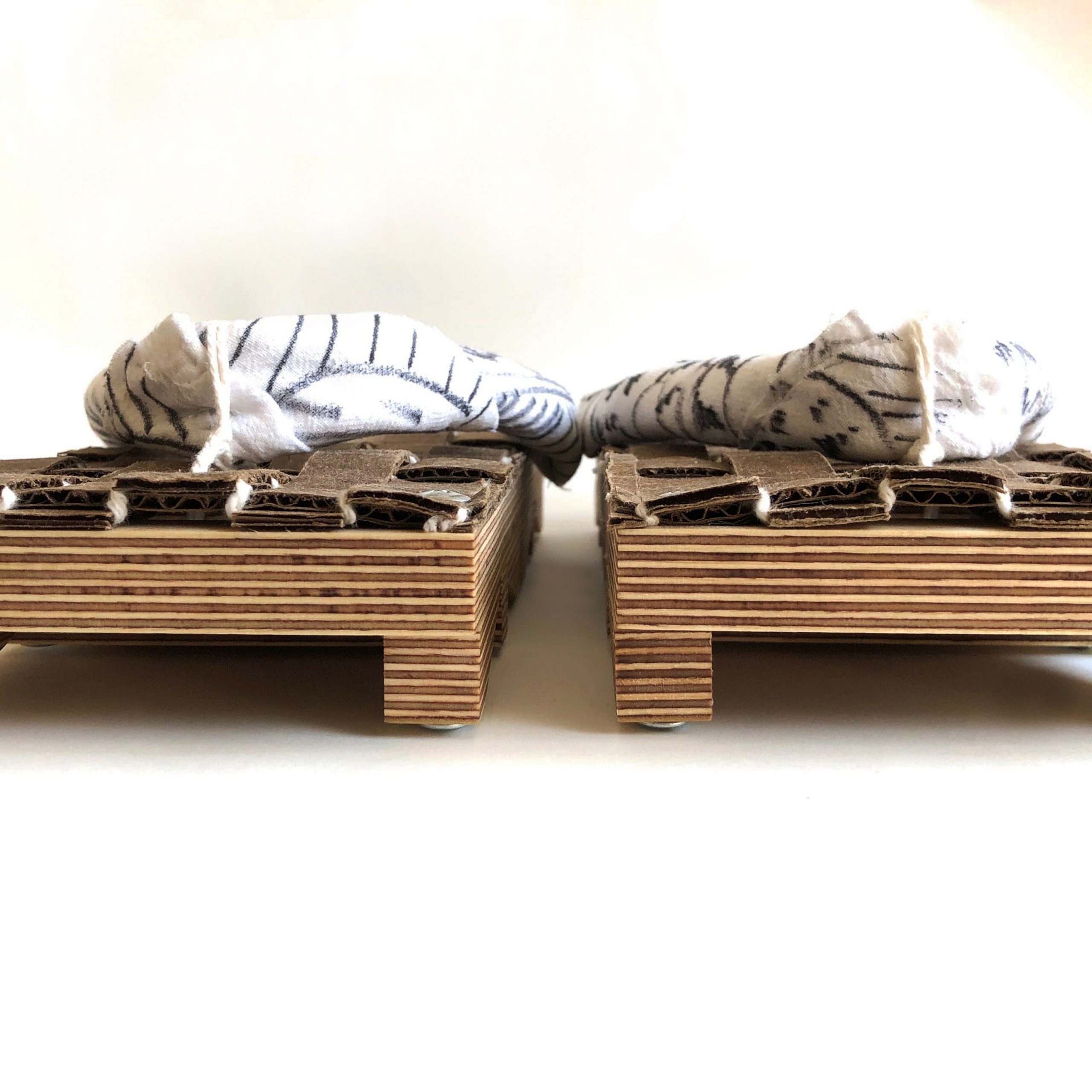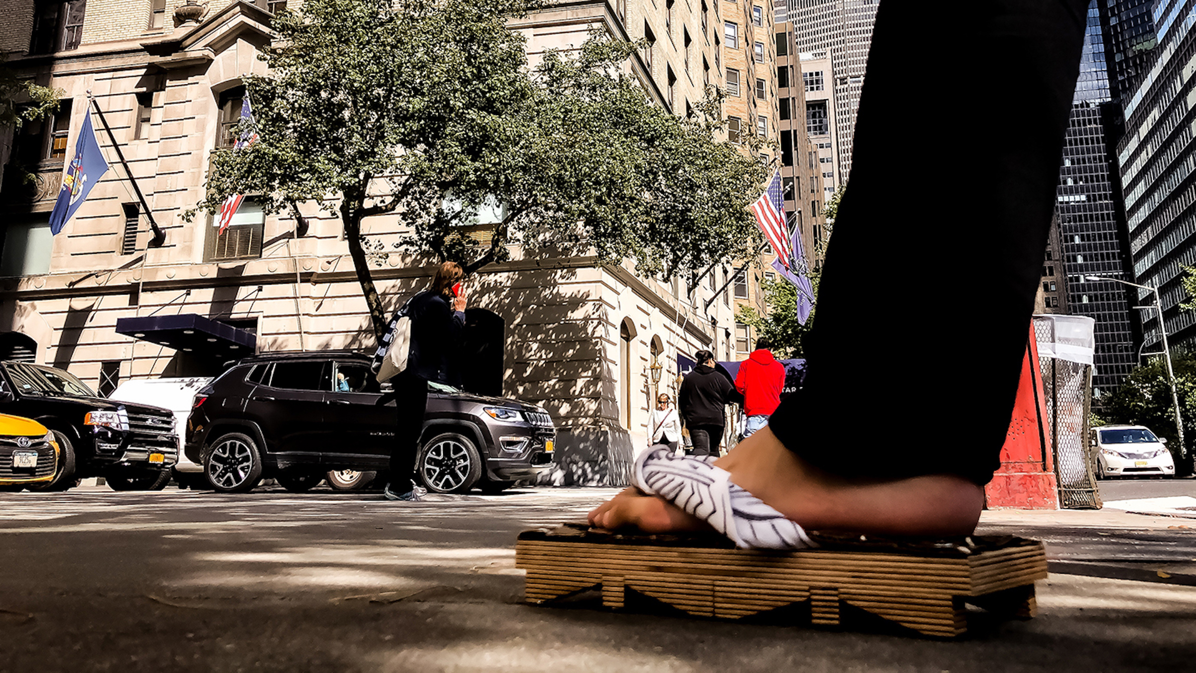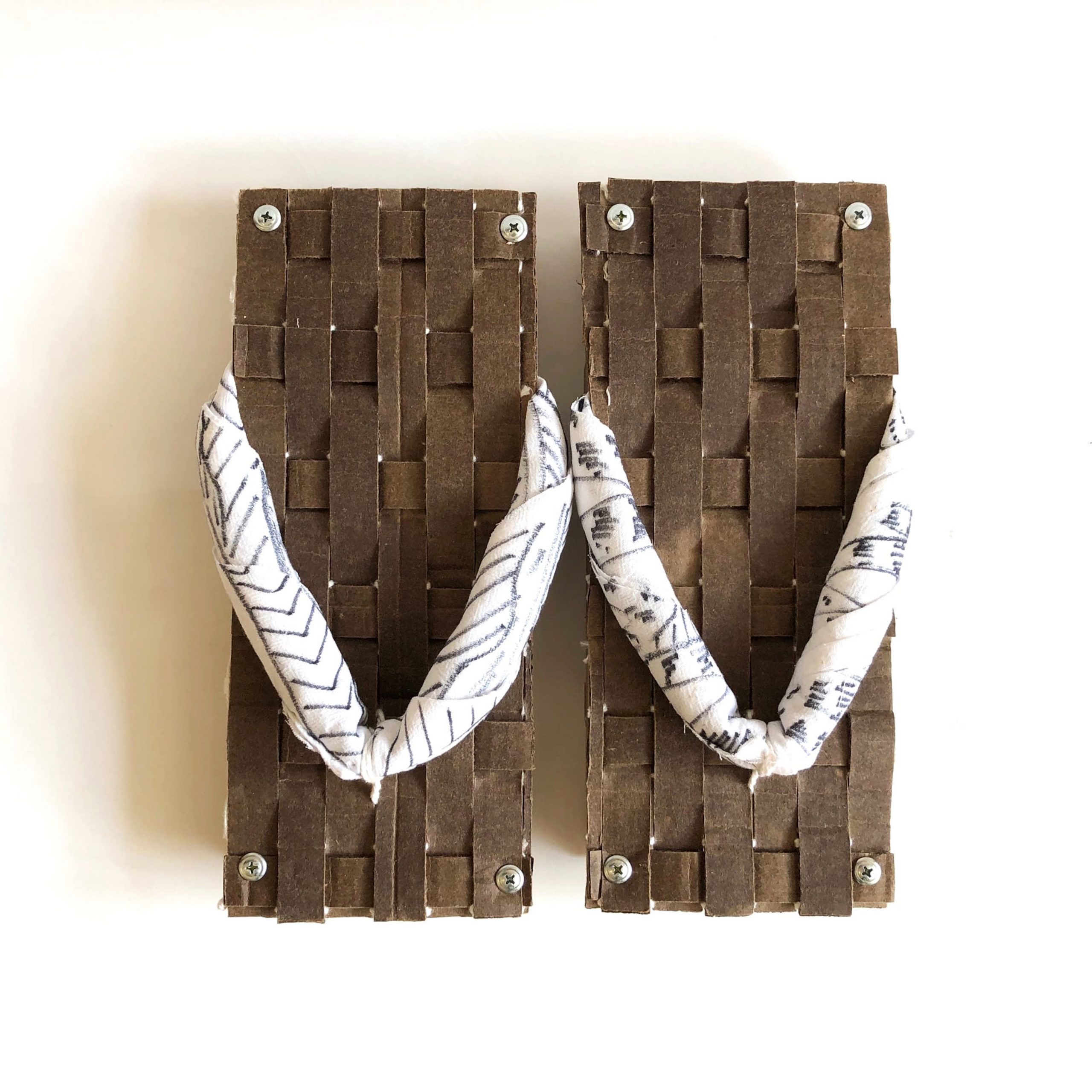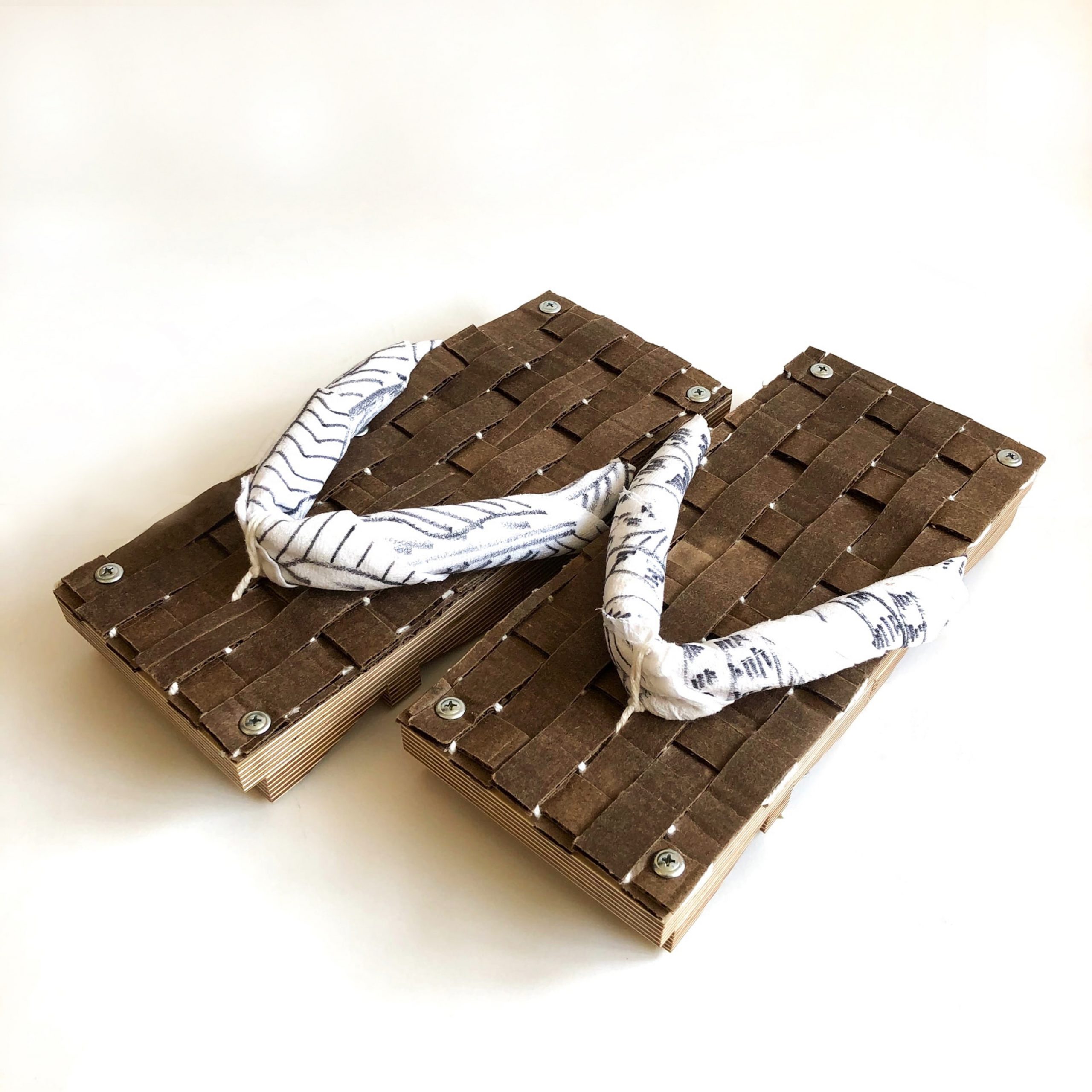 Since I spent half of my life in China and another half in Japan, my cultural identity has two contradicted aspects. It is difficult for me to define the community where I belong to. When I was in China, I felt more identity as Japanese, but when I was in Japan, I felt more Chinese personality. And now, after I came to New York, I completely lost the direction and started to question the definition for explaining myself. While primary interest to create shoes was simple, I like to walk around the city, I began to superimpose my sandwiched- cultural identity with the image of the shoes. We cannot wear one shoe to go out. We just need a pair of shoes to support our whole body. I suddenly understand my identity and how I think today is an outcome of the mixture of both cultures, Japanese and Chinese. Therefore, I decided to design a pair of shoes and adorn them with the texture derived from the symbol bird of two nations, pheasant and crane. During the process, I added the surface sheets of the shoes for cushioning properties and the aesthetics by weaving the strips of cardboard-like Tatami.