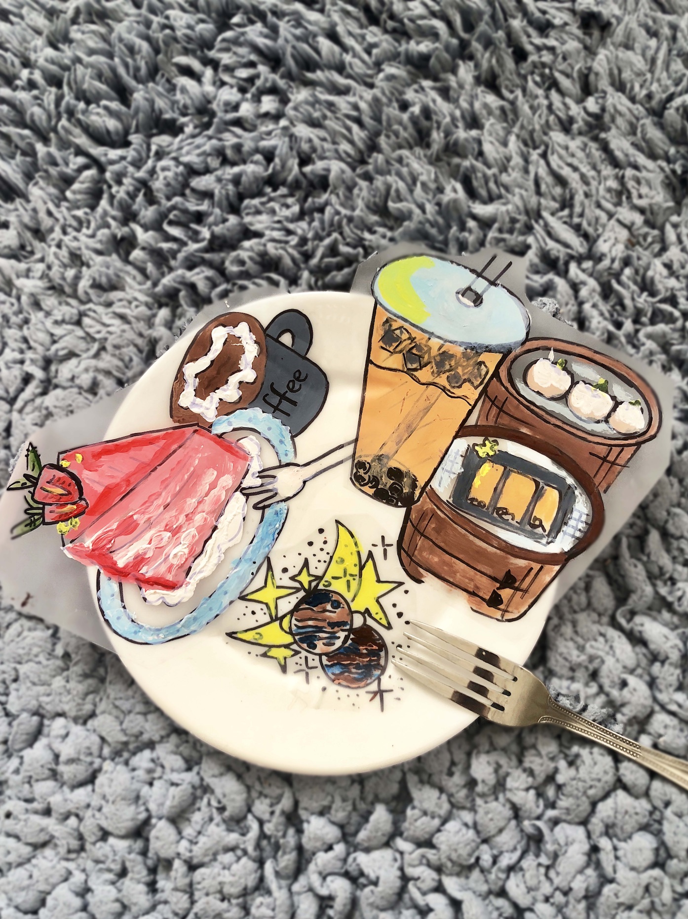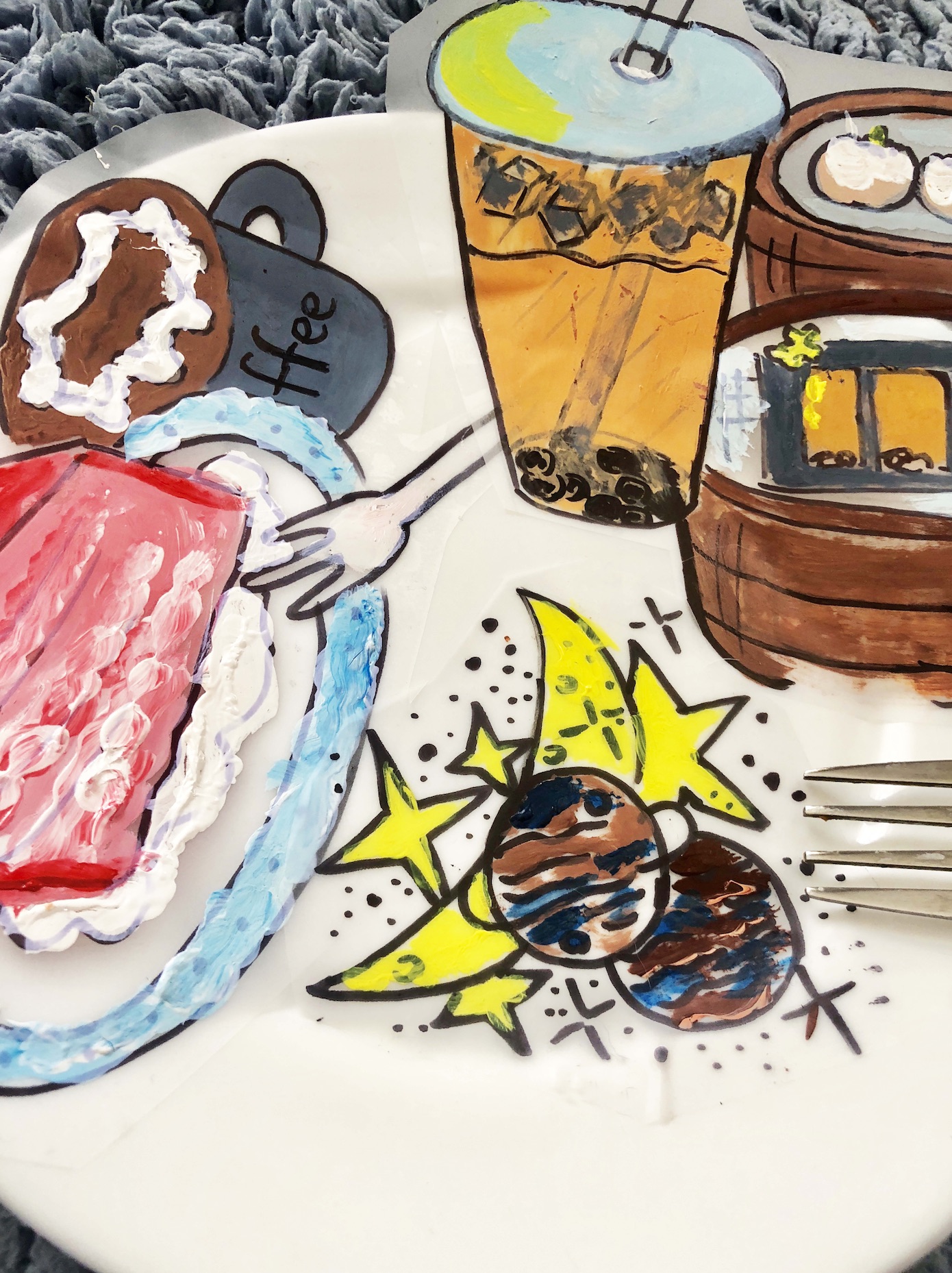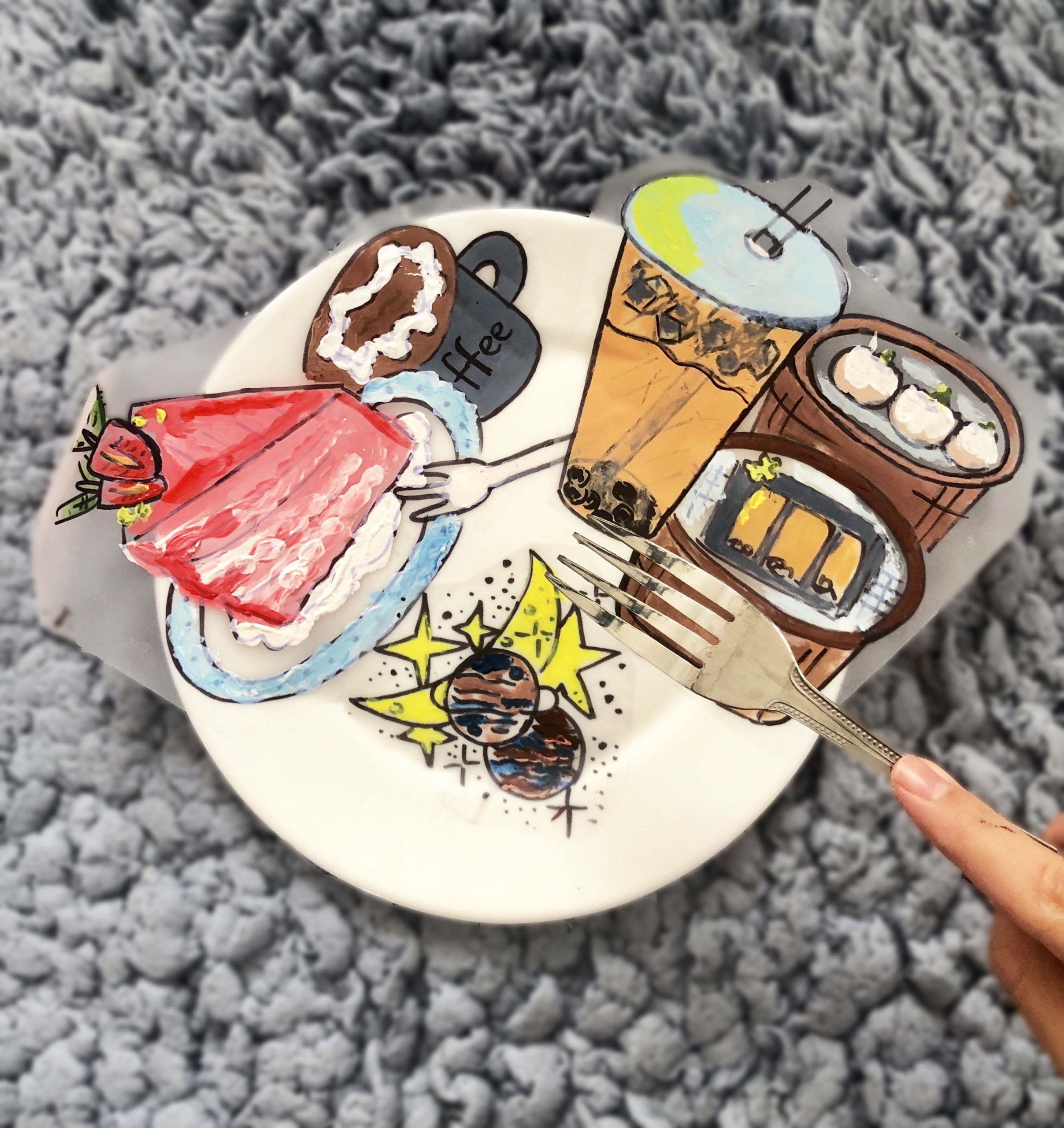 The part of this project’s name is Outside-In which means we have to bring outside things into our sticker paper. I chose the objects that I missed a lot from the outside world and I used my limited material–acrylic paints to color them. The acrylic paint can create a sense of heaviness and authenticity. The bright colors also represent my love and expectation for outside things. I put my cut stickers on a white plate to show the sense of teatime and the wishes toward the food.