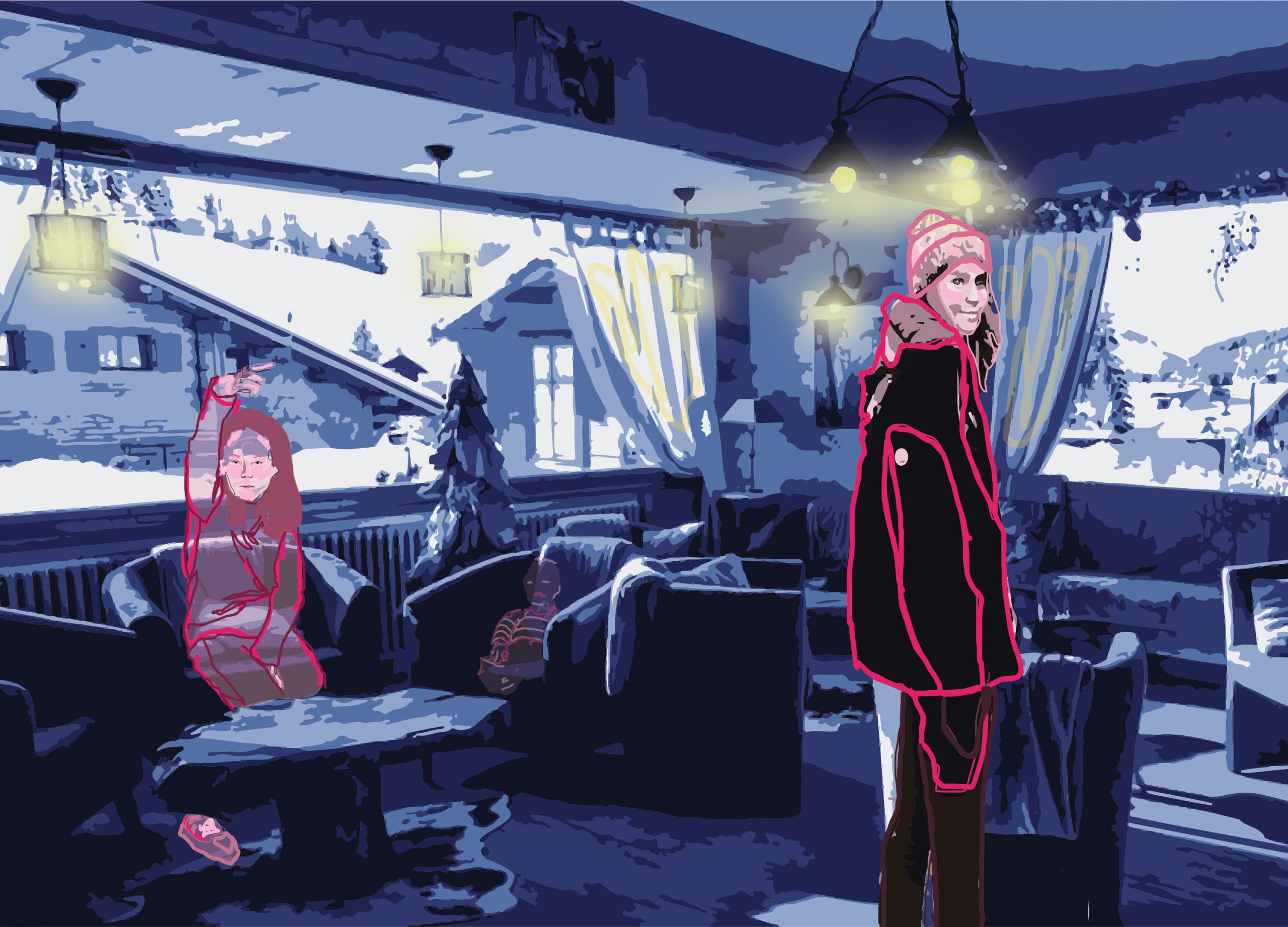 This piece shows the passing of time, not by the disappearance of family members but by the disappearance of memories over time. The figure in the foreground is the most vivid and full, as it is my most recent visit. Then, traveling to the left, a memory from my childhood is in-between the first and final figure in terms of the ability to see it, it is slowly disappearing. Lastly, the lines representing the baby version of me show an almost complete dissipation of my memories as a baby, thus a regression of my memories overtime.