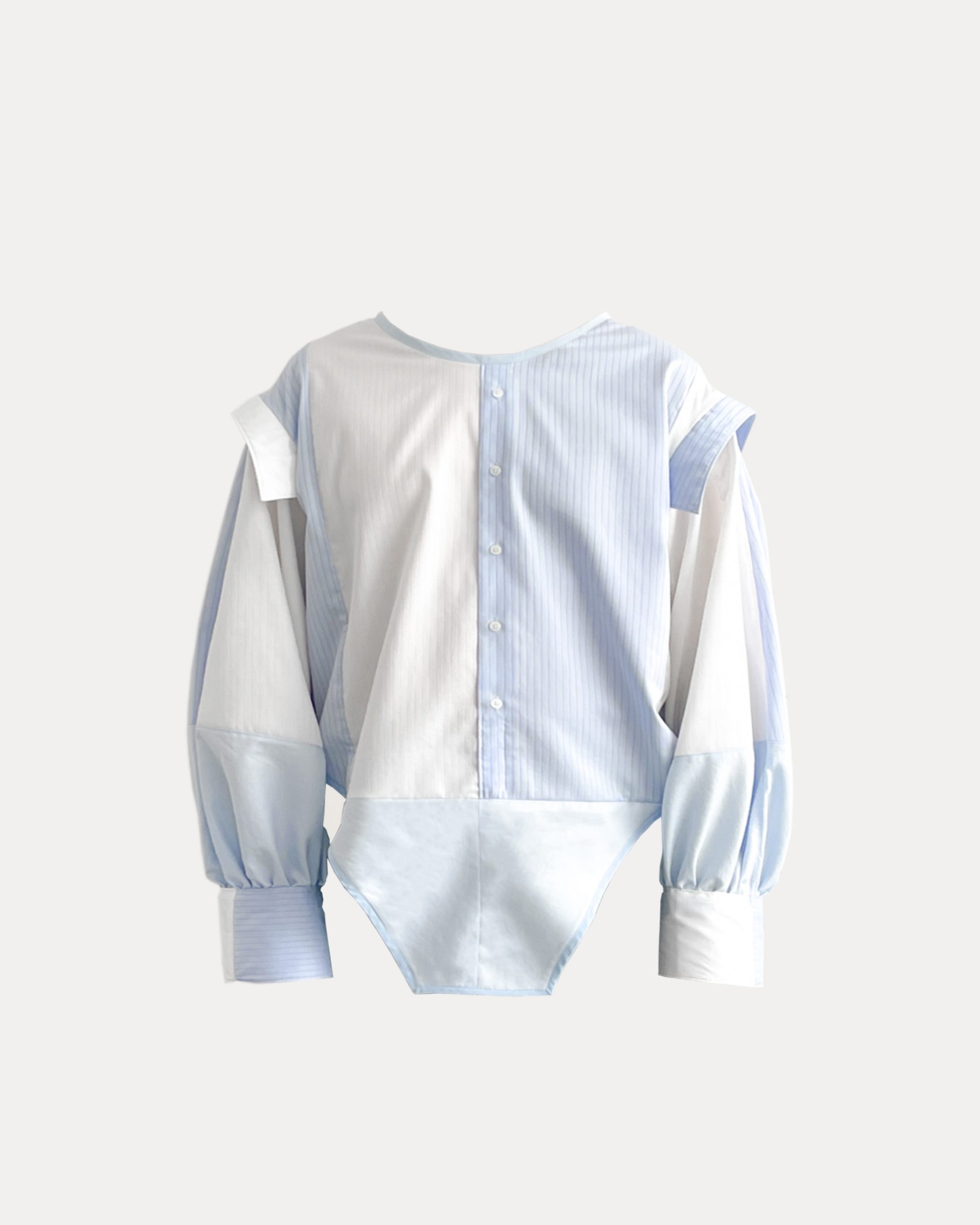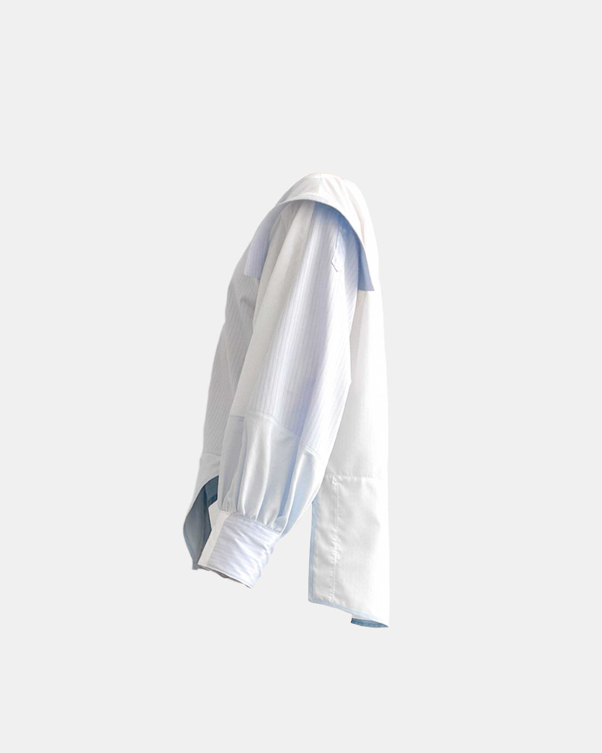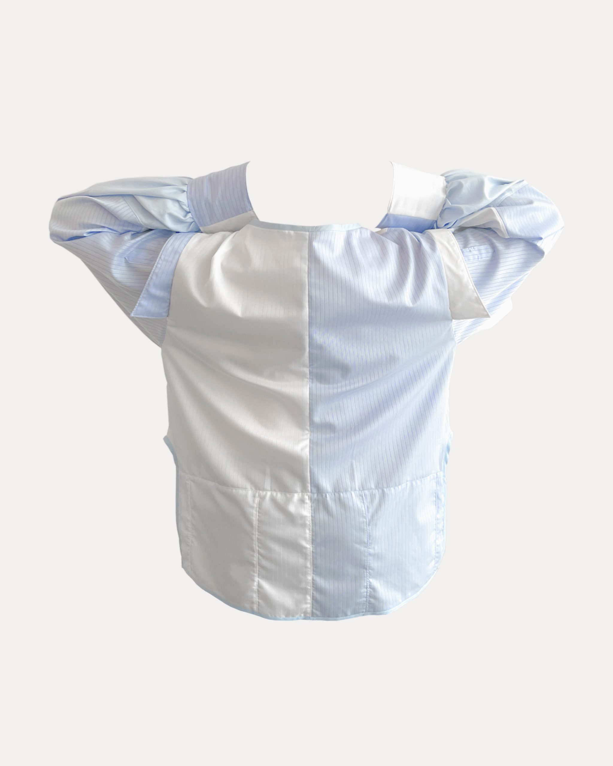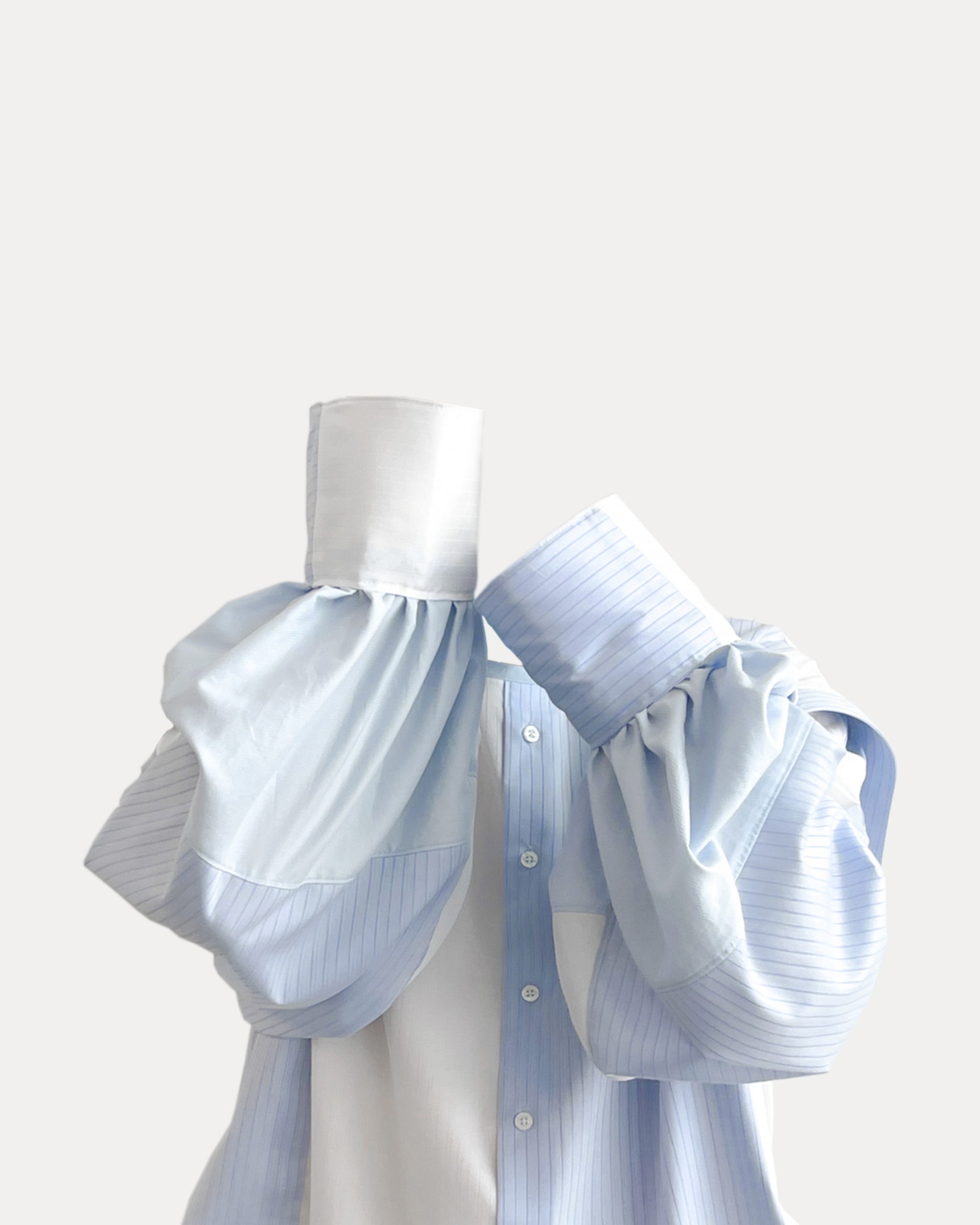 This is an upcycled shirt designed and reconstructed from three old shirts. My concept for this project focuses on size inclusivity by using three garments that no longer t me to create one that casually ts my current size. As a plus-size individual who is 6′ 3″ studying fashion design, I wanted to challenge the lack of accessibility and accommodation for diverse body types that are excluded by standardized sizing in the fashion industry. The prompt of this project stems from sustainability, from which I decided to deconstruct old garments and reconstruct them into a new design to promote design waste consciousness. Upcycling is an accessible and effective design intervention to address and reduce existing textile waste from overconsumption in the fashion industry.