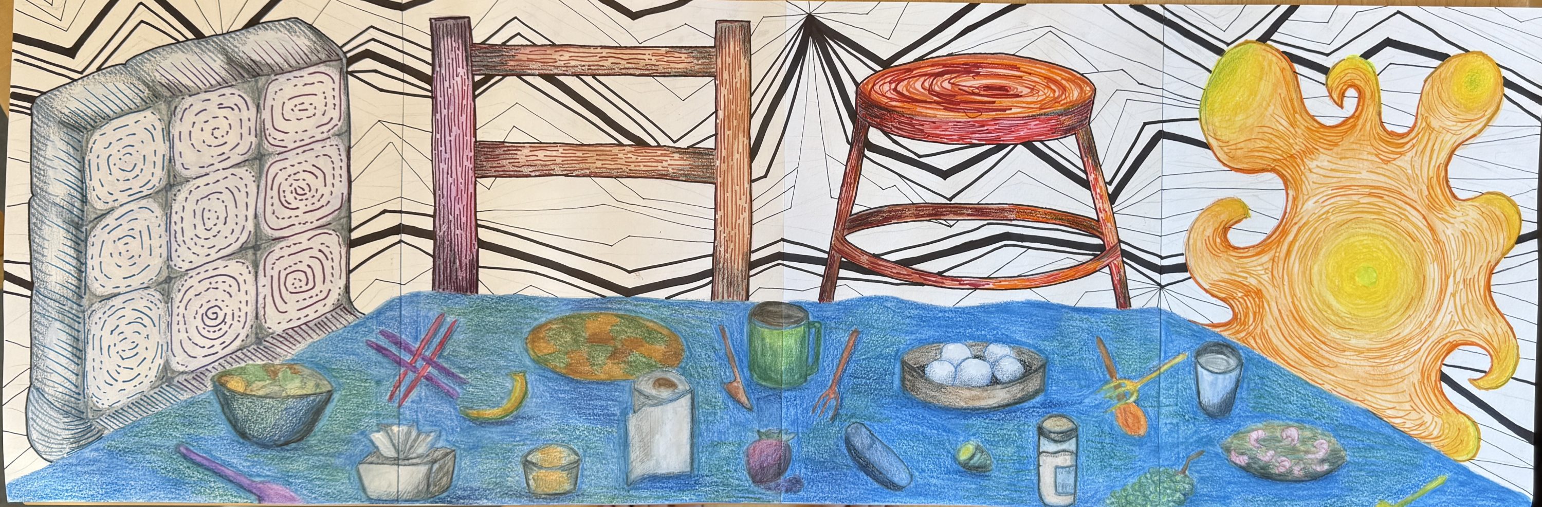 In the background, I used various sizes of Sharpie to create lines with sharp edges, creating a conflicting contrast to the foreground. These lines symbolize the “reality” I have to face when I leave the dinner table. Different boldness and directions of lines are used to emphasize the difficulties I will encounter when I leave this safe space. Through the transition of colors to bright green on the fourth chair, I hope to always find a place where I belong, even when facing struggles in life.