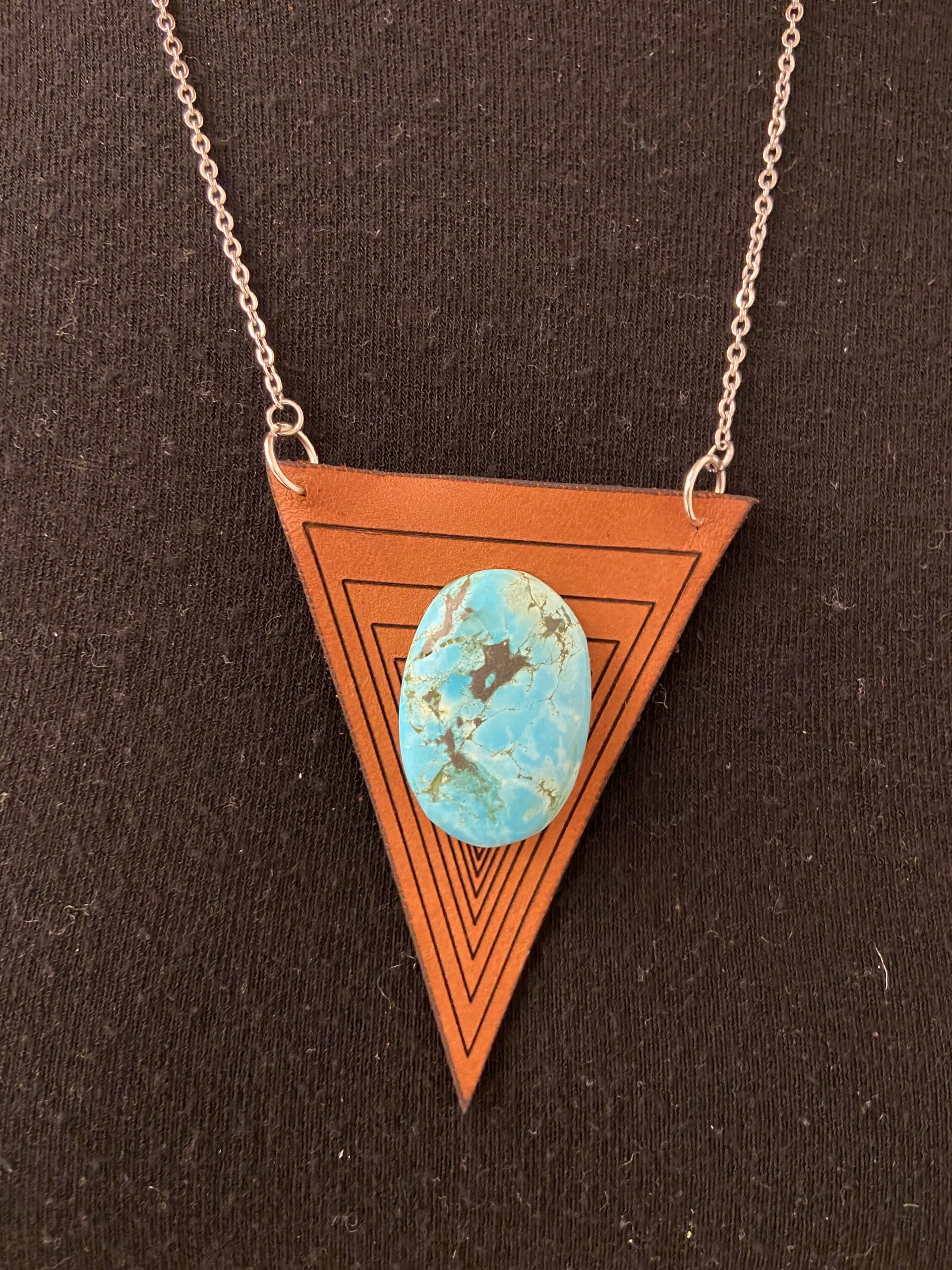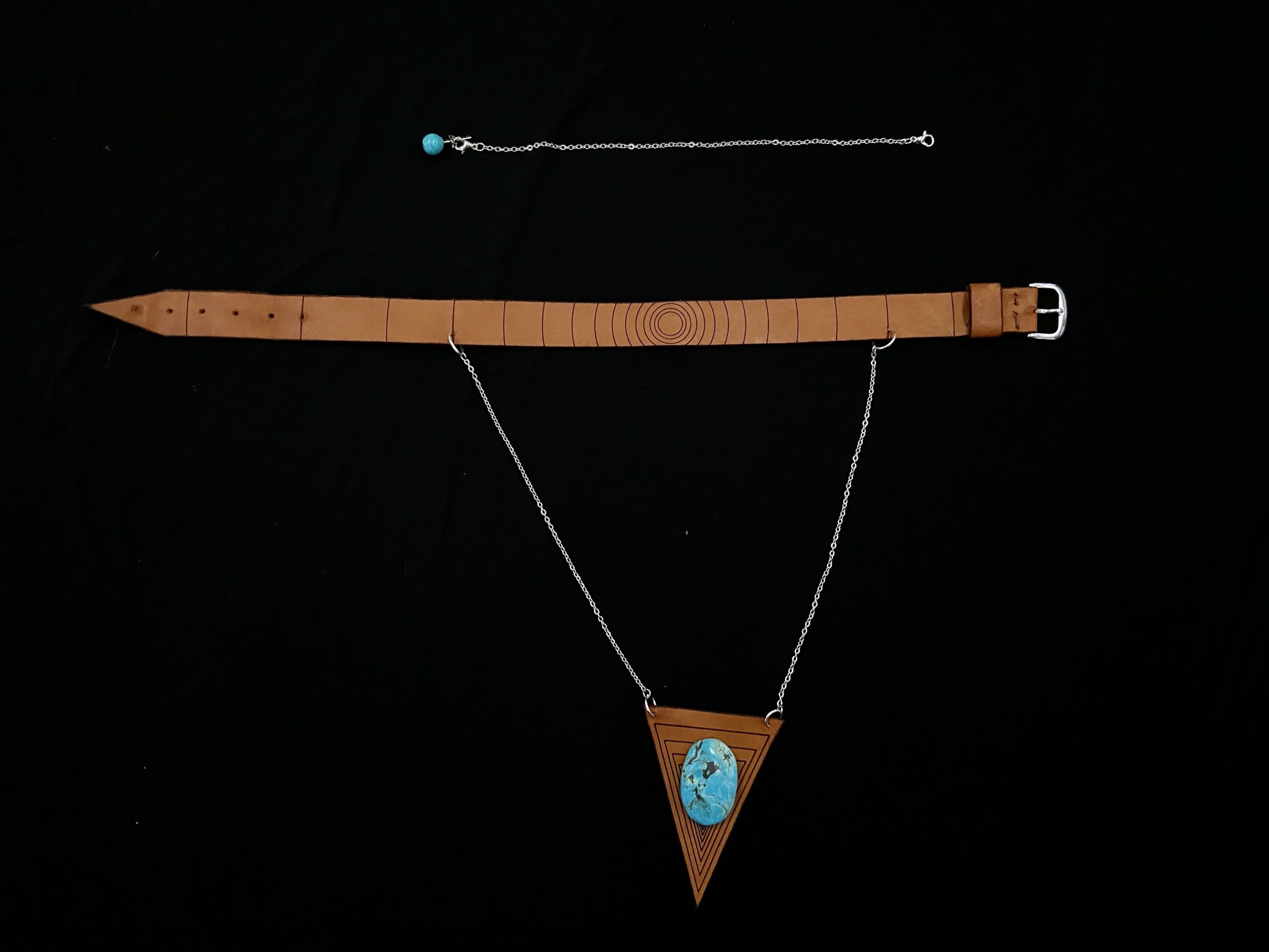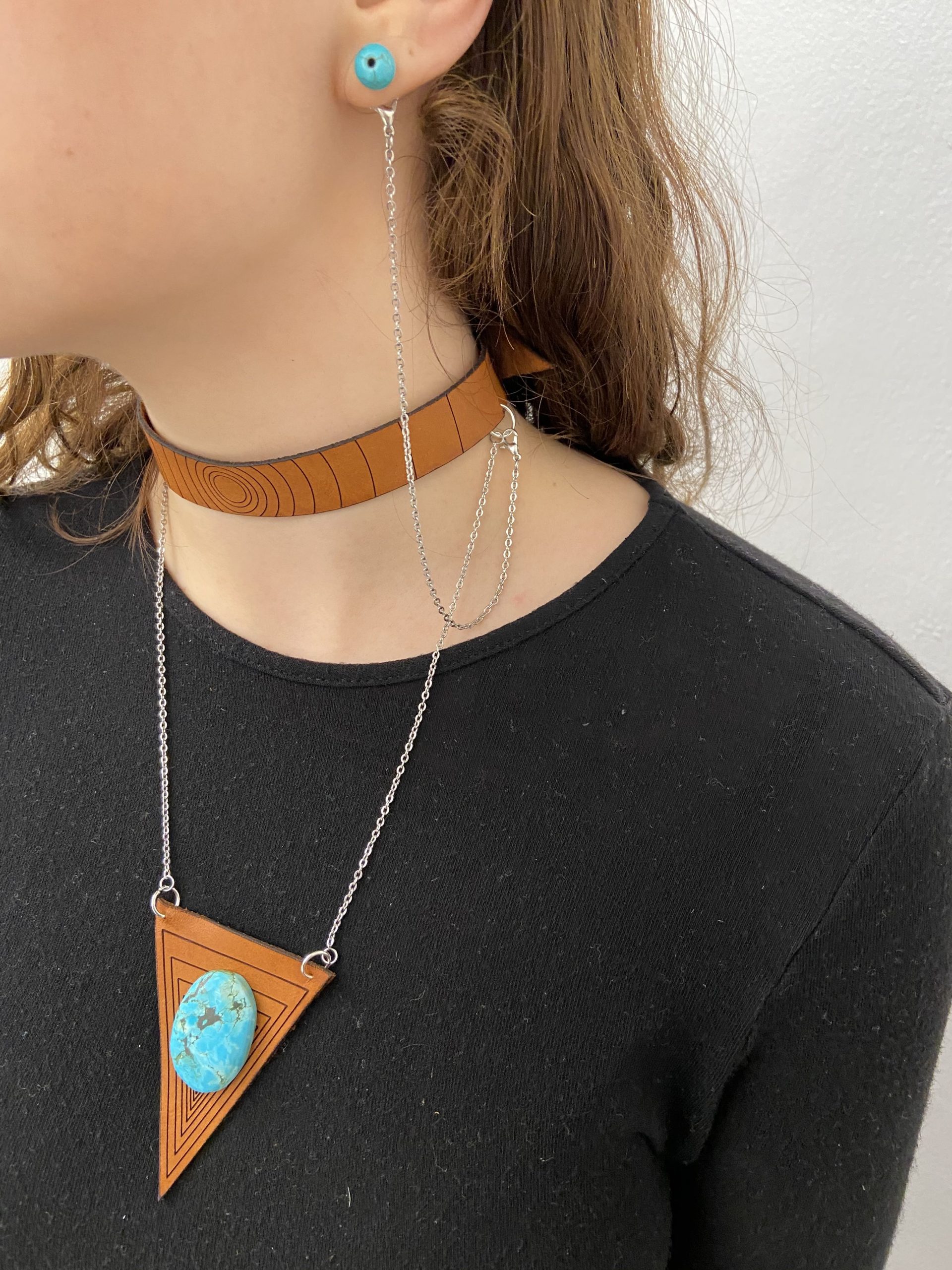 I designed this piece for my client, Nina, based on her tastes. She likes silver, leather, organic forms, geometric patterns, and natural stones. I have similar tastes, so I felt free to create a piece that aligned with my own design interests. I used leather as the base for the design to give the piece an earthy, natural look. I contrasted the organic nature of the material with sharp geometric designs etched in. I also used aquamarines, as the stone has a beautiful texture and a color that compliments the shade of leather. The three elements of the jewelry piece are all connected by stainless steel chains and the earring chain is fully detachable. The back of the choker is connected using a watch buckle.