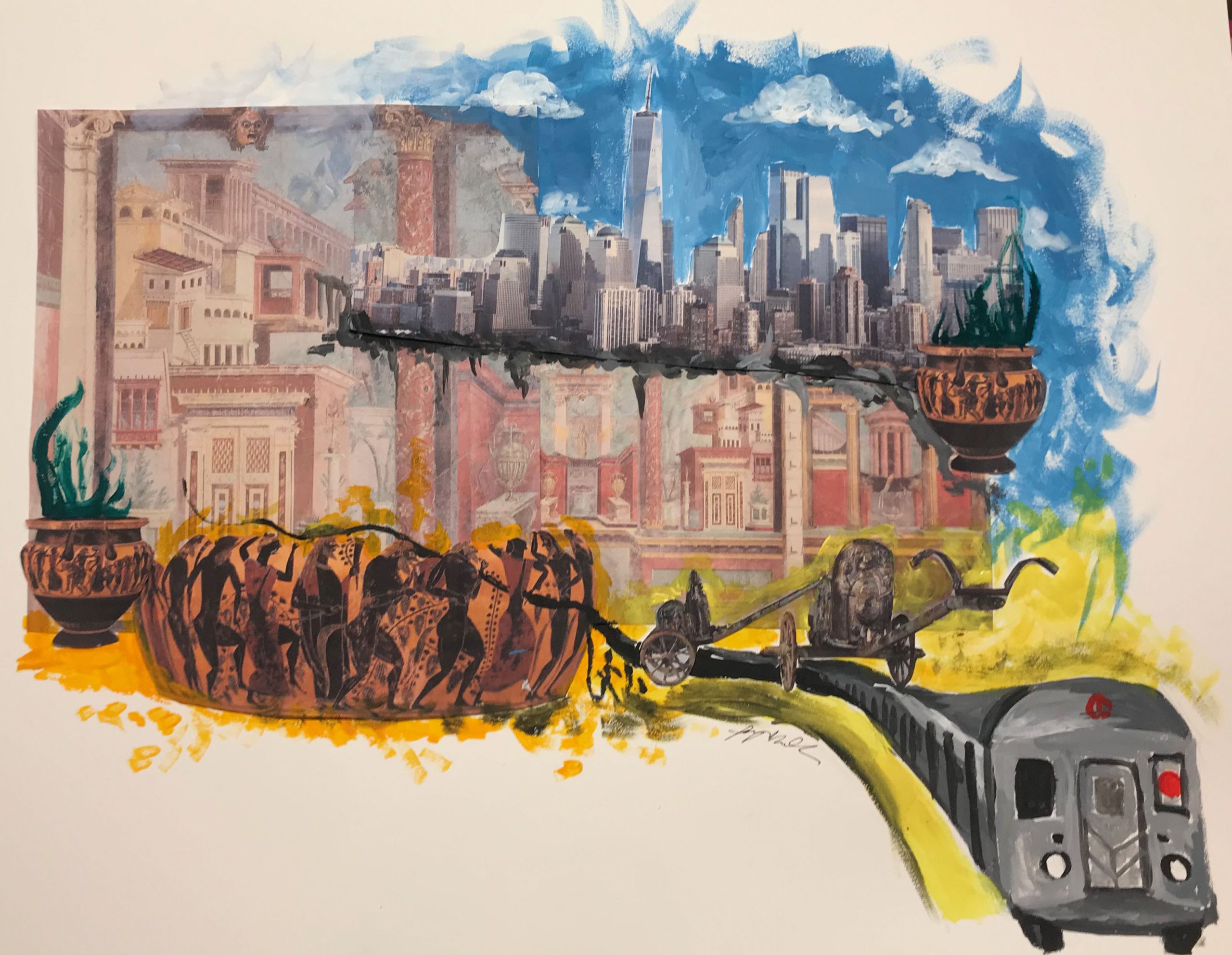 Three objects that I believed resonated with me was the “Bronze Chariot inlaid with ivory” from the 6th century B.C., the “Cubiculum (bedroom) from the Villa of P. Fannius Synistor at Boscoreale” from 40-50 B.C., and the “Terracotta column-krater Bowl”. I took these works, and blended them into life in New York City, and how I depict my own life living in Brooklyn. For example, I took the Chariot object that I chose, and placed it within the shadow of the NYC subway, and thought of the relationships between transportation today versus in the 6th century. I think the point of my piece was to show a juxtaposition, and how much we differentiate from our past. However, many of the inventions created in that past resonate and impact our present deeply, because without the artists of the past and their insightful ideas, we might still be stuck in prehistoric times today. Living in Brooklyn, NY, it’s important to study my surroundings as well as the people around me. I wanted to create a piece to show the audience what its like to look at New York City through an artist’s eyes, and how much color and form we see in every day objects. This is why the objects of the past resonate with me, because looking at the objects of our everyday lives versus the past is important to understanding our environment and where we stand in this world.