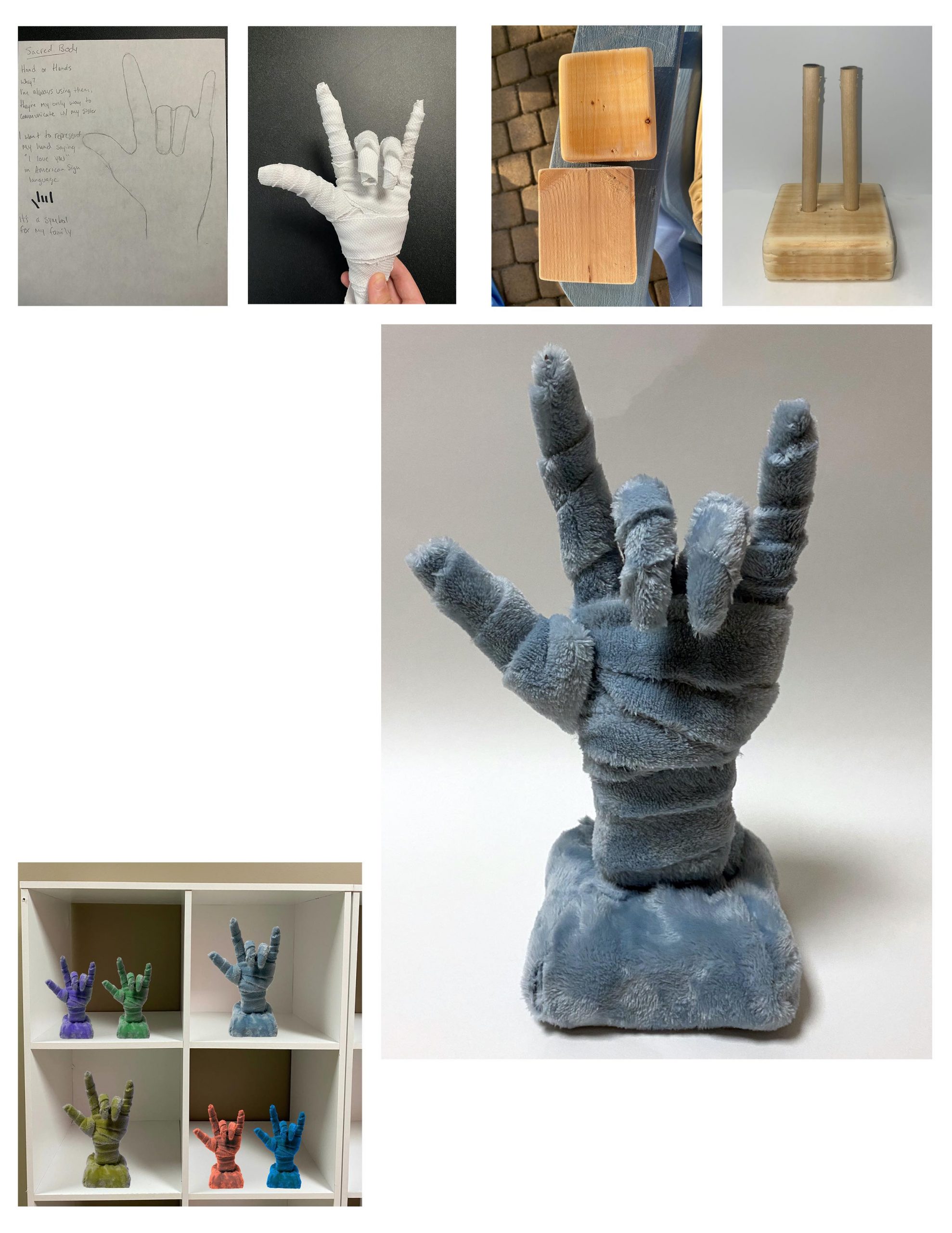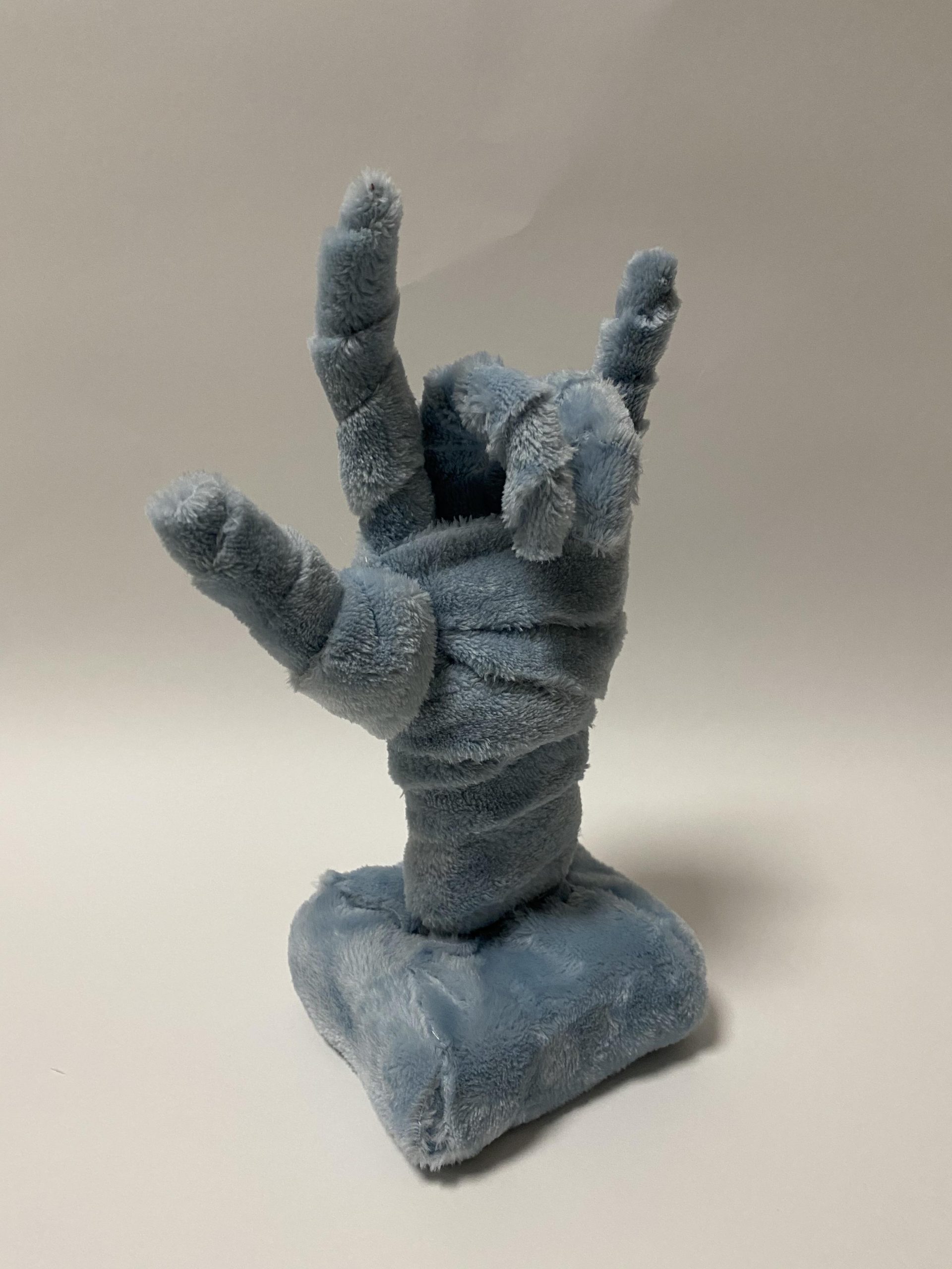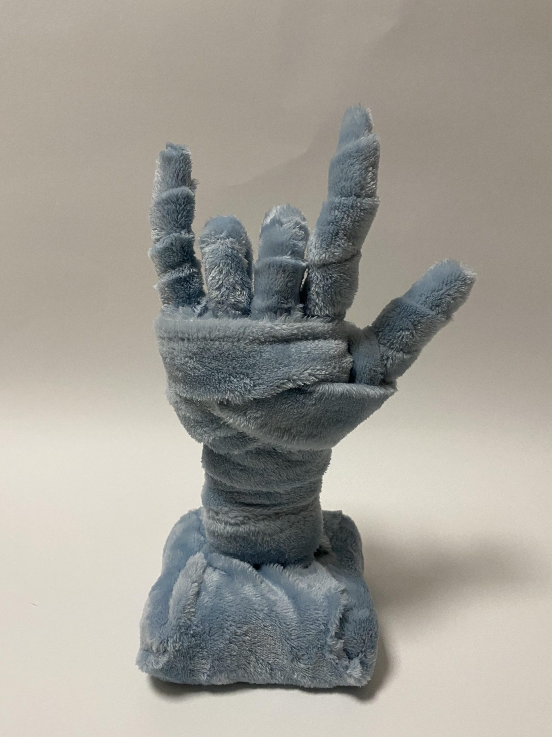 Silent Love is dedicated to and one hundred percent inspired by my sister, Anna, who means the world to me. She is deaf and mute leaving sign language to be our only form of communication. The sculpture is of my hand saying, “I love you” in American Sign Language. Since she’s the inspiration for my concept, I let Anna choose the fabric for my final piece and she picked the fluffiest material in the store. Despite being extremely difficult to work with, I was committed to using that fabric for her. My hands are sacred to me as an artist, but the ability to use my hands for making will never compare to the ability to communicate with Anna.