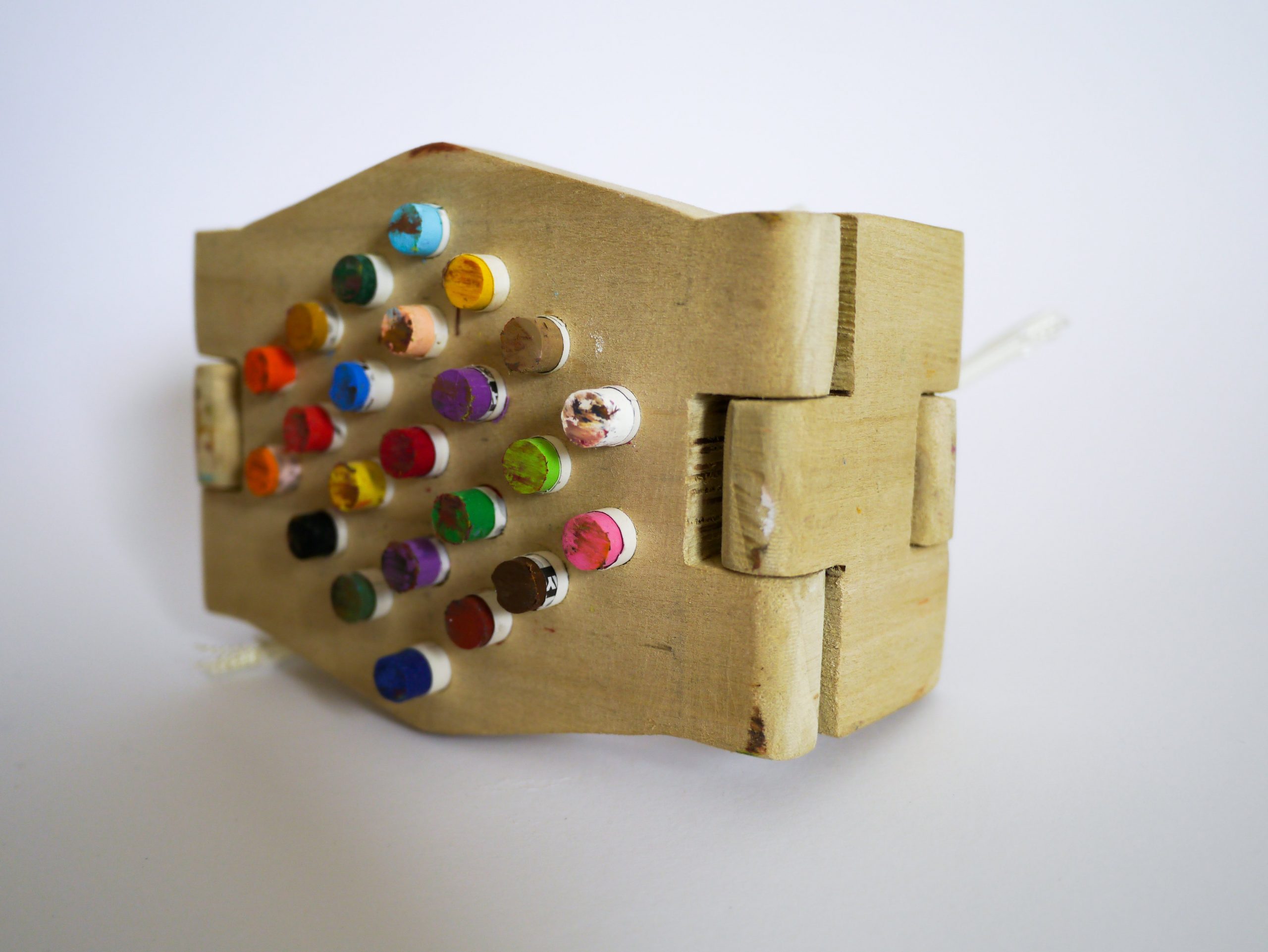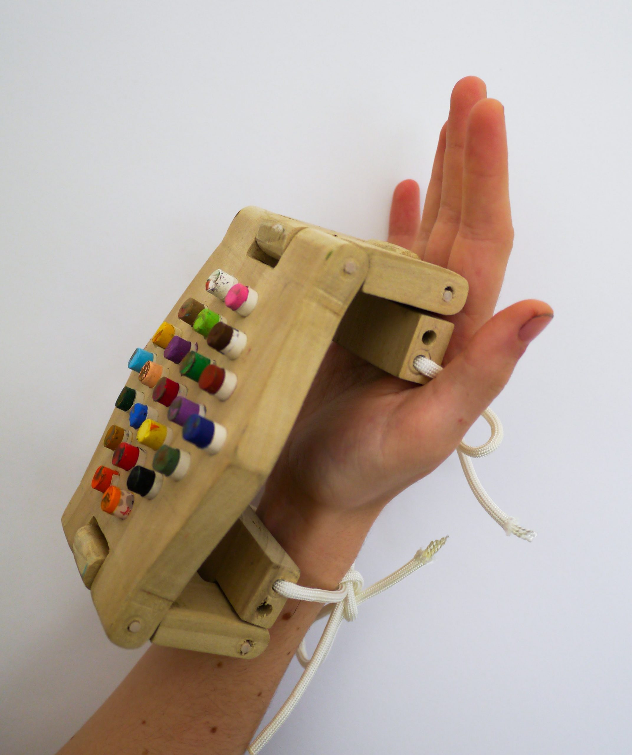 Medium: Hand extension made of wood, oil pastel, and string