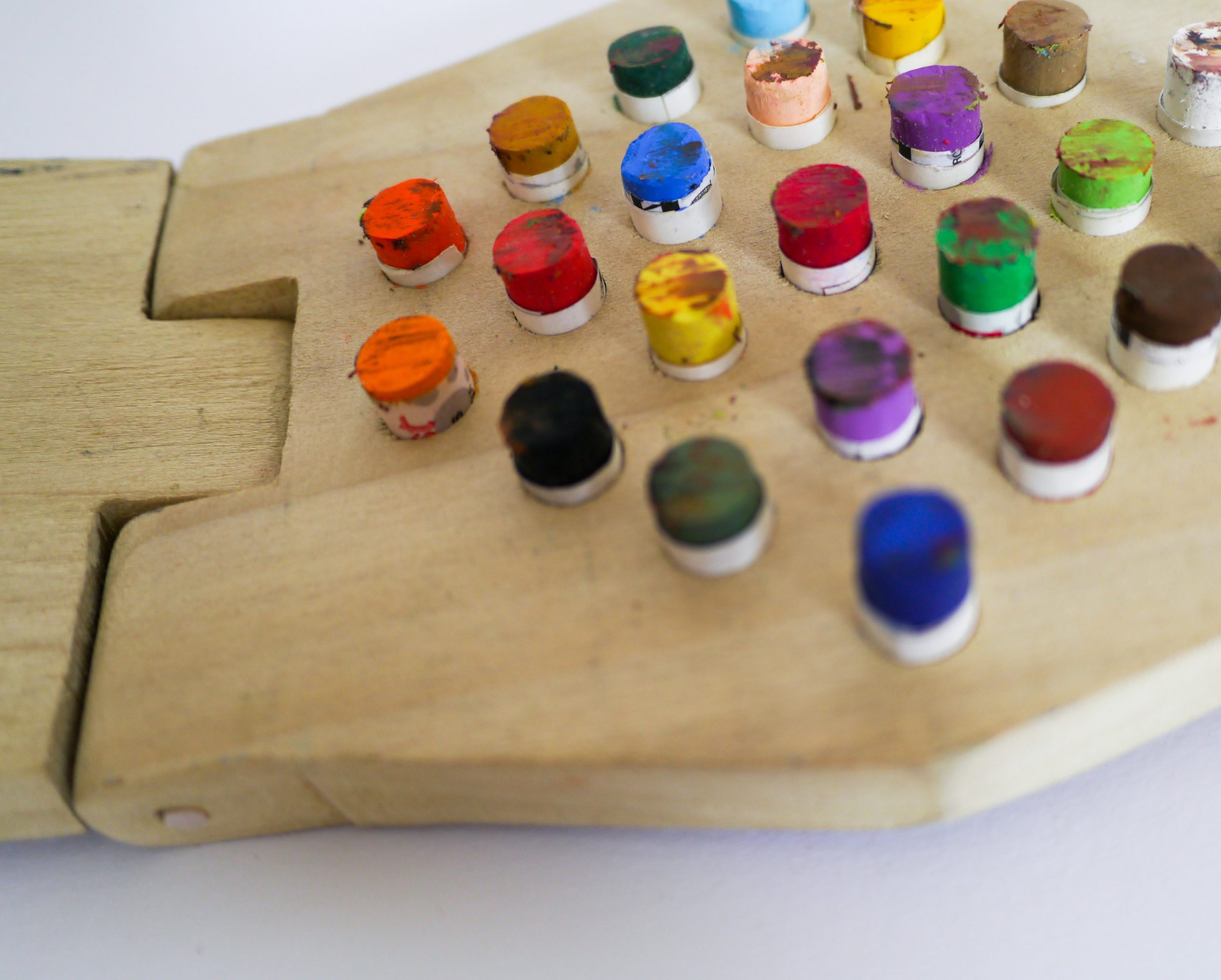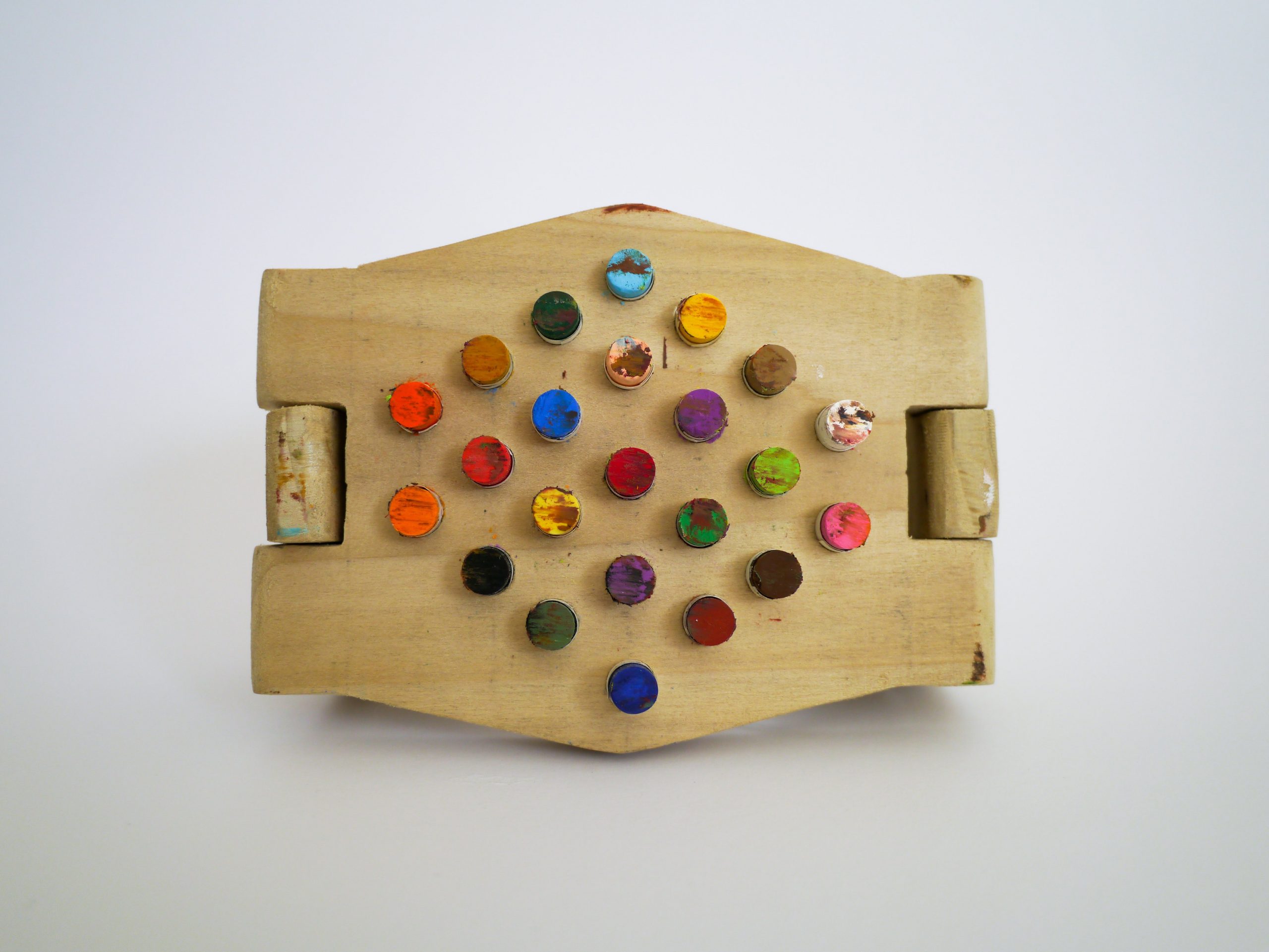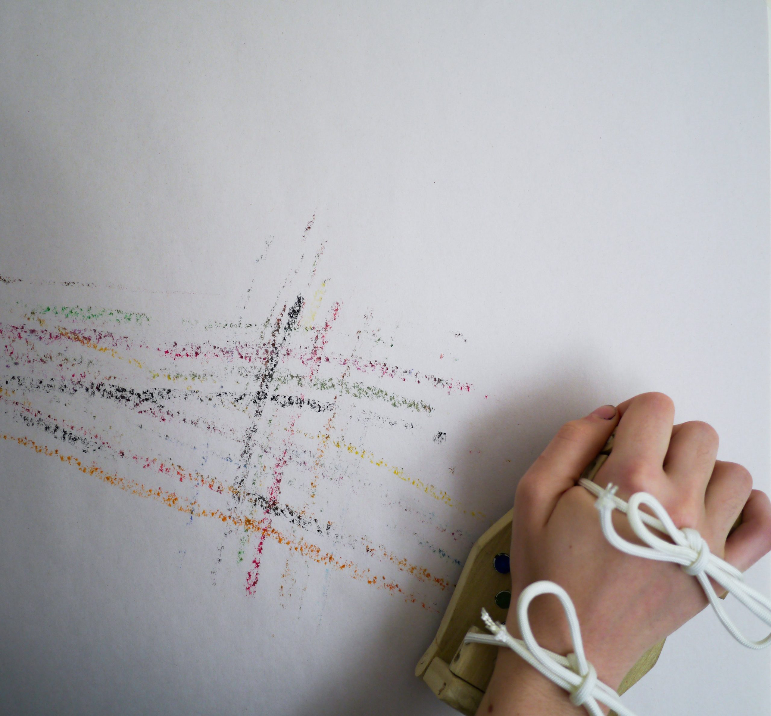 The Chunk Drawing Tool prompts experimentation with mark-making and abstraction. It allows the user to create large strokes made up of smaller, individual lines. Designed to improve upon the hand’s ability to hold a group of drawing materials simultaneously. Made to fit oil pastels, but can also fit pens, pencils, etc. through variation in hole size. Through color variation and even spacing between drawing utensils, the user is able to produce unique drawings. Hinged arms offer multiple approaches to wearing the Chunk Drawing Tool, including on the hand, arm, or leg. When worn on the hand, hinges create organic vertical movement, furthering abstraction.