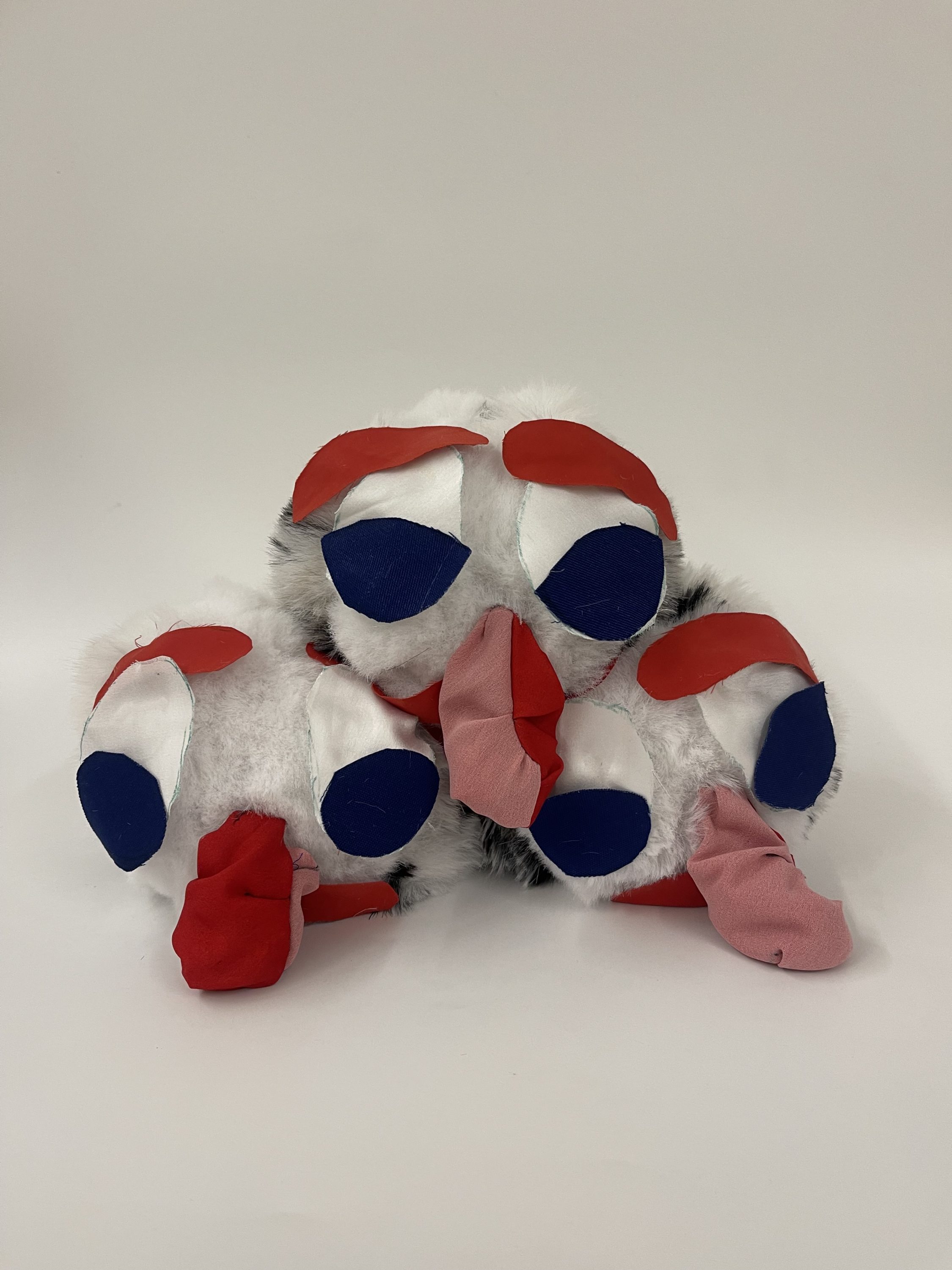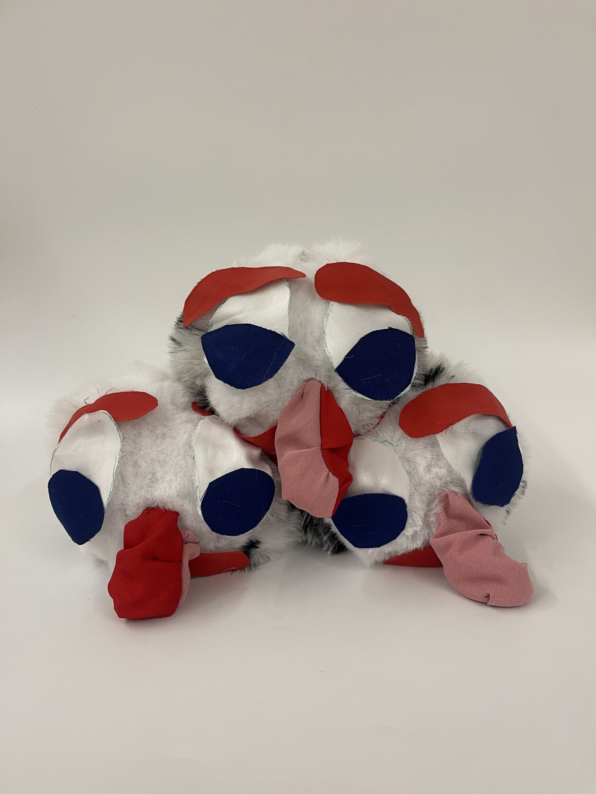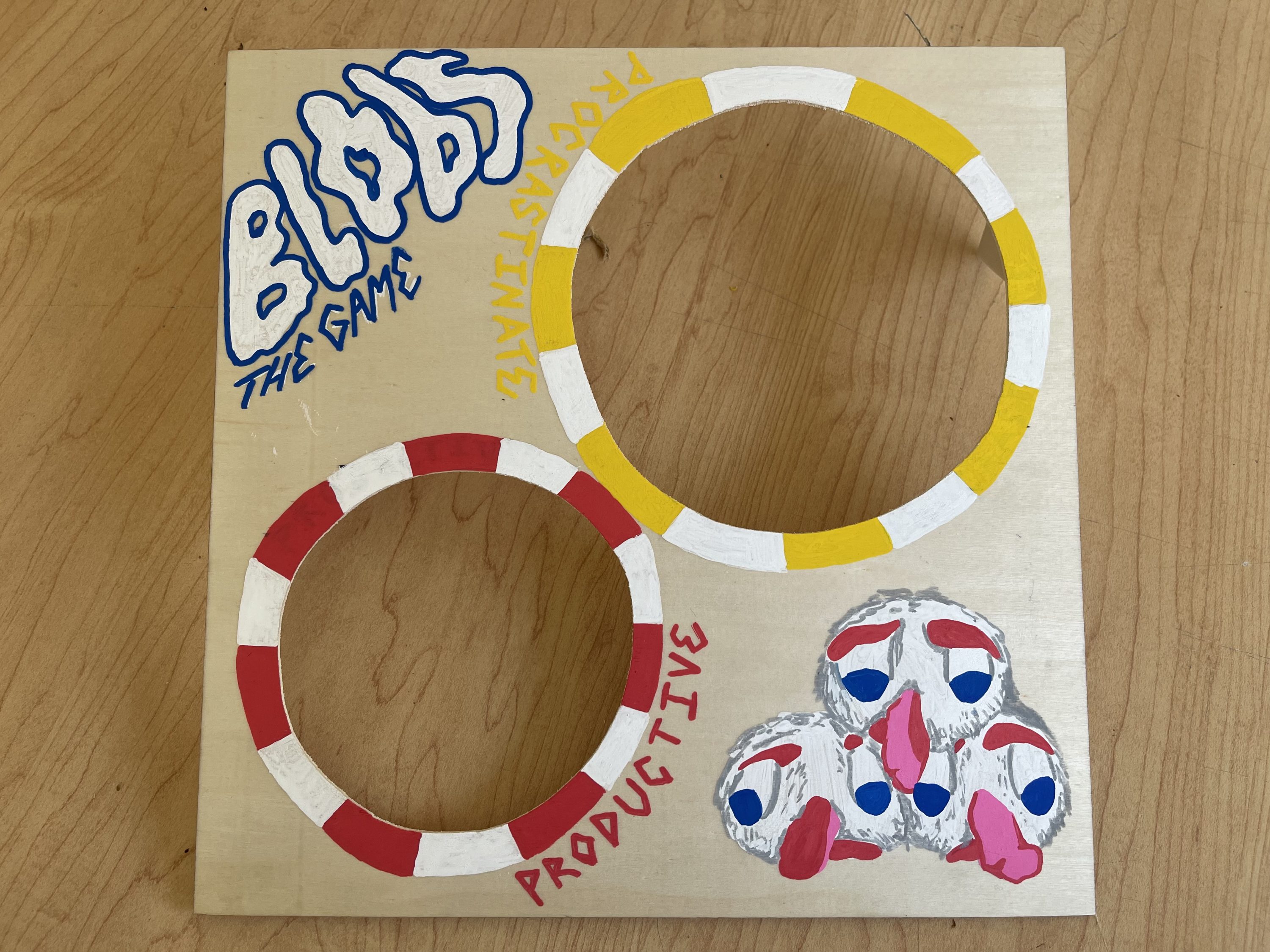 My project represents the personification of my art block. I chose to document this through intentional materials, weight, and a video documentation. Choosing fluffy, light, materials, the blobs appear approachable and interactive. When actually held, they carry a heavier weight than they appear. This is meant to symbolize the weight I feel experiencing art block and how things can appear a lot lighter on the outside. Accompanied with the blobs is a carnival style game that prompts the audience to interact further with the piece. As most carnival games, it’s intentionally rigged so that the blobs only make it into the “Procrastination” hole, given that’s all they wish to do.
