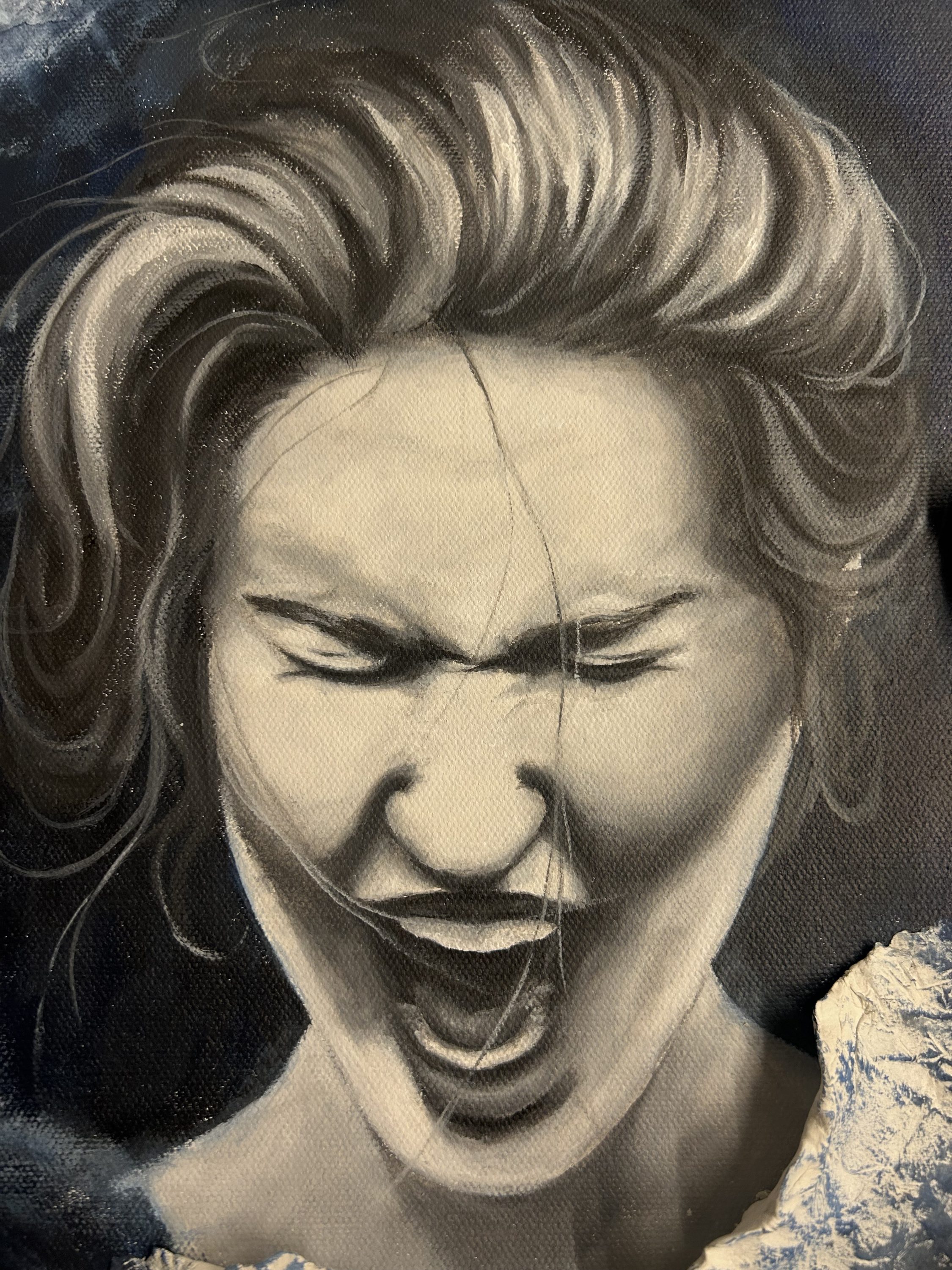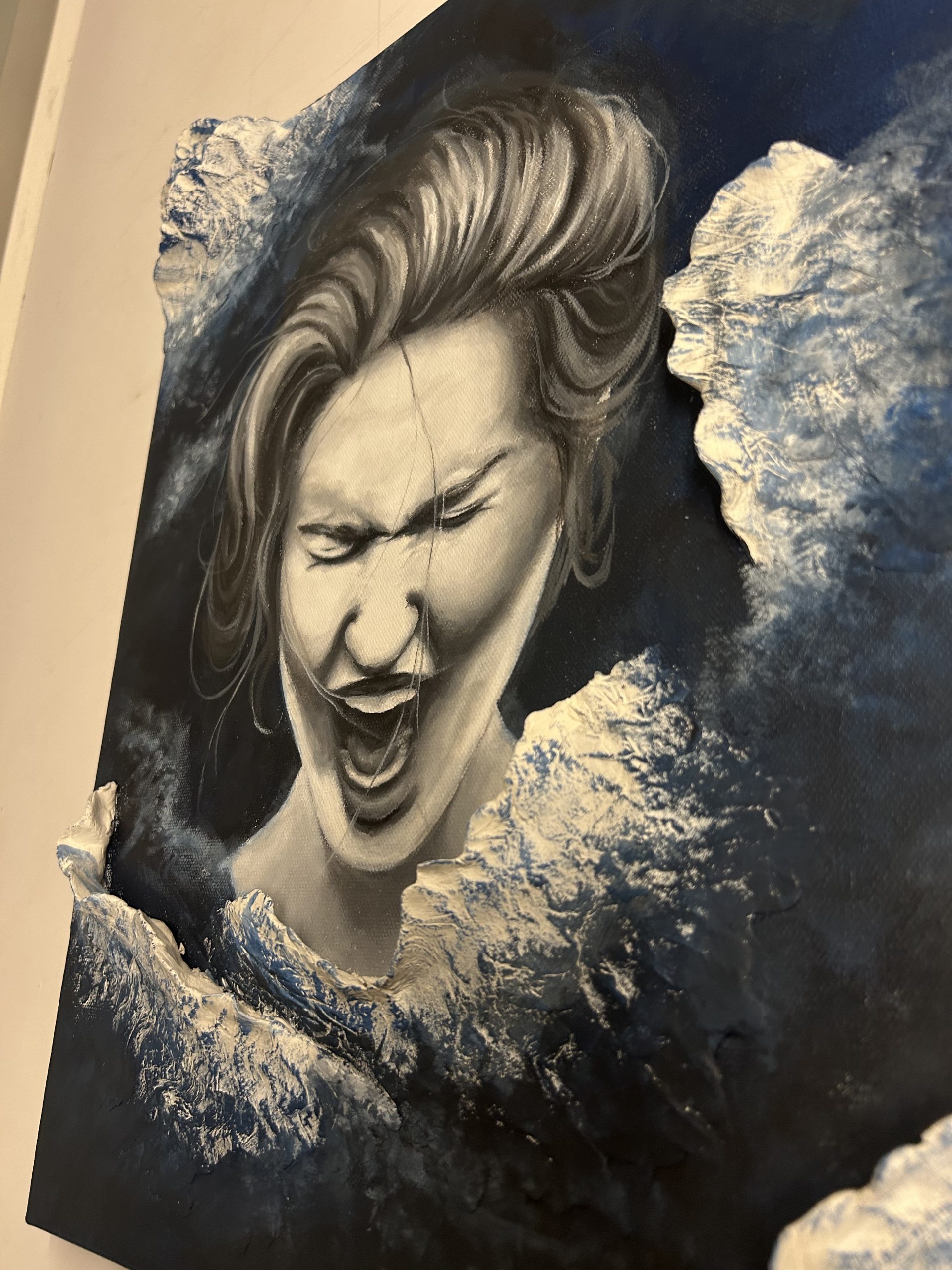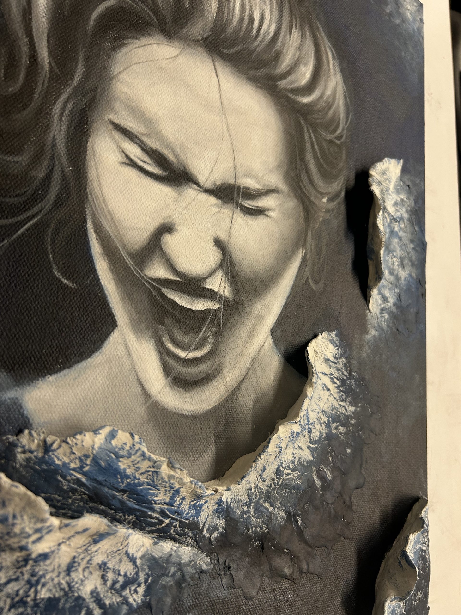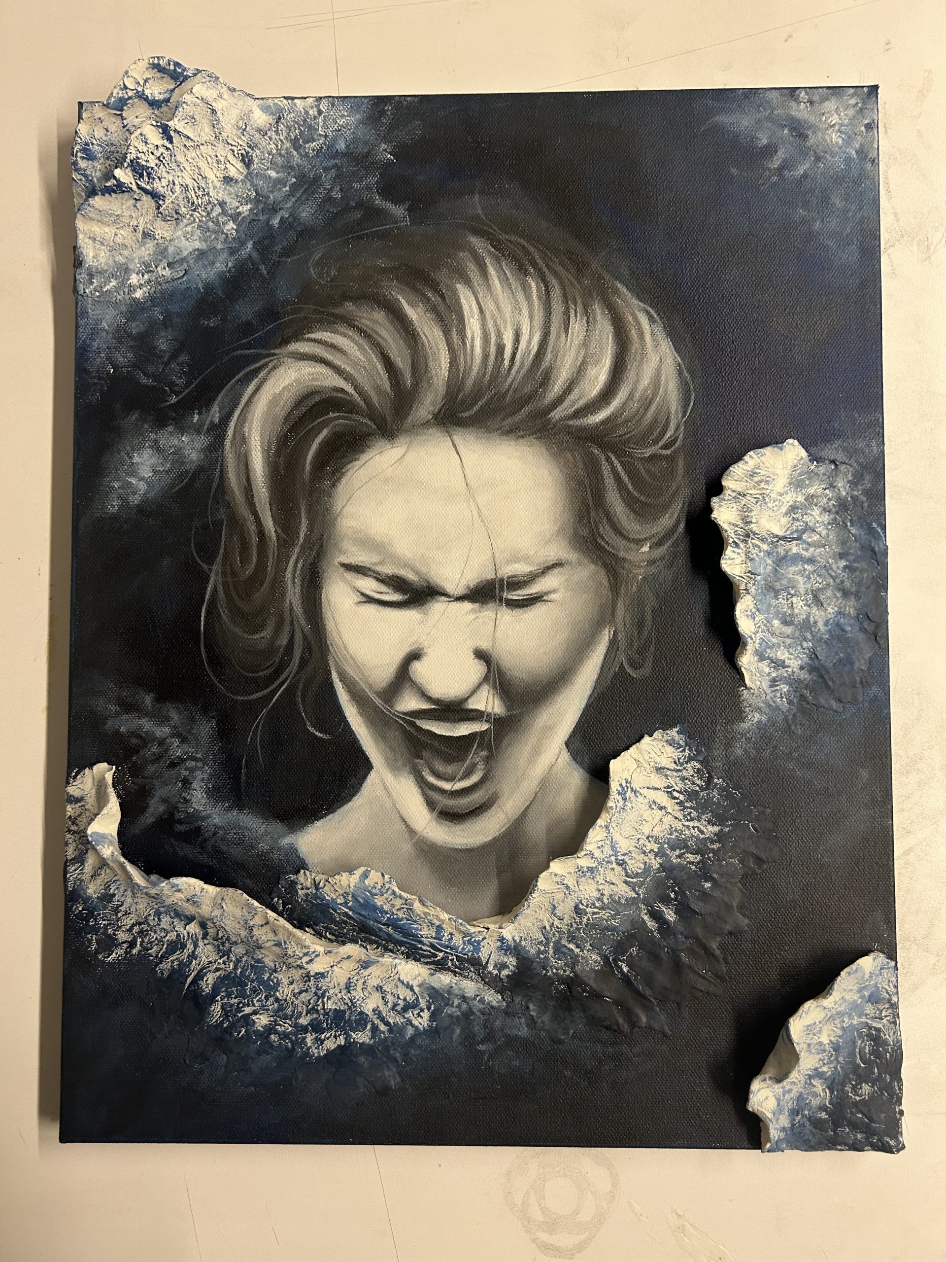 I drew a black and white realistic version of Andromeda drowning in the sea instead of being chained to the rock, like she was in the original myth. I wanted to pay homage to all the women in Greek mythology whose beauty was the cause of their demise (in Andromeda’s case, almost her demise). I chose to paint her in black and white to hint at the story of Medusa and how she was turned into a viscous monster because of her looks. The colour choice resembles the stone that her victims would turn into.