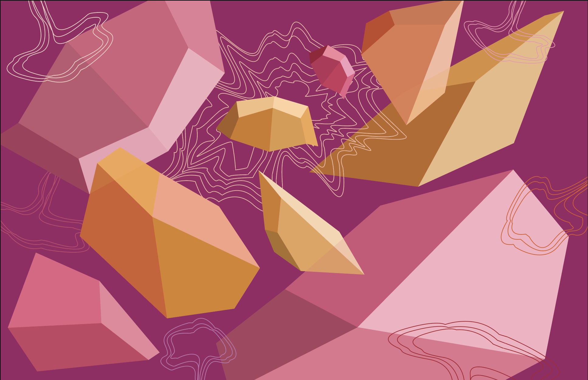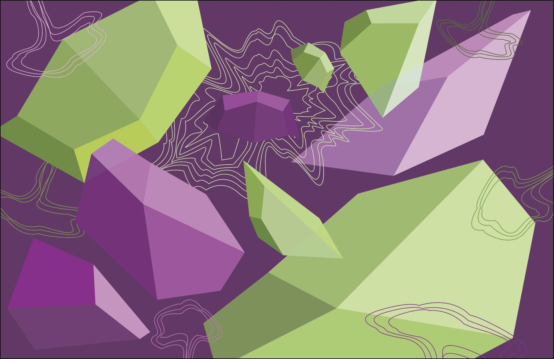 Prompt: In Illustrator, create a composition that combines your original invented forms with your pen tool tracings of your organic shapes to enhance the spatial illusions you are creating. Decide on a light source direction and fill the facets of your forms in keeping with that source. Take your composition and make two versions. Use both color and value to create 2 entirely different moods in each.