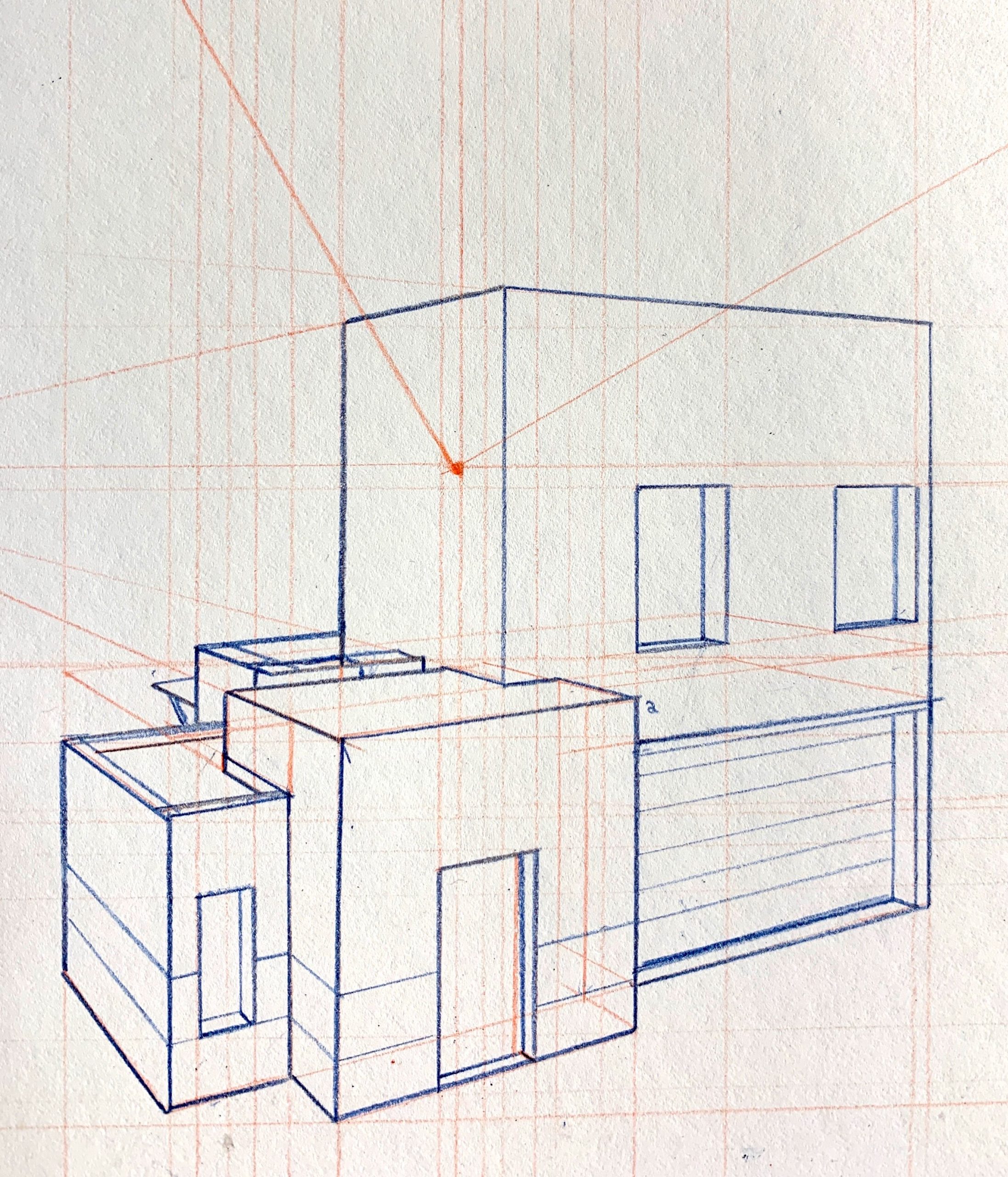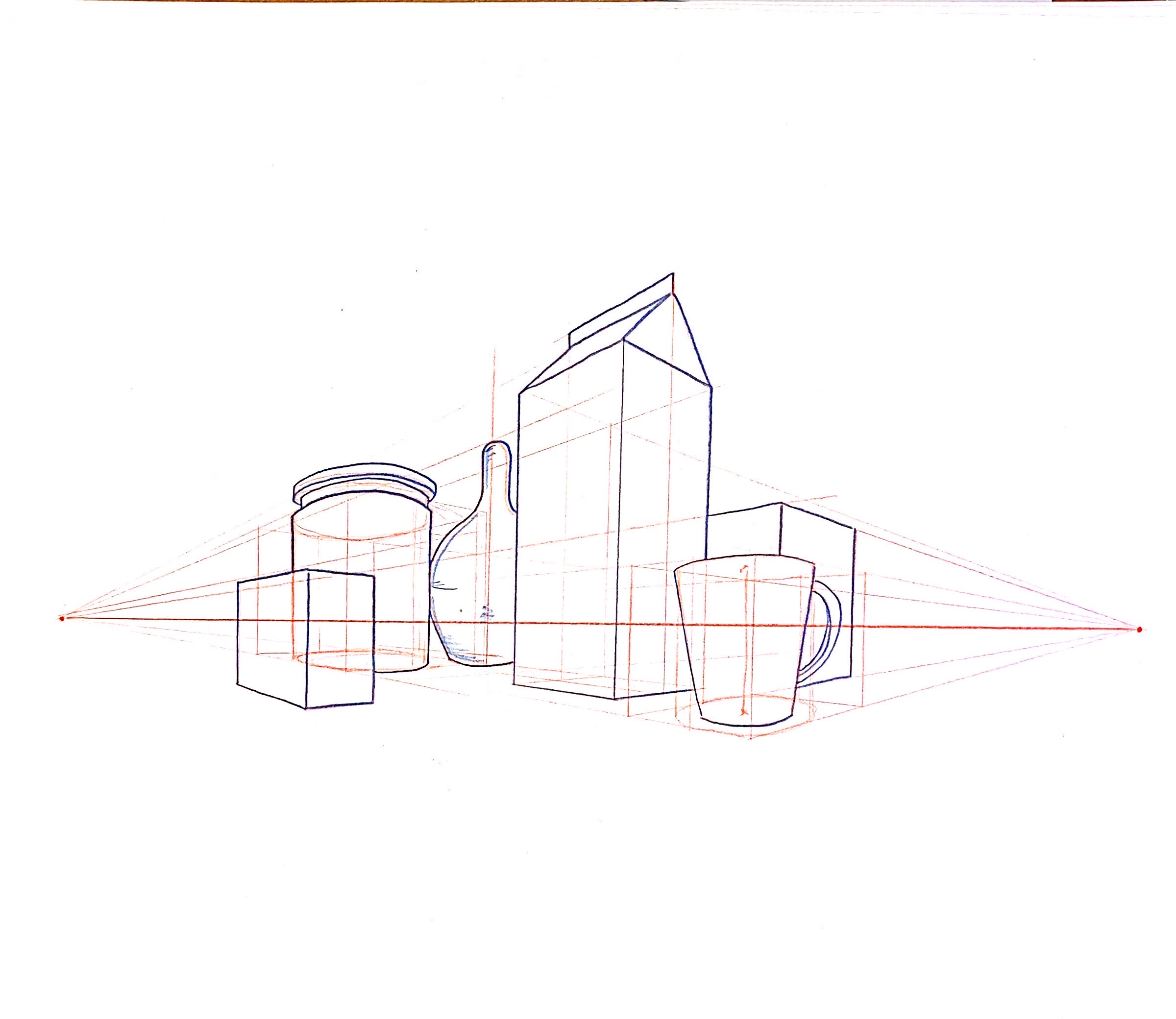 Prompt: These are 2 point perspective sketches for class. The first image is based on a still life of various household items. The second one is a house design for a homestead along a lake in Russia.