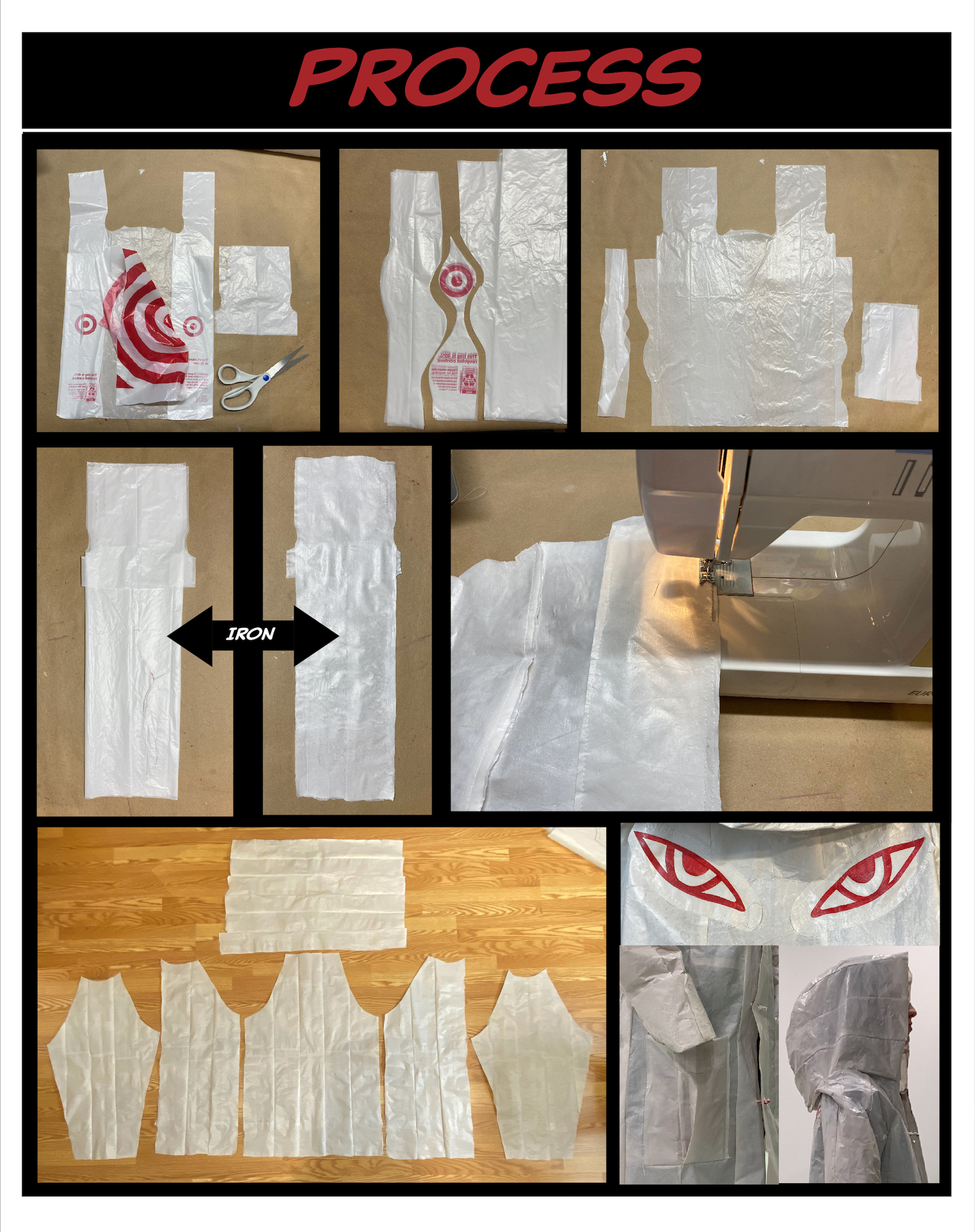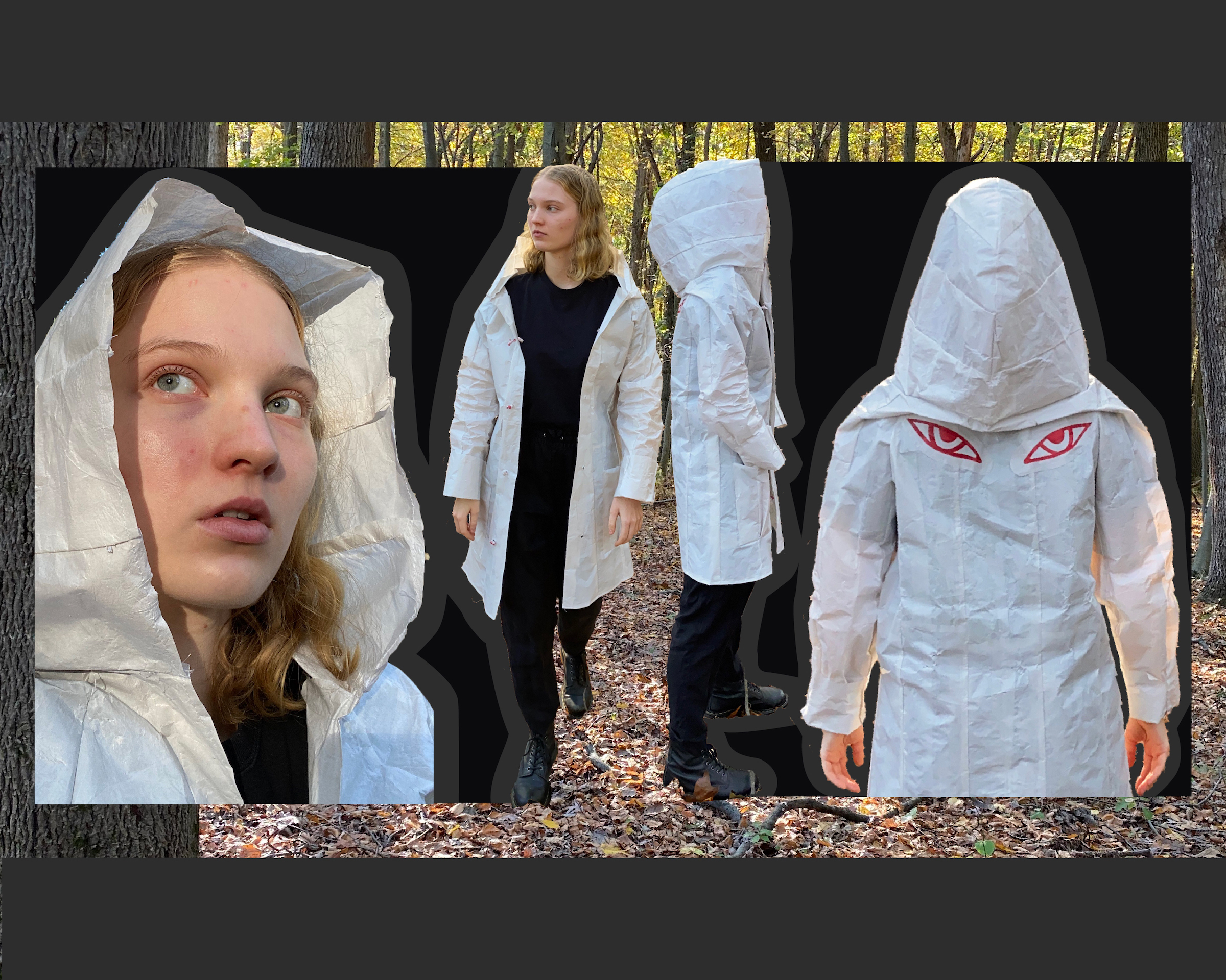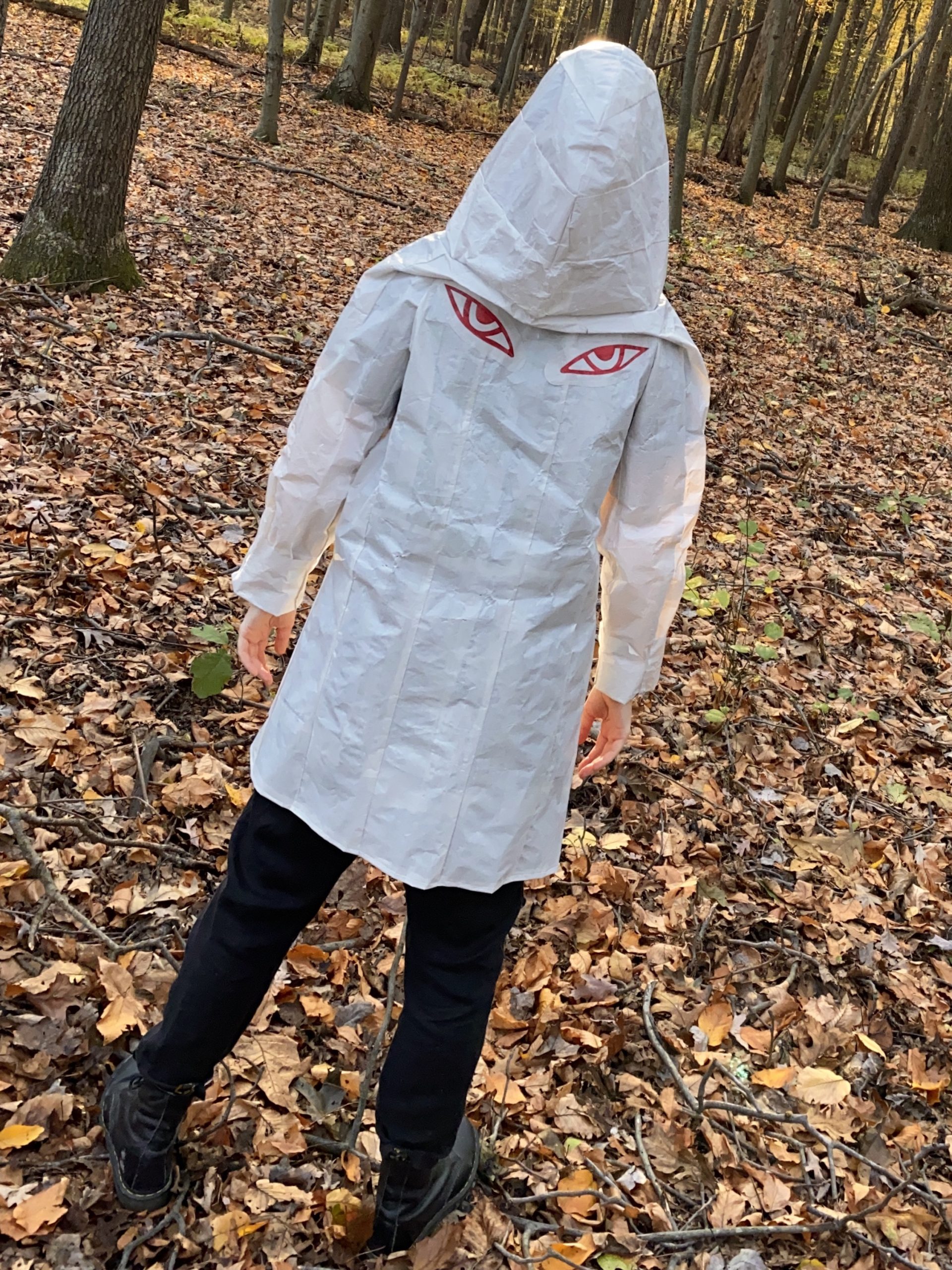The Watcher is a graphic body superhero with an invisibility cloak that allows them to be hidden among society and observe their surroundings to fight crime. I was inspired by Harry Potter’s invisibility cloak and Assassins Creed as well as the trench coats superheroes wear as disguises when they are in public. There also is a hidden element to the costume. In order for The Watcher to activate their powers, they need to fasten the coat together and put on the hood. To signify the use of the “invisibility powers” and to prevent suspicion from the public, the eyes on the back are only visible when the hood is up.