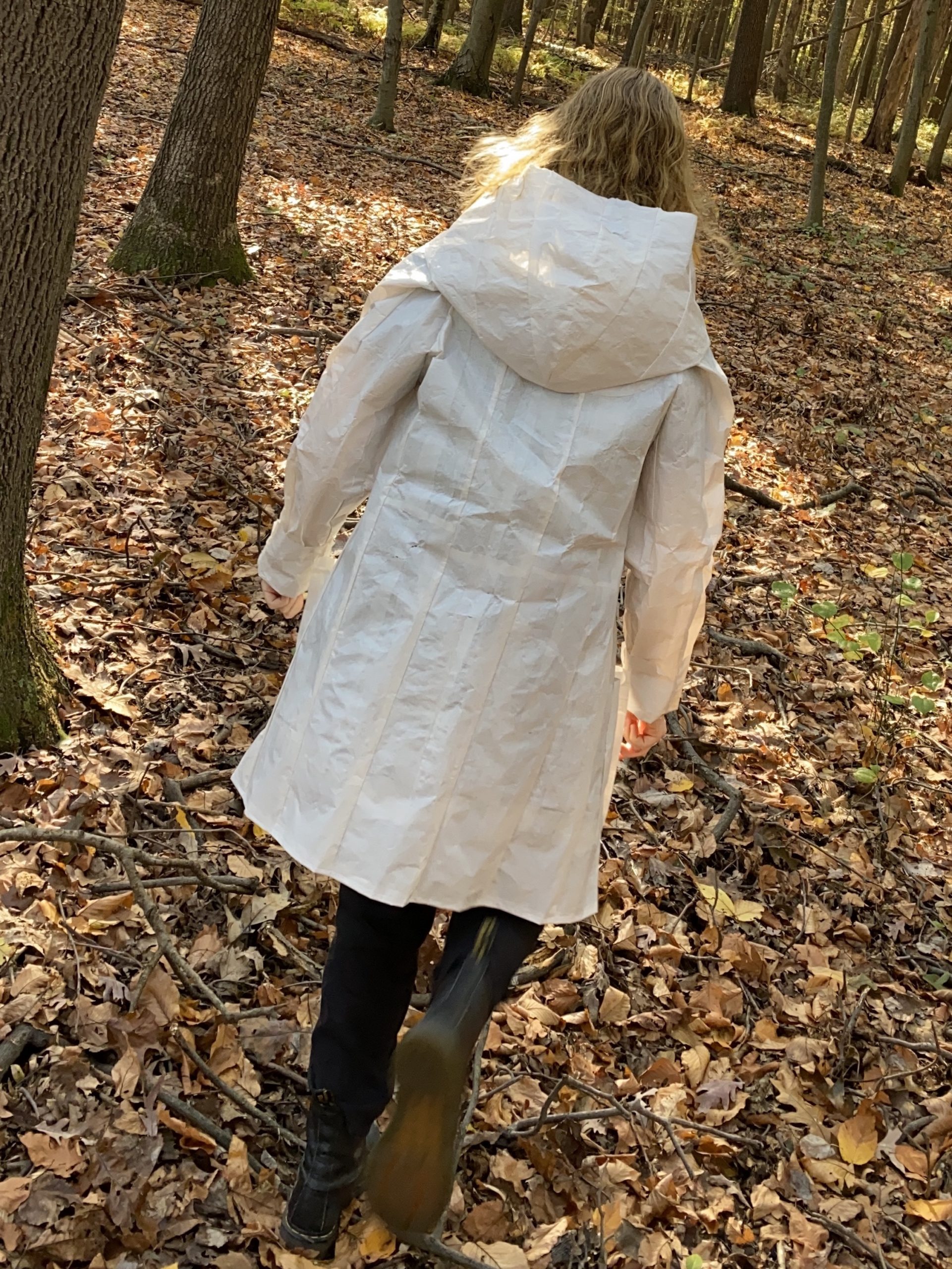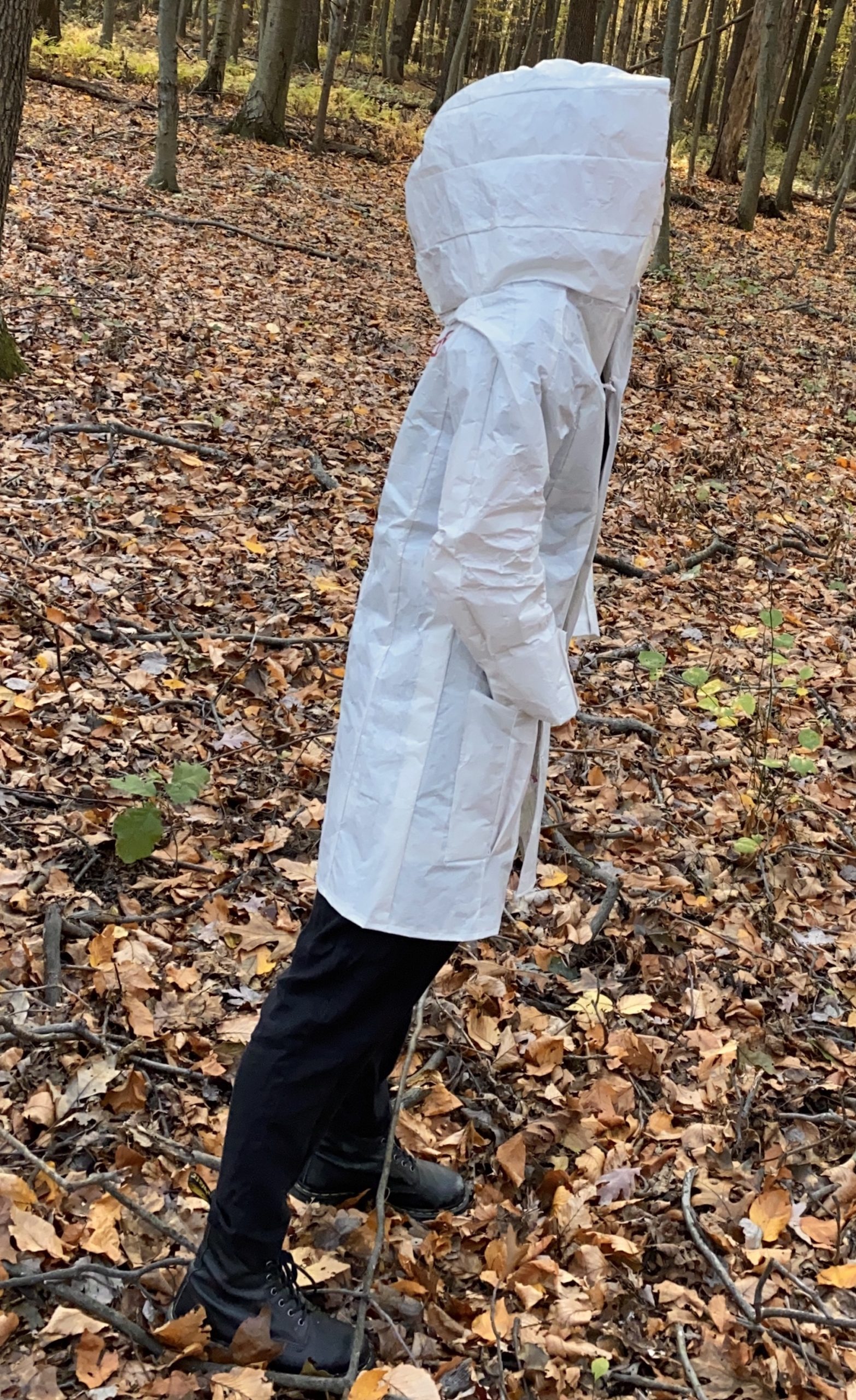 The garment is entirely made of plastic bags. The panels are created by cutting out the inked area on 55 bags, folding them into rectangles, and ironing the rectangles to fuse the plastic. The ironed bags are sewn together to create the panels in the garment which are then assembled together to create the coat and the pockets. The fastenings on the front of the coat are knotted pieces of the inked bag that were cut out to create the panels. The eyes are fused sections of the inked plastic bags which were cut and sewn to the back of the coat.