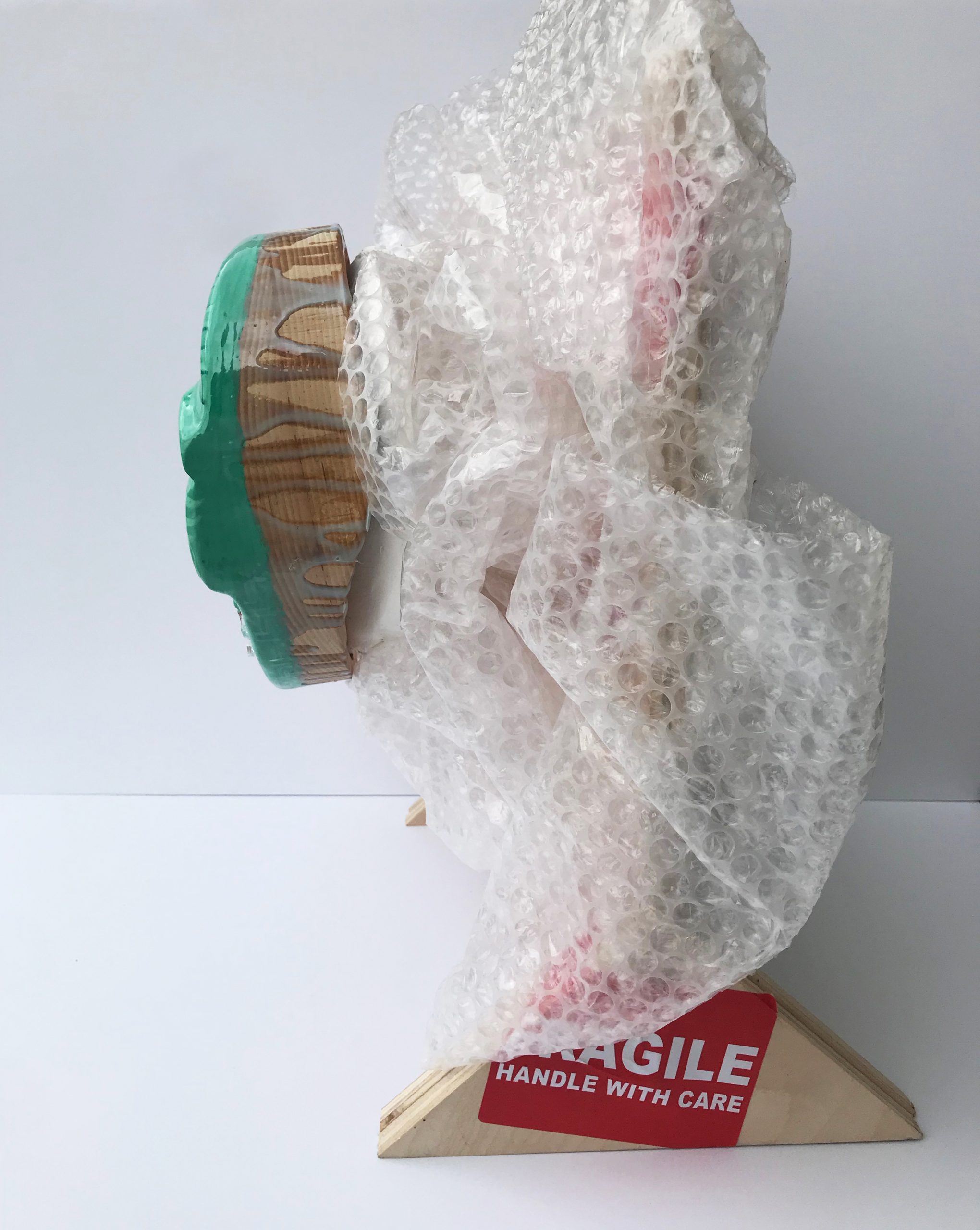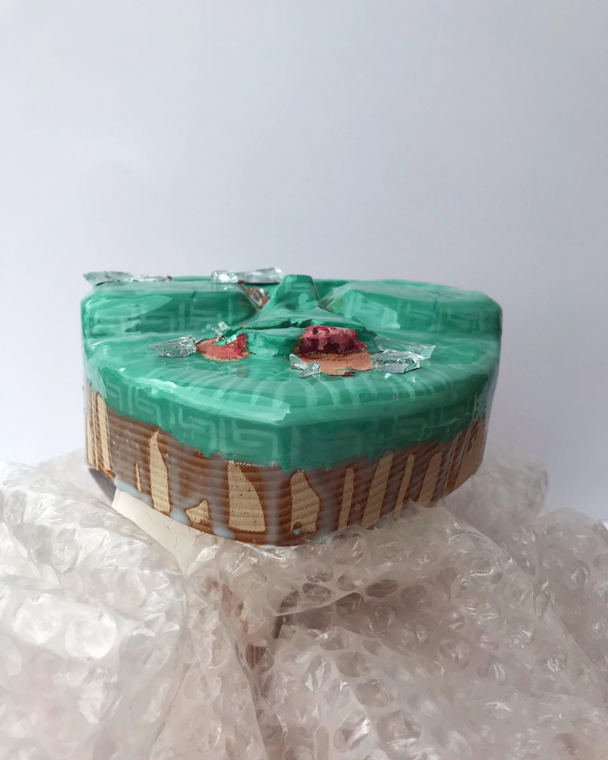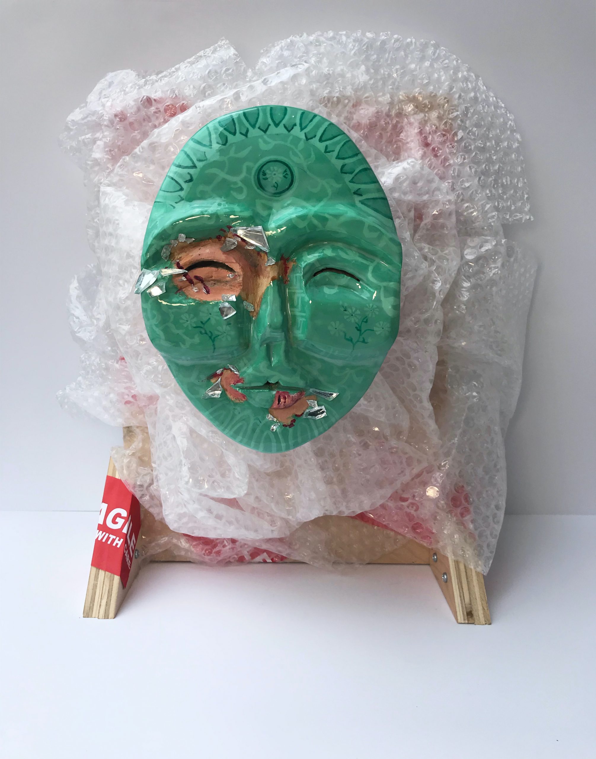 The mask I designed reflects my Korean nationality. It represents the mask that women constantly wear to survive in a patriarchal society, an allusion of being weak, fragile, submissive, happy, and a beautiful object. The base of the mask is made out of wood and the general form was inspired by the Korean traditional concubine theater mask. After, it was painted over to look like Korea’s traditional pottery where the detailing was taken from the ancient time period. To increase the illusion of celadon, I used raisin to create a glossy coating. The illusion of the celadon pottery is only a thin layer of the mask. The mask is mostly left as wood to show a false-front of the mask being grand and promising false freedom. The broken mirror pieces and the painted blood is to show that women are not made to live such a life. Once one chooses to wear this mask, it will end up destroying the human within her. I chose to leave some of the bare wood around the eyes and mouth to show that the human in her will never be fully removed; for eyes will see the unfairness and her mouth will scream for help.