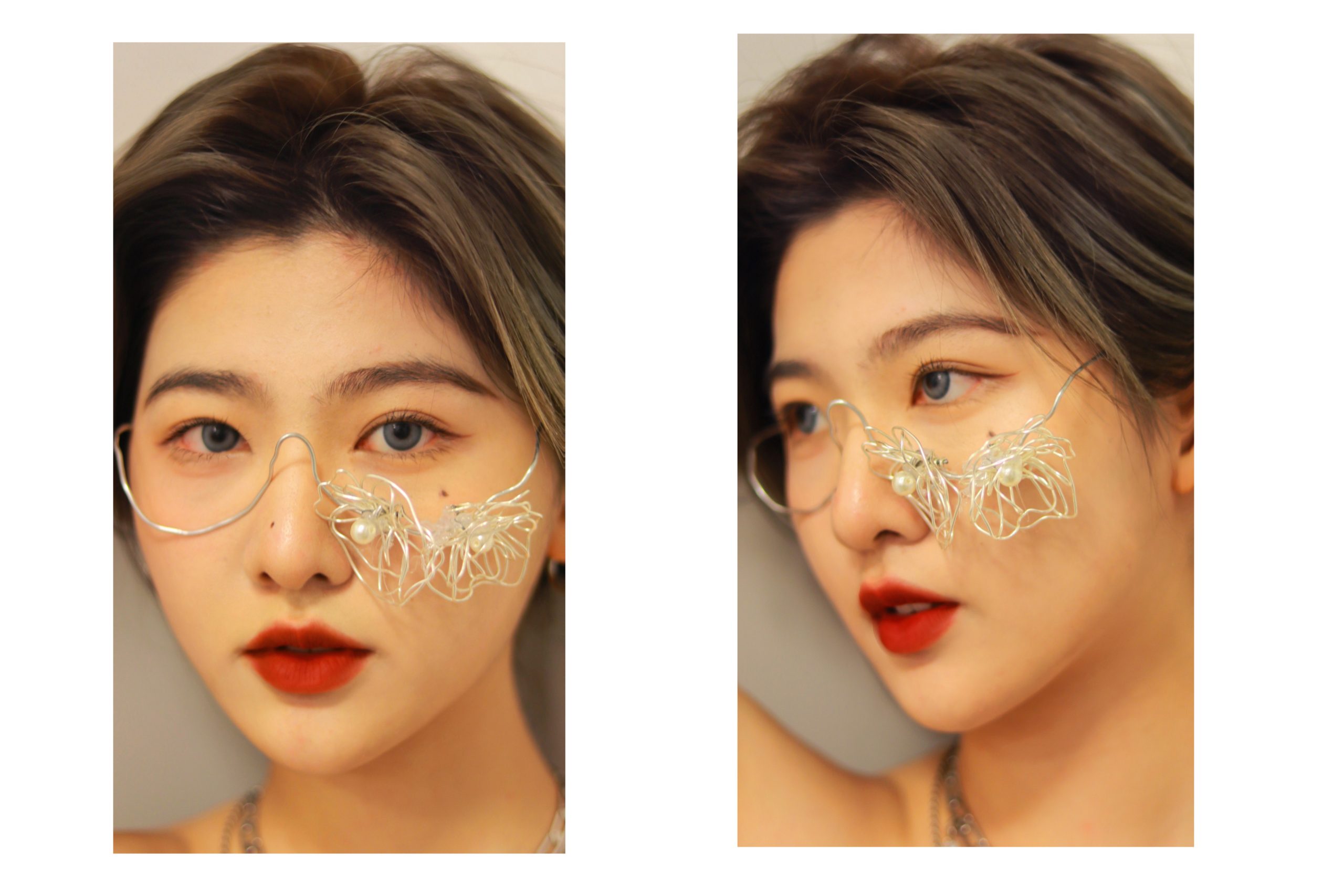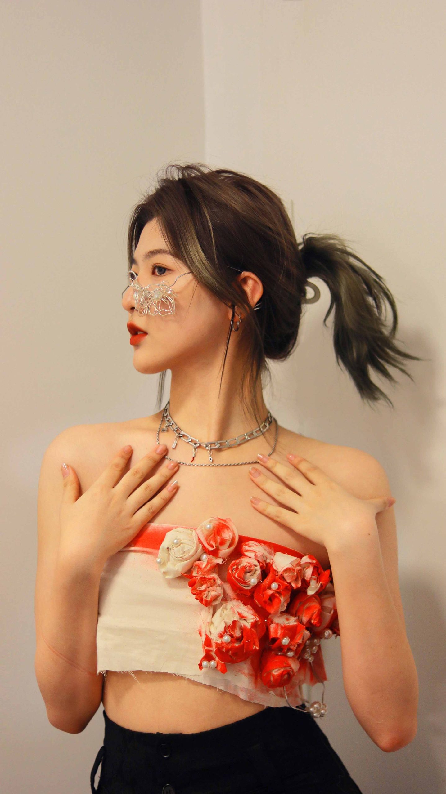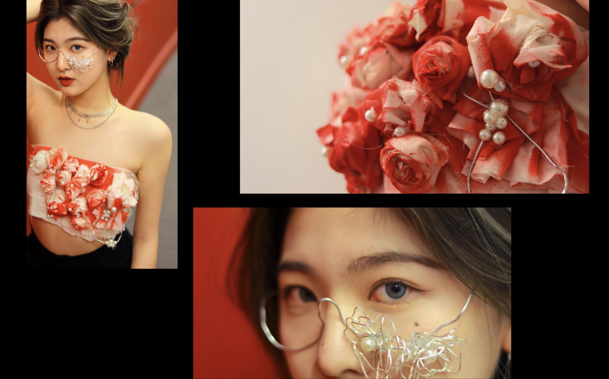 My theme is jealousy. I will design two pieces: the short top and glasses. I choose white and red because jealousy is a common emotion, so I prefer white, which is common in nature. In China, we often use “red eyes” to express jealousy, and red has a strong emotional effect of choosing red for the short top. At the same time, roses will appear in many of my wearable artworks because roses usually represent beautiful but dangerous things. On the one hand, jealousy will encourage people to make progress, but on the other hand, it will also bring destructive emotions to people.