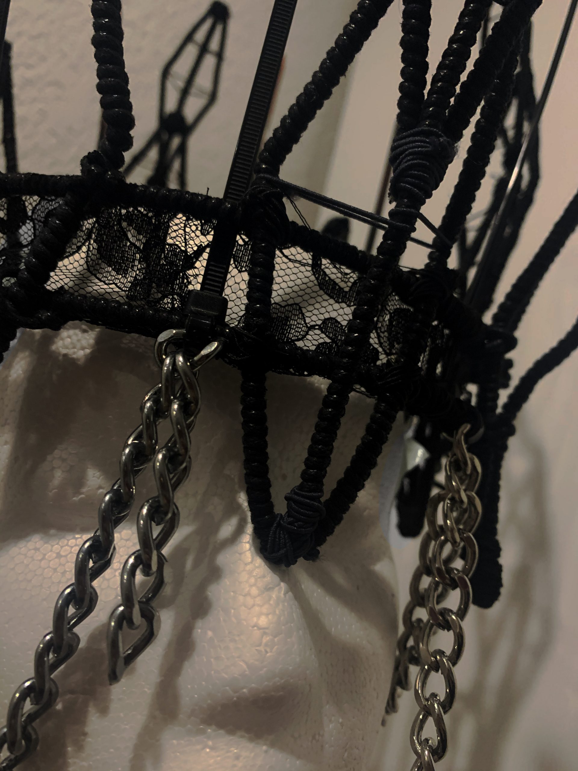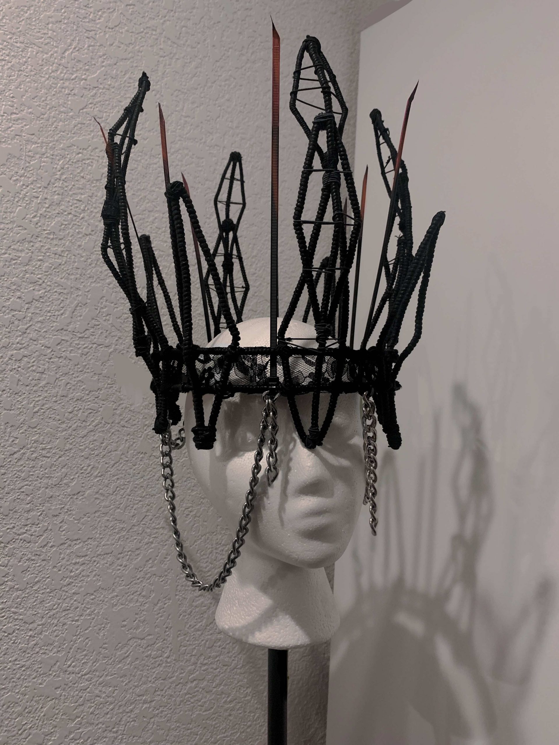 My goal with this piece was to emphasize the idea of deception and how deception surrounds us as a society. I included motifs such as black lace and strong cord to represent both strength and elegance throughout my piece. I chose to wrap every piece of wire with cord to create a more subtle shine throughout the crown.