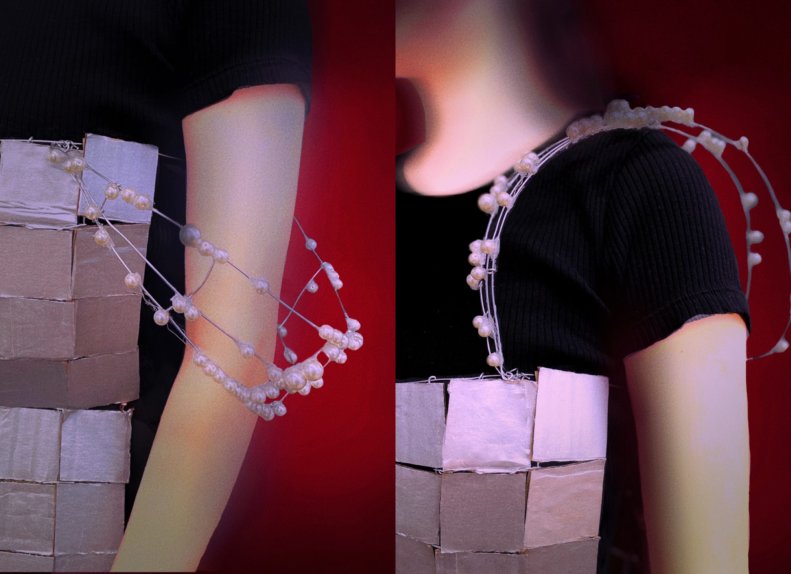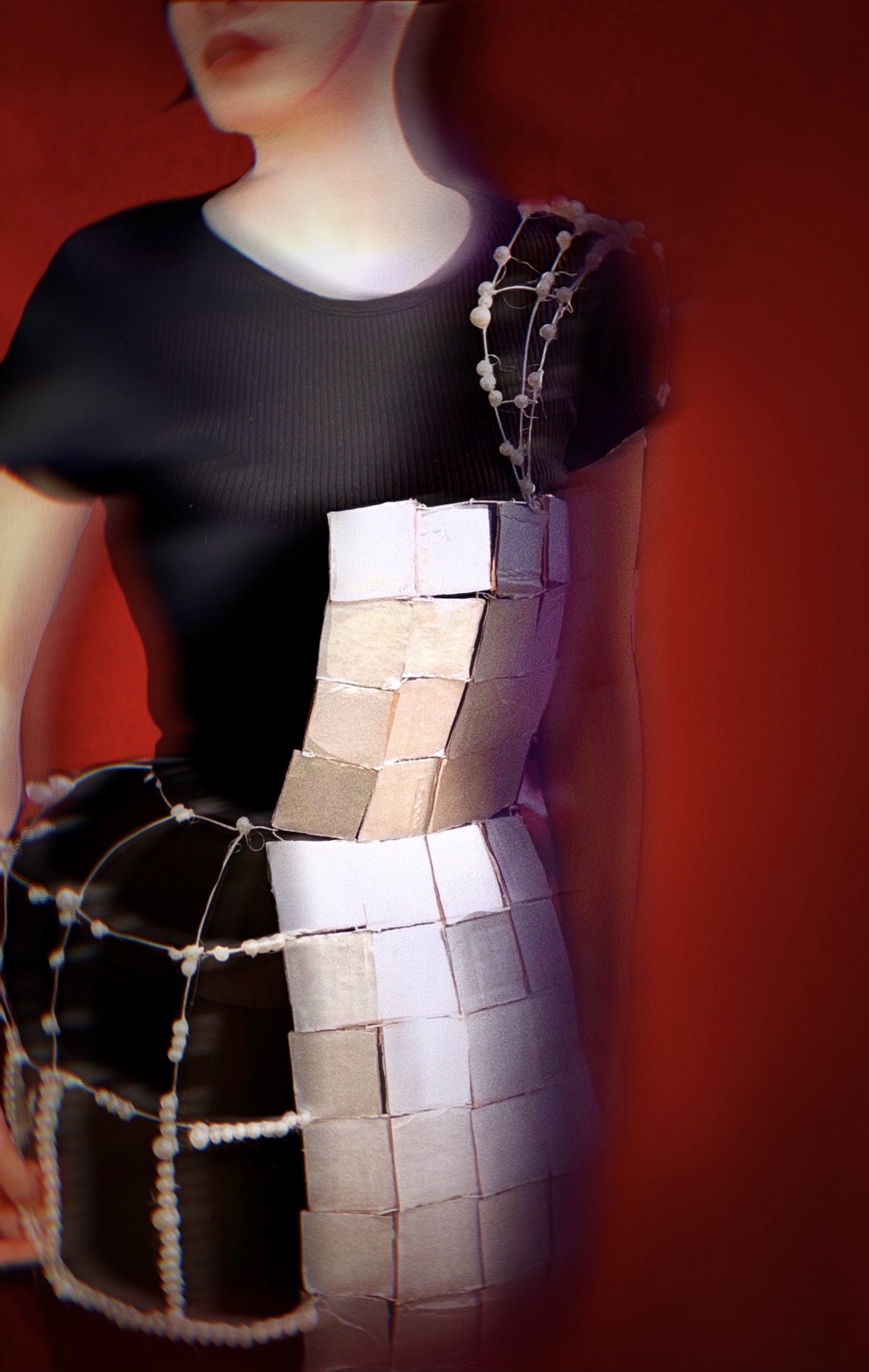 Prompt: This project gets inspiration from my partner through interviewing. The topic is called “Resilient”, and I think vitality under heavy pressure is also the meaning of resilience. What is more, it reminds my partner of Wu kong, the main character in the Chinese fantasy novel “Journey to the West”. By researching, I used the paperboard with the silver color, wire lines, and some pearls as the materials and use the Chinese traditional craft – the method of dot cui to express the Characteristics of Wu Kong as a soldier.
