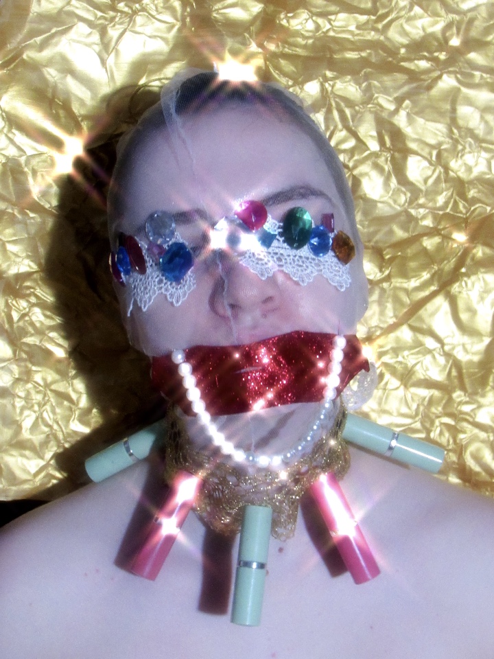 This mask is about the extreme beauty standards society puts on women and how I as a women am affected by it. I had to use objects I chose for a previous project and connect them to myself in some way, that is where the lipsticks around my neck come in. I wanted to make them into a choker in order to symbolize that such beauty standards can be suffocating at some point. I hand sewed the entire piece myself and set up the photo shoot/edited the photos with the help of my friend. I wanted to combine my usual art style (somewhat pop-art and contemporary) with a more lavish almost victorian art style. In the beginning I was planning on making the piece more realistic however as I went I decided on making it more abstract. I was hoping to make it a bit unsettling to look at because that’s how such standards make me feel, and I feel like I achieved that. In the end I am very proud of how it came out.