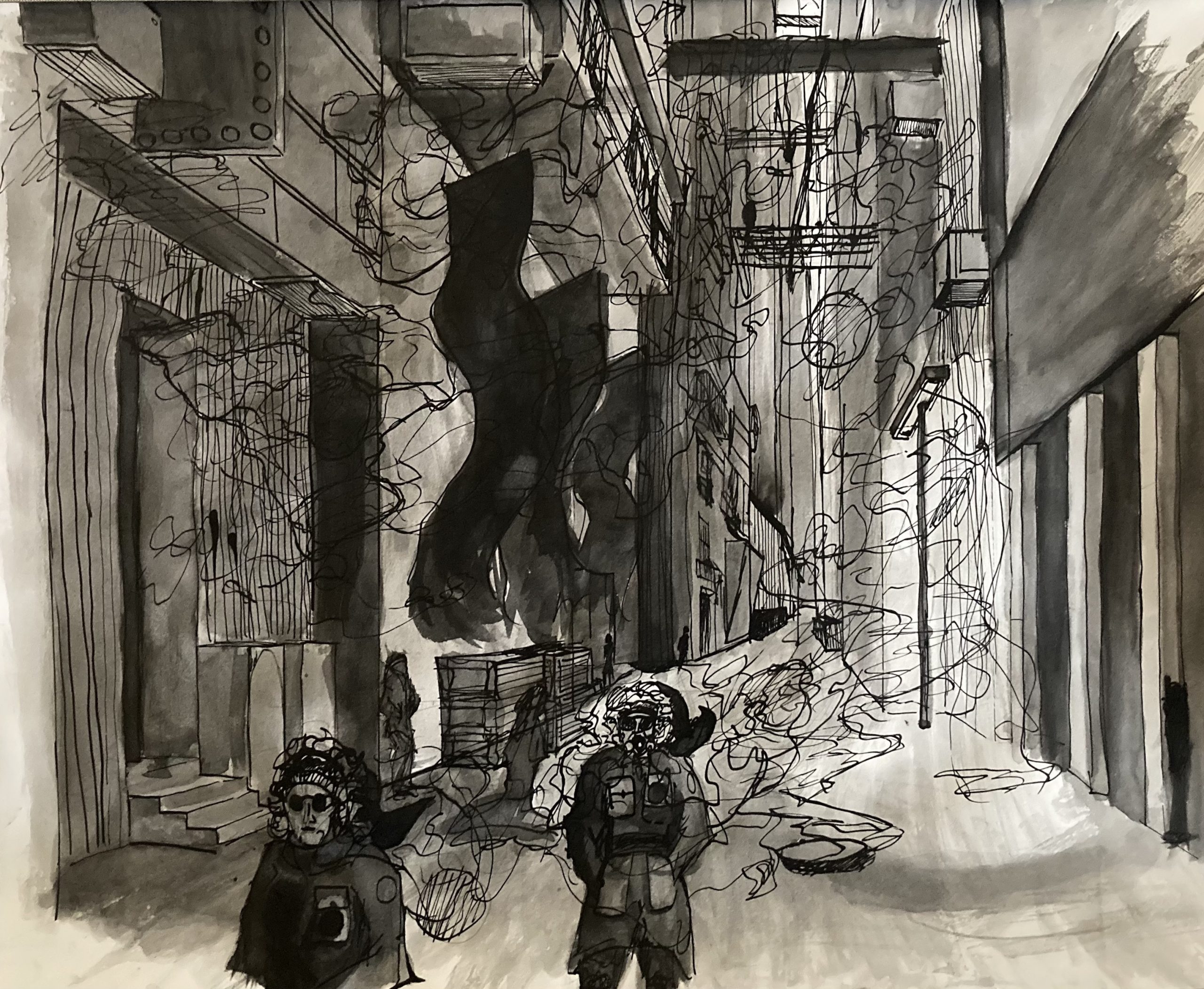 The piece is a one-point perspective of a dystopian cityscape. The figures in the front are characters I have been experimenting with for a few months. I developed their look and outfit by studying early mountaineering and skiing gear. I then took my favorite elements from the gear and created a sci-fi explorer character which I used in some earlier pieces. The assignment we had been given in Drawing and Imaging was to create an environment that allowed us to demonstrate the skills we had learned in the class. I wanted to create a coherent environment that allowed me to use perspective, portrait and figure drawing, and constructing shapes. The dystopian city-scape seemed to be the best way to do this.