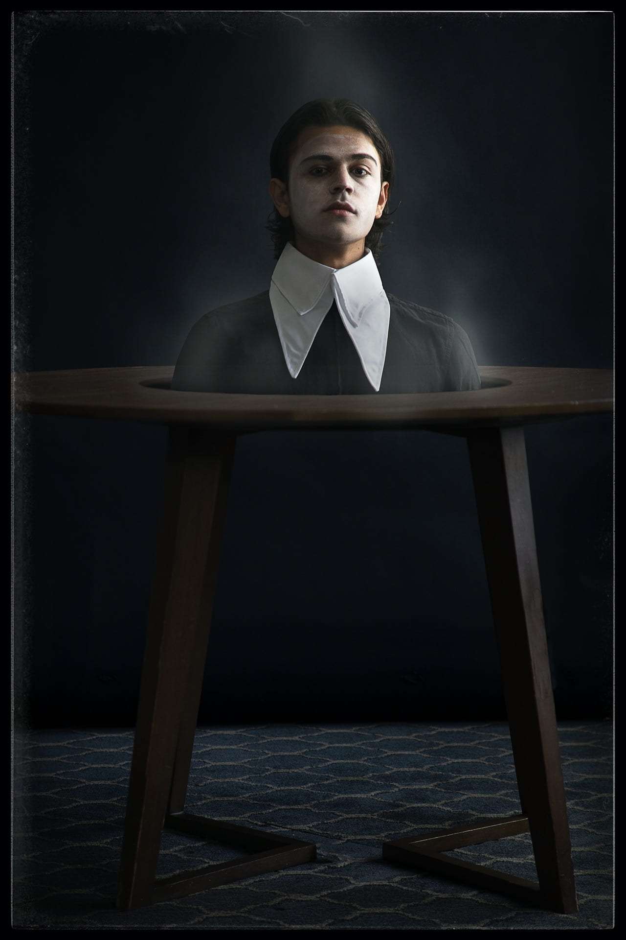 In this project, I merged myself with the magician archetype proposed by Carl Jung. I mainly took inspiration from the vernacular of magic and Houdini. I rented the black background and looked for a place where the atmosphere suited the photo. The rag and the circular table were two crucial elements in the photo. The costume was so too and was influenced by gothic ideas and by Harry Houdini’s shirts. The smoke added to the mystery of the photo and was done manually in Photoshop.
