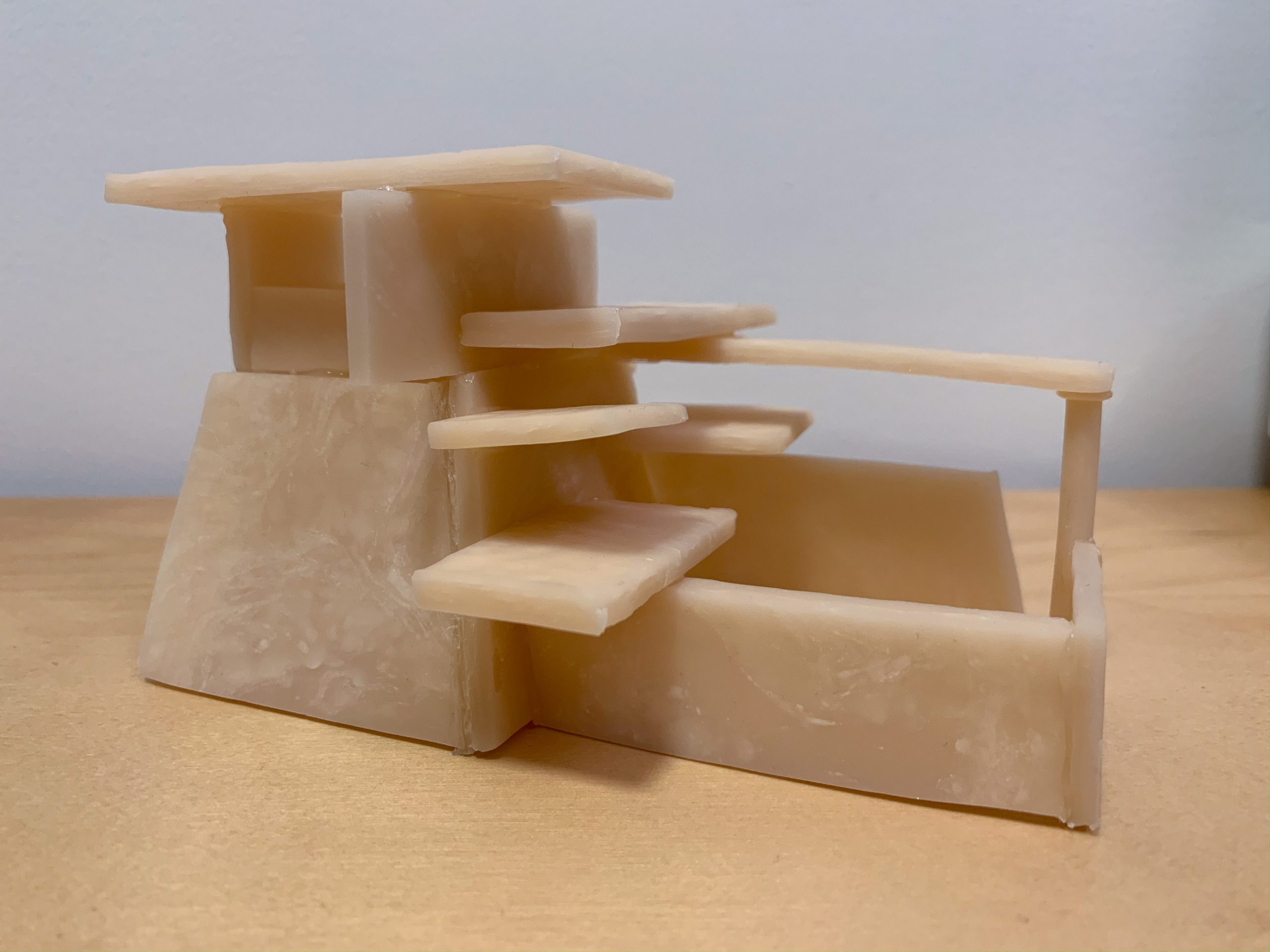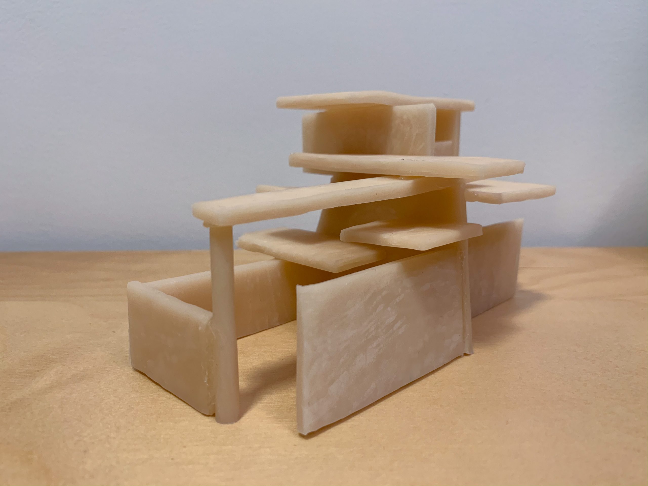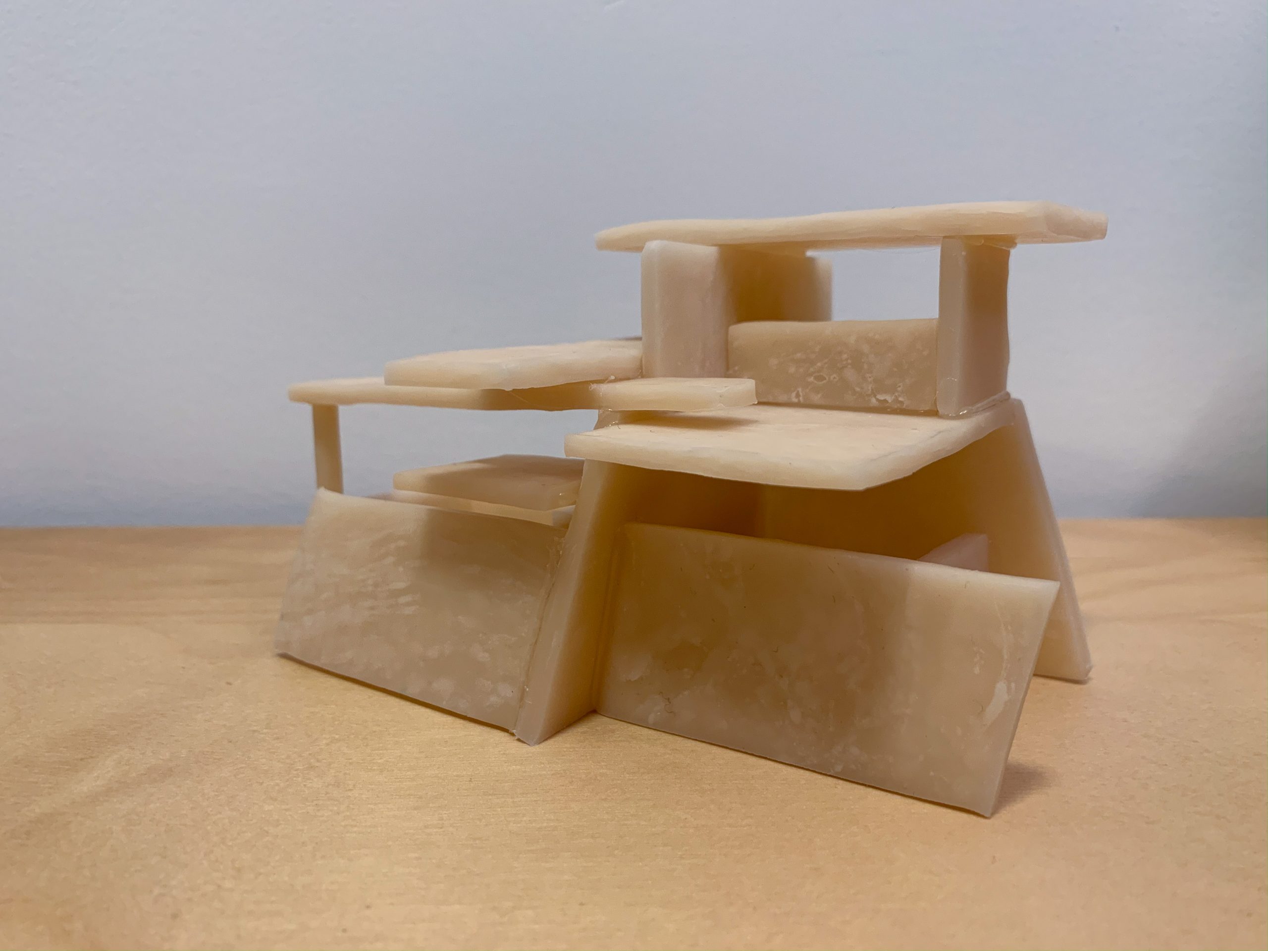 Inspired by the style of Frank Lloyd Wright and the mid-century modern architectural style of the 70s, this sculpture is an abstract interpretation of the planar forms found throughout these building styles. It contains forms found in Wright’s iconic building “Fallingwater”, which contains many rectangular pieces stacked on top of one another. In order to create the rigid, flat nature of the panels found in this building style, the clay pieces were baked, trimmed, and assembled to allow for straighter lines and modular forms. The floating pieces create movement while maintaining the airy, negative space in between the layers of clay.