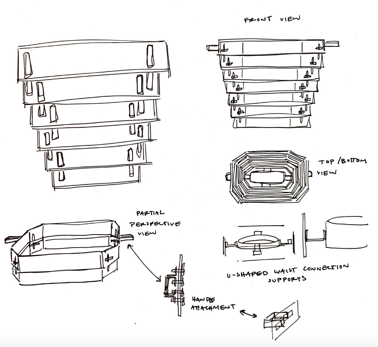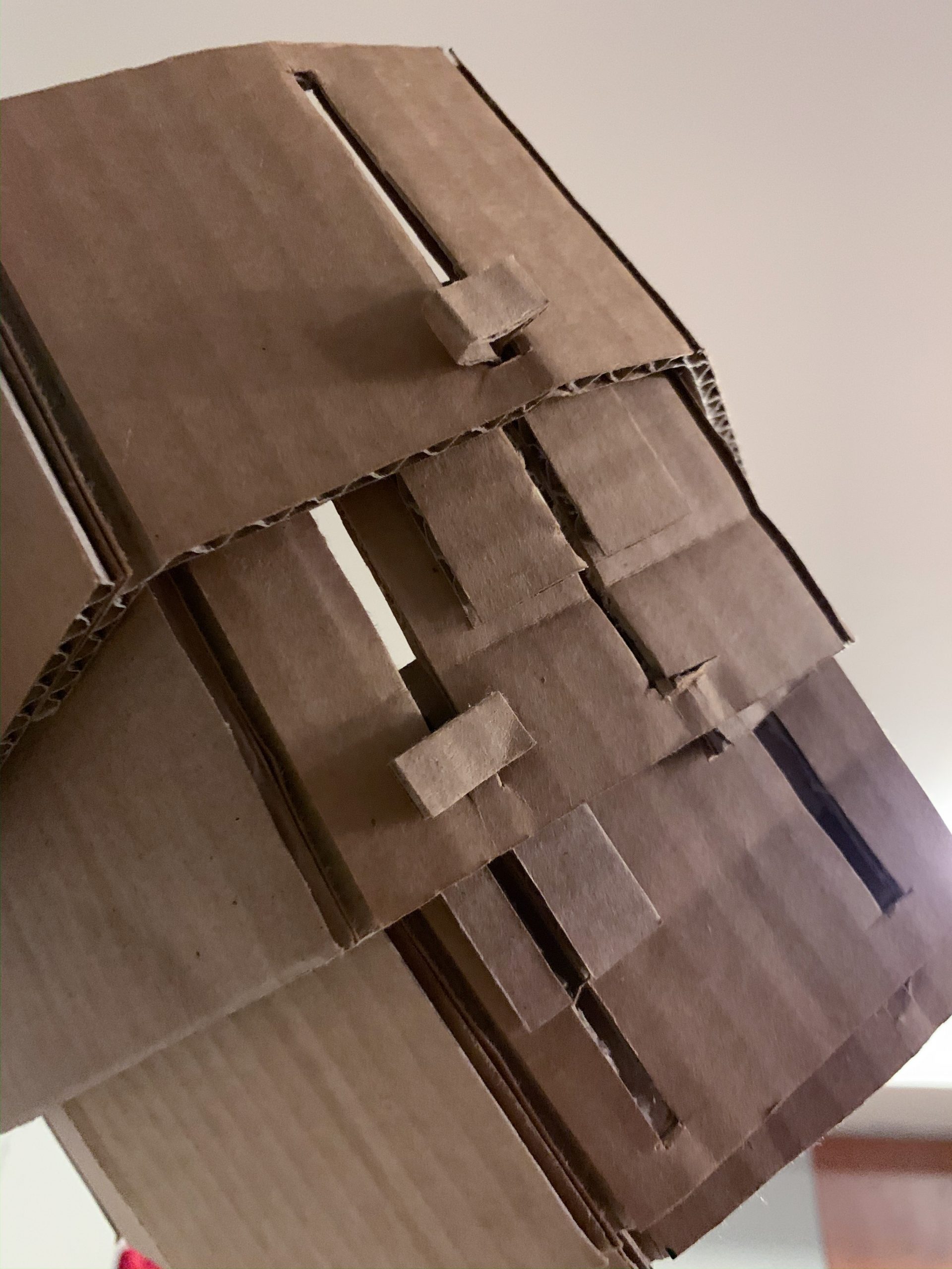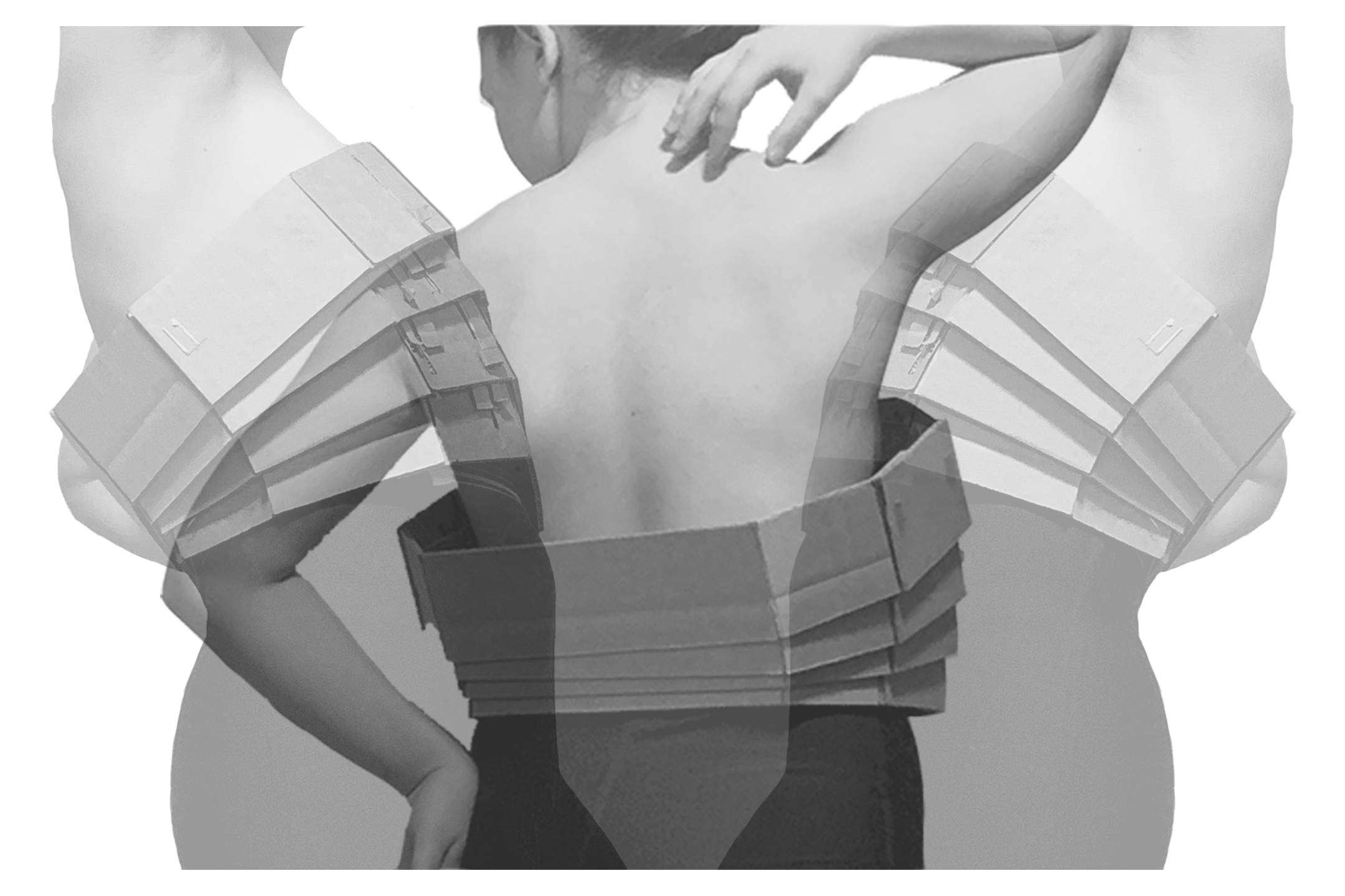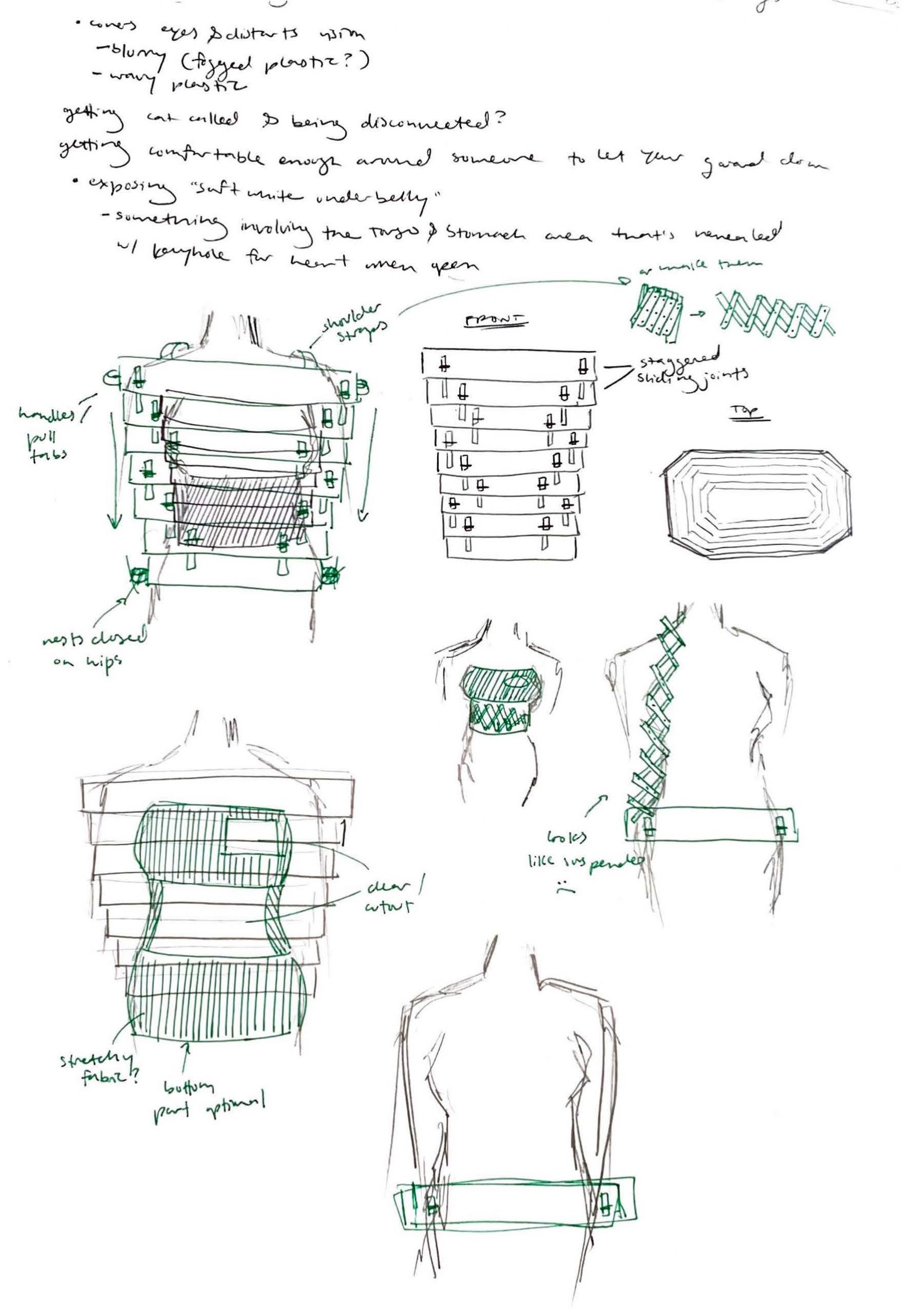 This object is the physical representation letting your guard down, to expose the soft white underbelly when you become comfortable around. Your heart, and all essential organs in your torso become exposed when the object collapses. It’s built so that the wearer can move the top piece down, collapsing the structure and revealing the previously covered torso. I was inspired by the way an armadillo’s “armor” appears, as it seems more organic while still being rigid. It’s not the most comfortable to wear, alluding to the discomfort and effort that it takes to maintain a more protected and shielded self. When it’s collapsed, it’s more comfortable and easier to move while wearing, which is similar to the experience of getting more comfortable and vulnerable around somebody. Both visually and physically, it simulates this experience of gaining intimacy with another person, and oneself.
